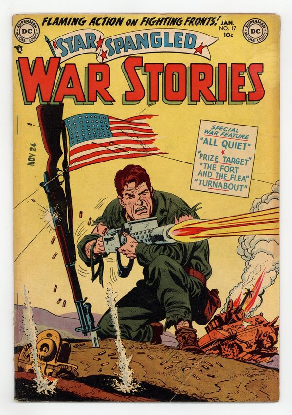 Cover art by Irv Novick. Prize Target, script by France Herron, pencils by Curt Swan, inks by Ray Burnley. All Quiet, script by William Woolfolk, pencils by Gene Colan, inks by Joe Giella. Turnabout, script by William Woolfolk, pencils by Ross Andru, inks by Mike Esposito. The Fort and the Flea, script by France Herron, art by Jim McArdle. Private Pete filler page by Henry Boltinoff. From Blueprints to Battlefield humor story. 36 Pages, Full Color. Cover price $0.10.