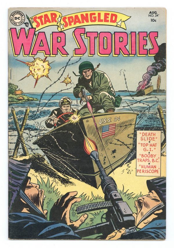 Cover art by Irv Novick. Death Slide, script by Robert Kanigher, art by Irv Novick. The Top Hat G.I., script by David V. Reed, pencils by Sam Burlockoff, inks by Robert Stuart. Booby Traps, B.C., script by David Kahn, art by Eugene Hughes. The Human Periscope, script by France Herron, art by Jerry Grandenetti. Humor one-page story starring General Little by Irwin Hansen. Humor one-page story featuring Private Diary by Irwin Hansen. 36 Pages, Full Color. Cover price $0.10.