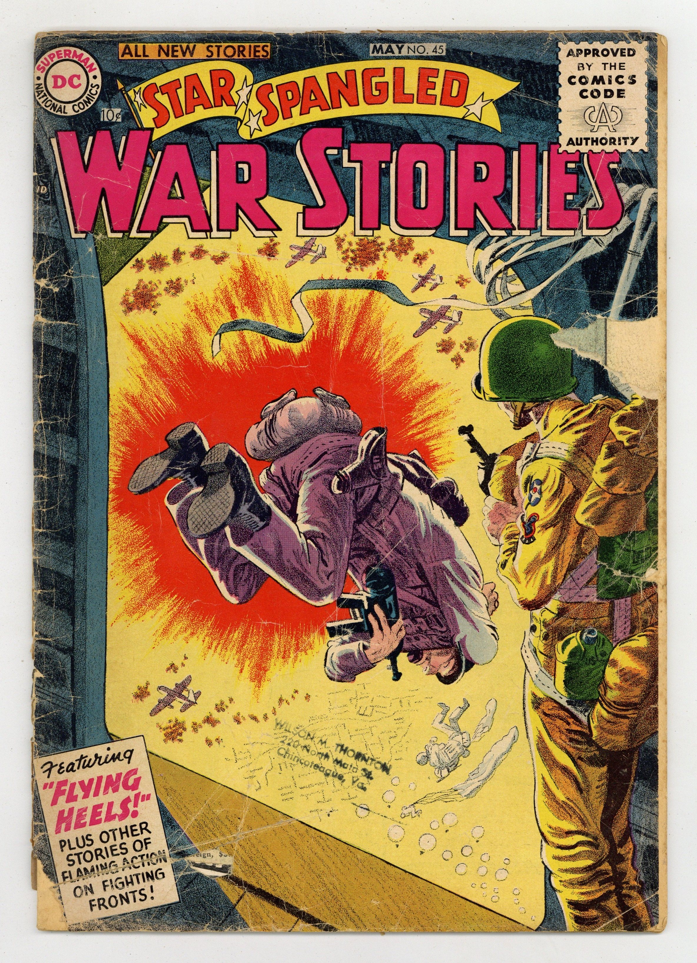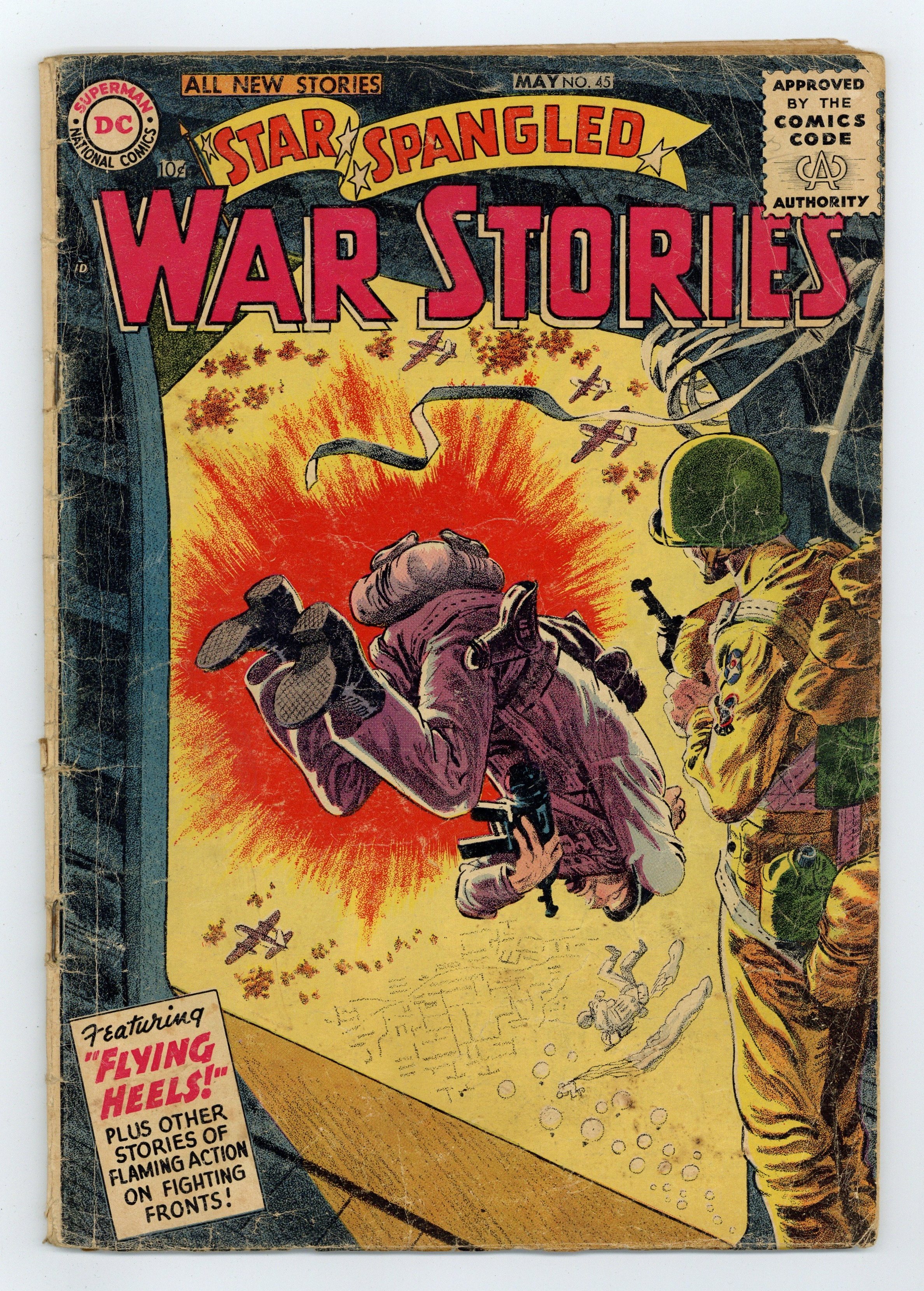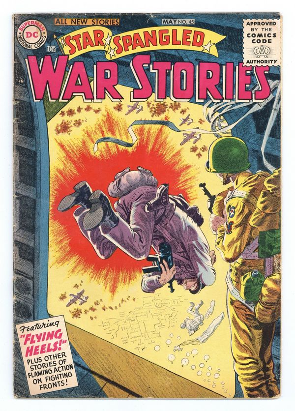 Cover art by Jerry Grandenetti. Flying Heels, script by Robert Kanigher, pencils by Ross Andru, inks by Mike Esposito. Bulls-Eye Correspondent, script by Leo Isaacs, art by Joe Kubert. Jive Tank, script by Edward France Herron, art by Arthur Peddy. Battle Cake, script by Bill Finger, pencils by Ross Andru, inks by Mike Esposito. Filler page featuring This Ain't the Army by Henry Boltinoff. 36 Pages, Full Color. Cover price $0.10.