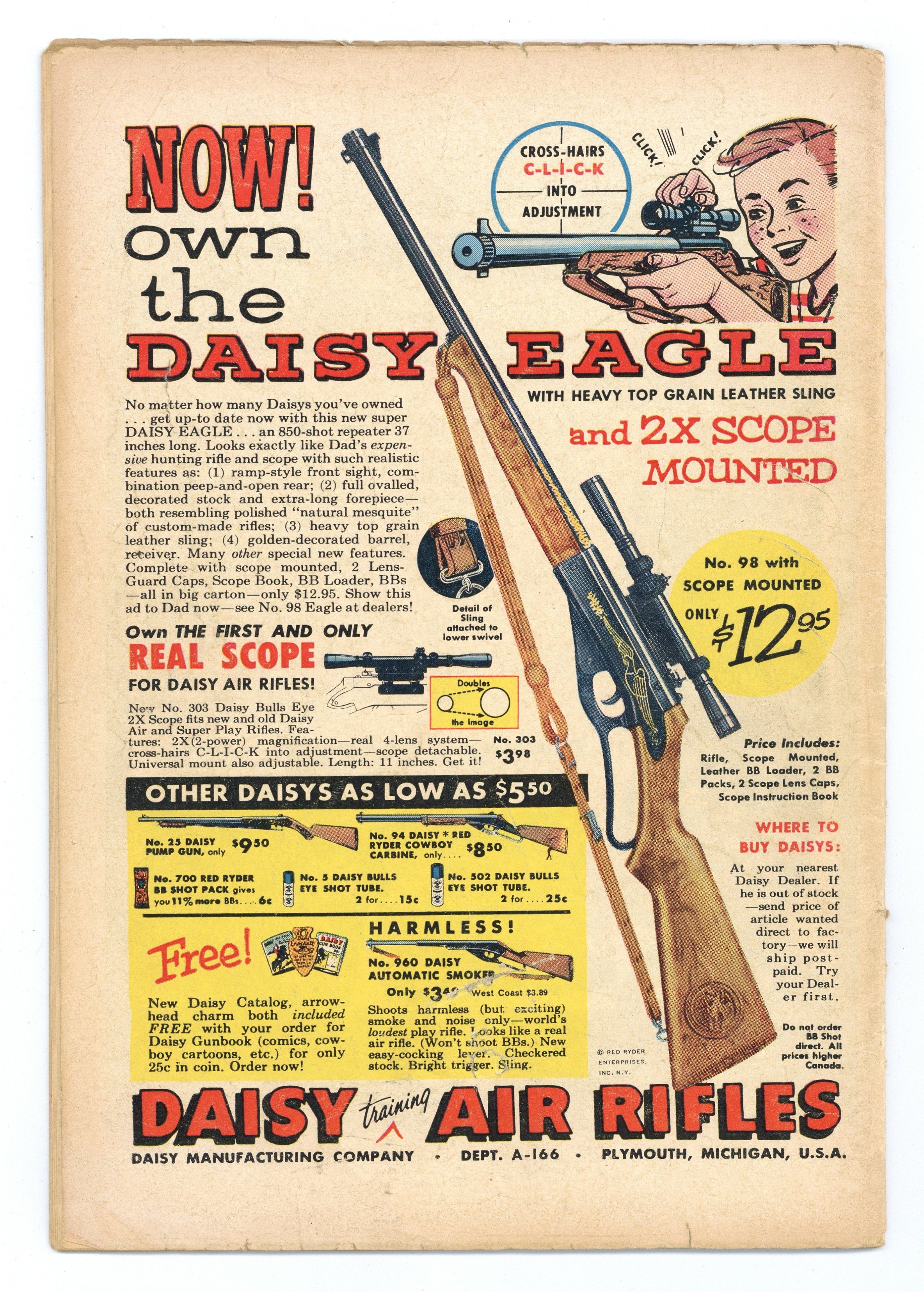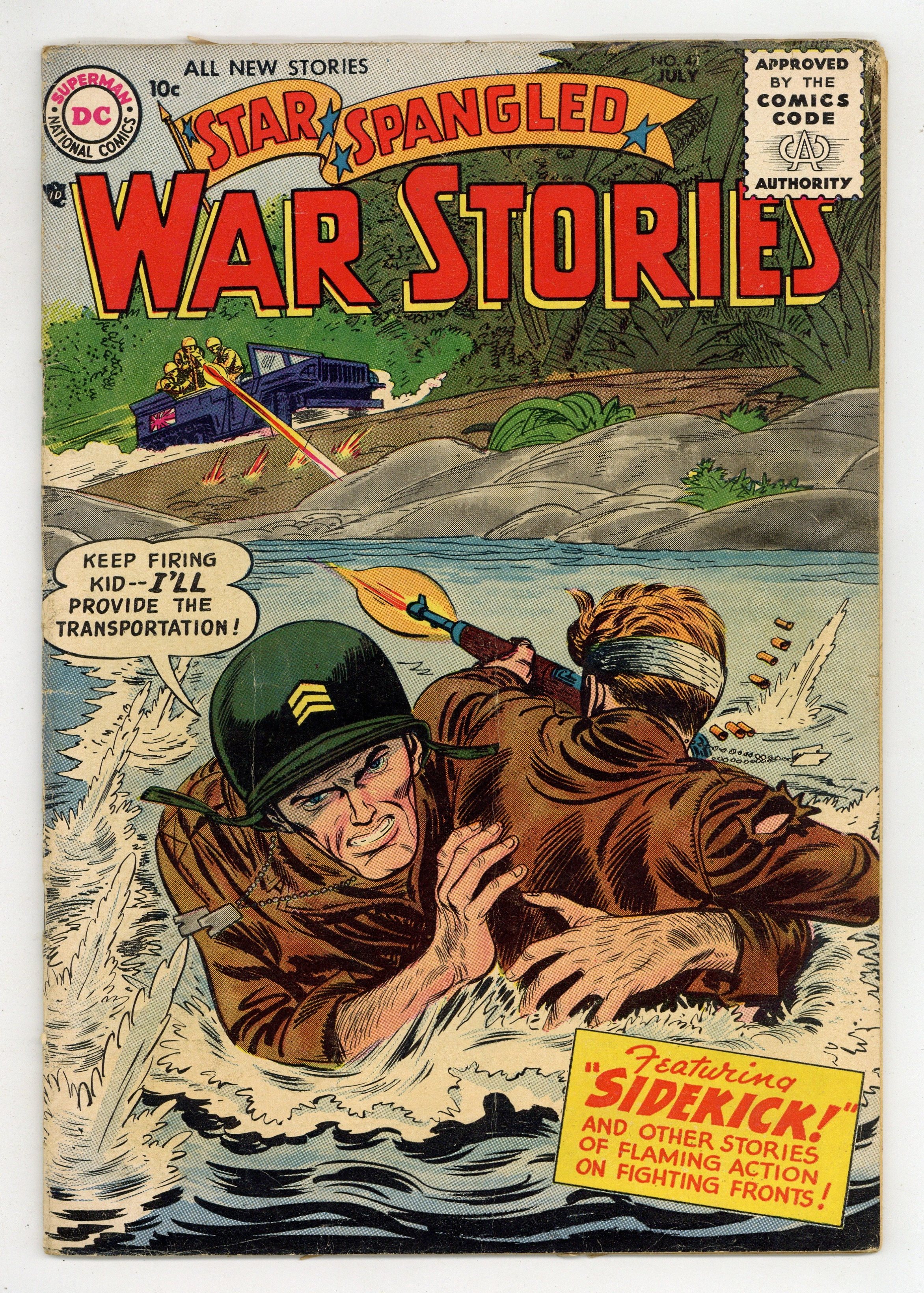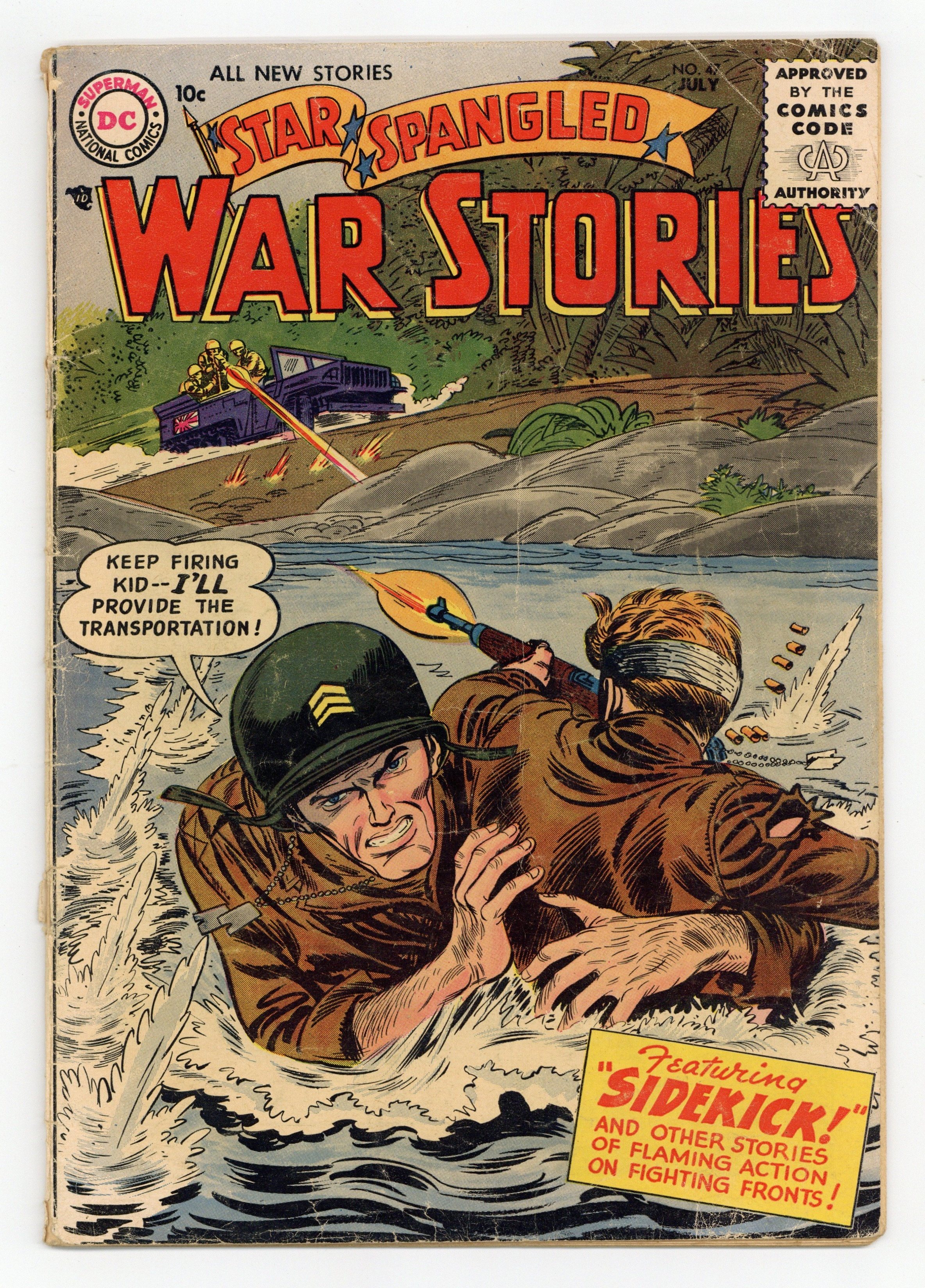 $40.00Cover art by Jerry Grandenetti. Sidekick, script by Robert Kanigher, art by Russ Heath. The Ghost Raider, script by Bob Haney, art by Irv Novick. Bull's Eye Letter, script by Bob Haney, pencils by Ross Andru, inks by Mike Esposito. Battle Parade, script by Bob Haney, art by Jerry Grandenetti. Humor page starring Private Pete by Irwin Hansen. 36 Pages, Full Color. Cover price $0.10.