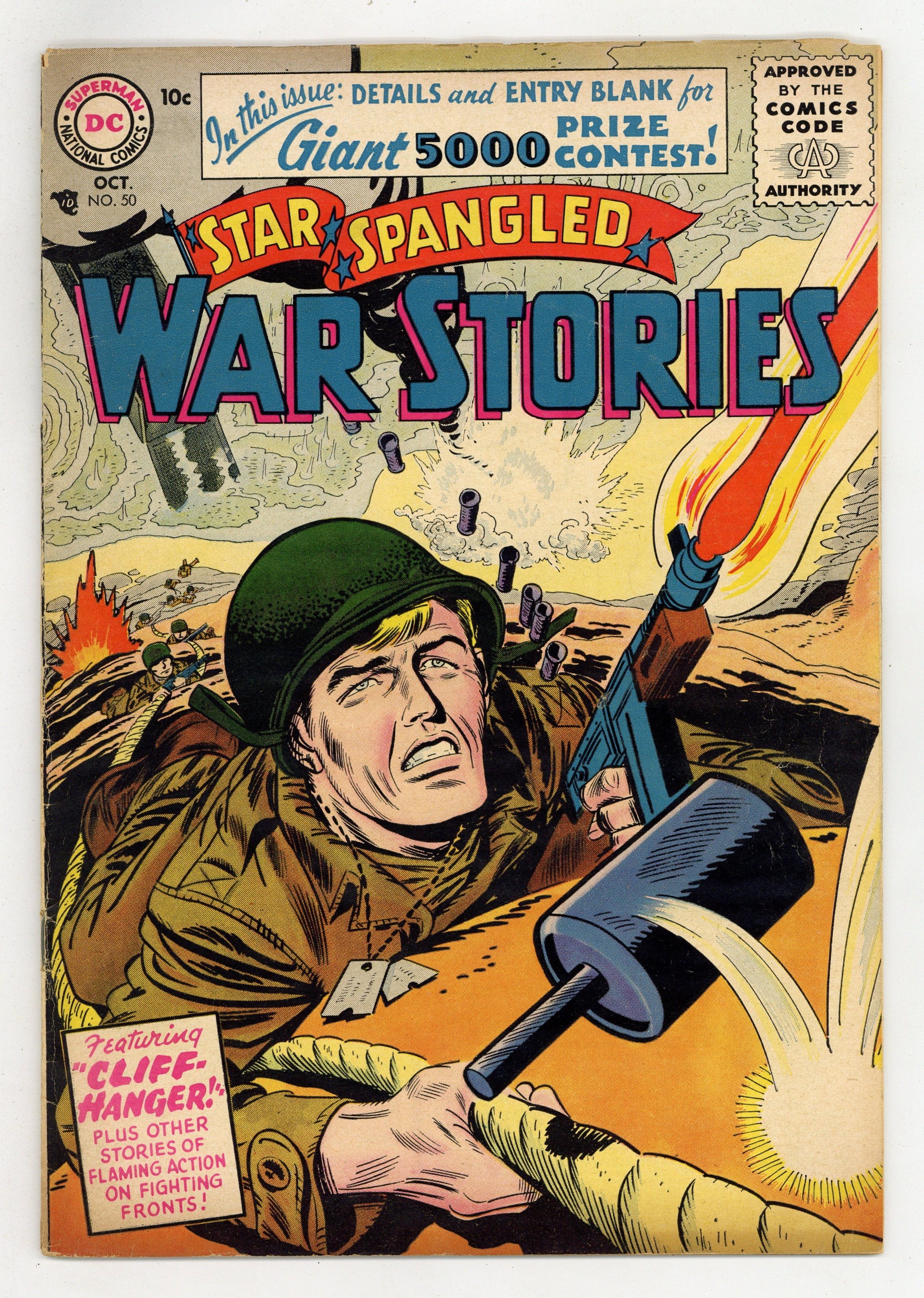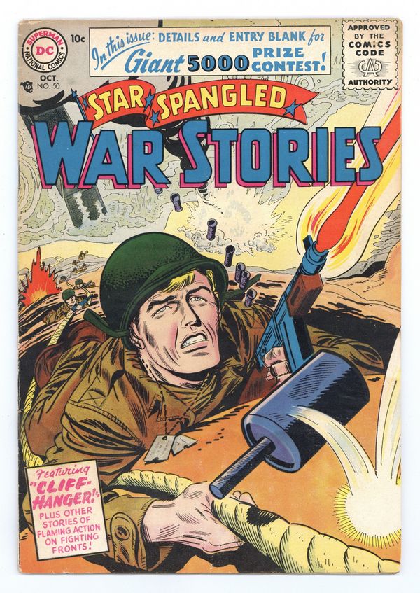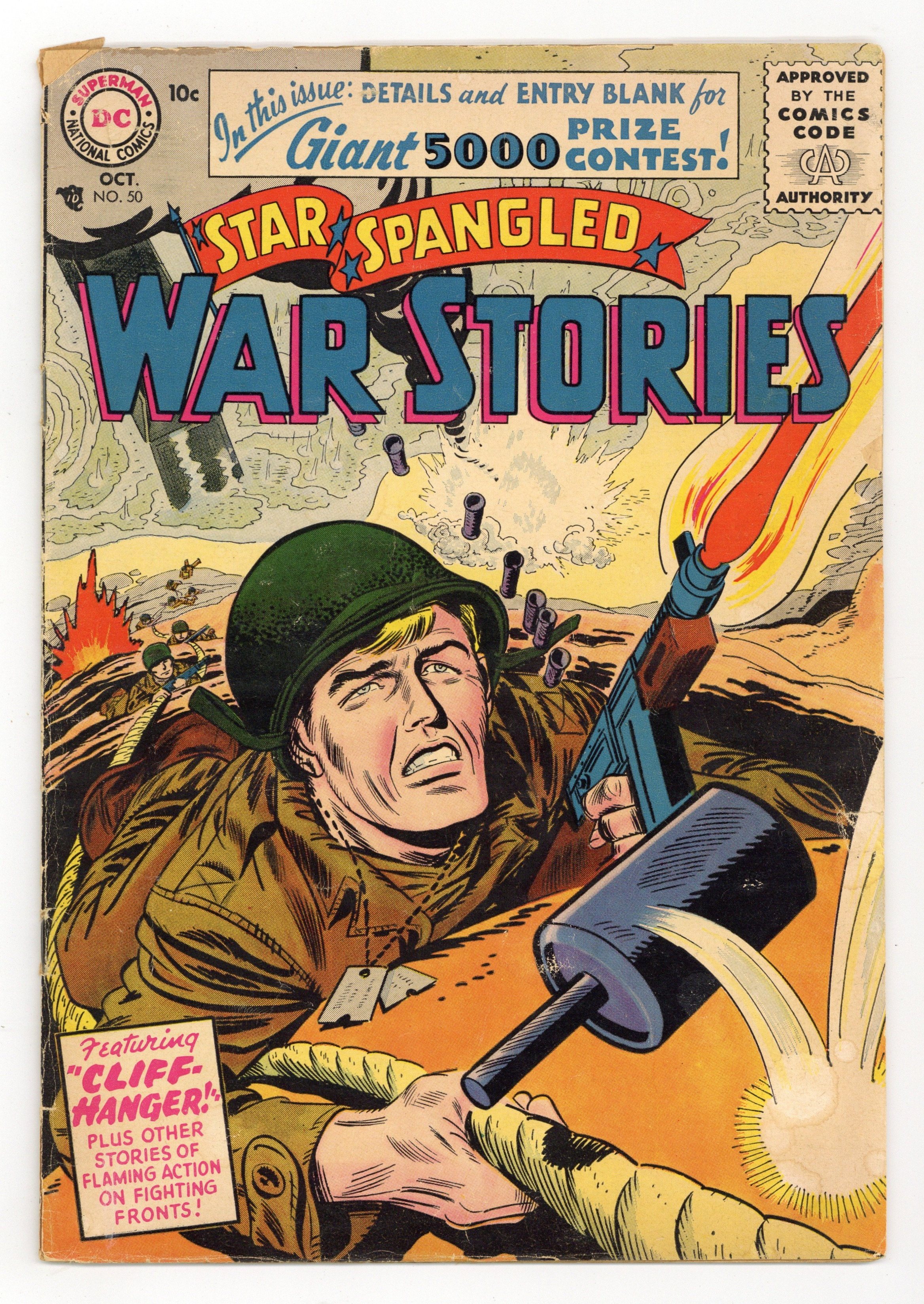 Cover art by Jerry Grandenetti. Combat Dust, script by Bob Haney, art by Bob Brown. Convoy Watchman, script by Bob Haney, pencils by Ross Andru, inks by Mike Esposito. Cliff-Hanger!, script by Robert Kanigher, pencils by Ross Andru, inks by Mike Esposito. Sub-Hunter, script by Bob Haney, art by Jerry Grandenetti. Khaki-Yaks humor page by Henry Boltinoff. 36 Pages, Full Color. Cover price $0.10.