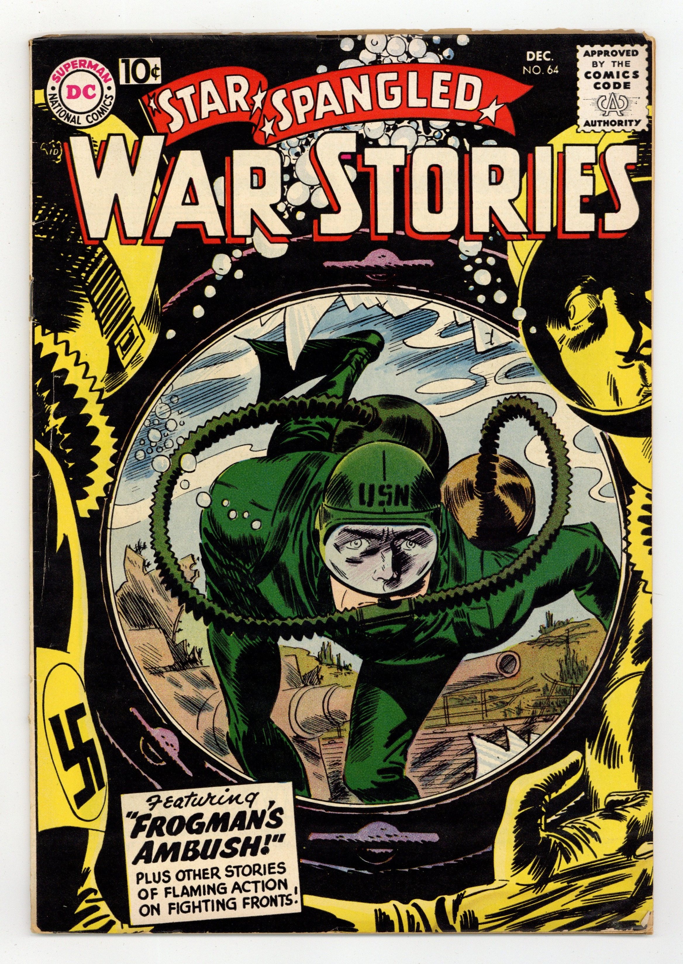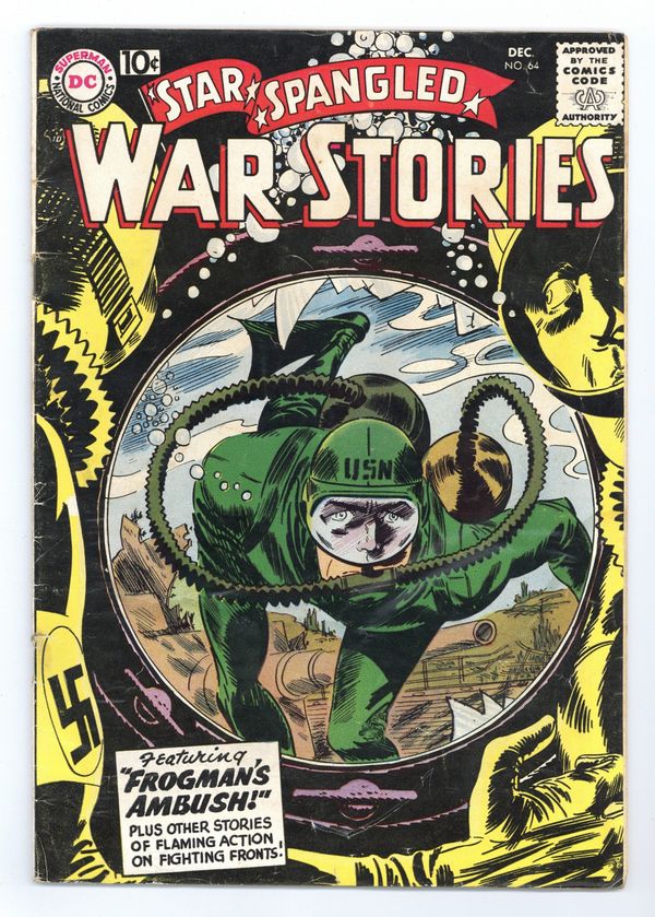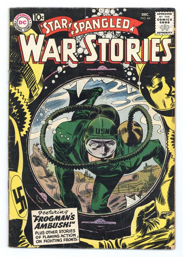 Cover art by Jerry Grandenetti. Frogman Ambush, script by Bob Haney, pencils by Ross Andru, inks by Mike Esposito. Aviation Almanac fact page script and pencils by Morris Waldinger, inks by Tom Nicolisi. So Long to Easy Company, script by France Herron, pencils by Carmine Infantino, inks by Robert Stuart. Deeds Not Words fact page, script and pencils by Morris Waldinger, inks by Tom Nicolisi. One Man Platoon, script by Bob Haney, art by Mort Drucker. Private Pete humor page by Henry Boltinoff. Halfway Escort, script by France Herron, art by Russ Heath. 36 Pages, Full Color.