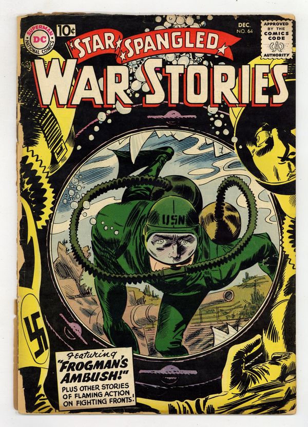 Cover art by Jerry Grandenetti. Frogman Ambush, script by Bob Haney, pencils by Ross Andru, inks by Mike Esposito. Aviation Almanac fact page script and pencils by Morris Waldinger, inks by Tom Nicolisi. So Long to Easy Company, script by France Herron, pencils by Carmine Infantino, inks by Robert Stuart. Deeds Not Words fact page, script and pencils by Morris Waldinger, inks by Tom Nicolisi. One Man Platoon, script by Bob Haney, art by Mort Drucker. Private Pete humor page by Henry Boltinoff. Halfway Escort, script by France Herron, art by Russ Heath. 36 Pages, Full Color. Cover price $0.10.