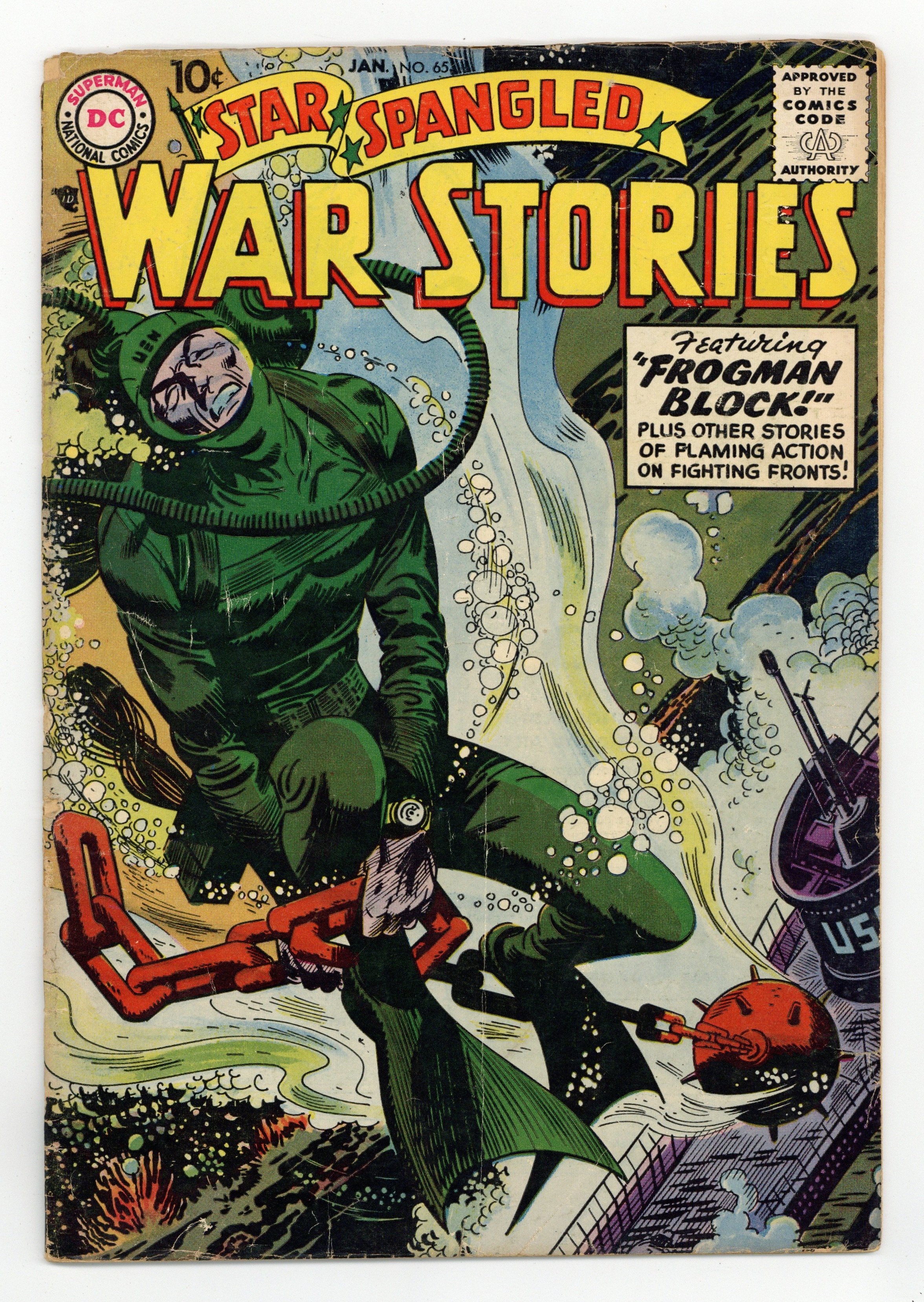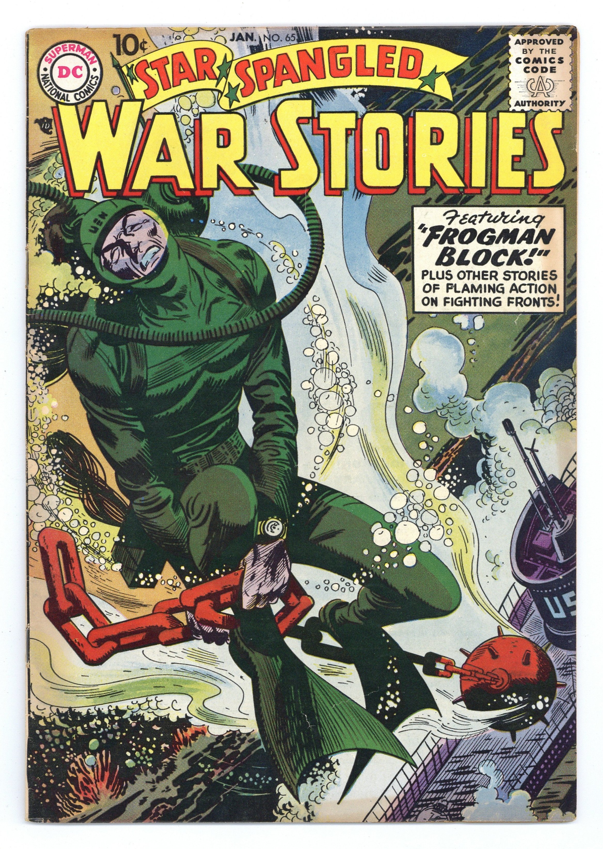 Cover art by Jerry Grandenetti. Frogman Block, script by Bob Haney, pencils by Ross Andru, inks by Mike Esposito. Foxhole Fever, script by Bob Haney, art by John Severin. G.I. Weather Bird, script by Bob Haney, art by Jack Abel. Postage Stamp Pilot, script by Bob Haney, art by Irv Novick. Navy Log fact page by Morris Waldinger. The Ivy Division, script and pencils by Morris Waldinger, inks by Tom Nicolisi. Khaki-Yaks humor page by Irwin Hansen. 36 Pages, Full Color. Cover price $0.10.