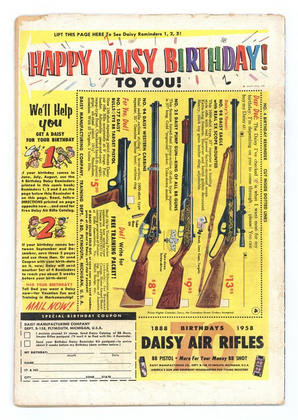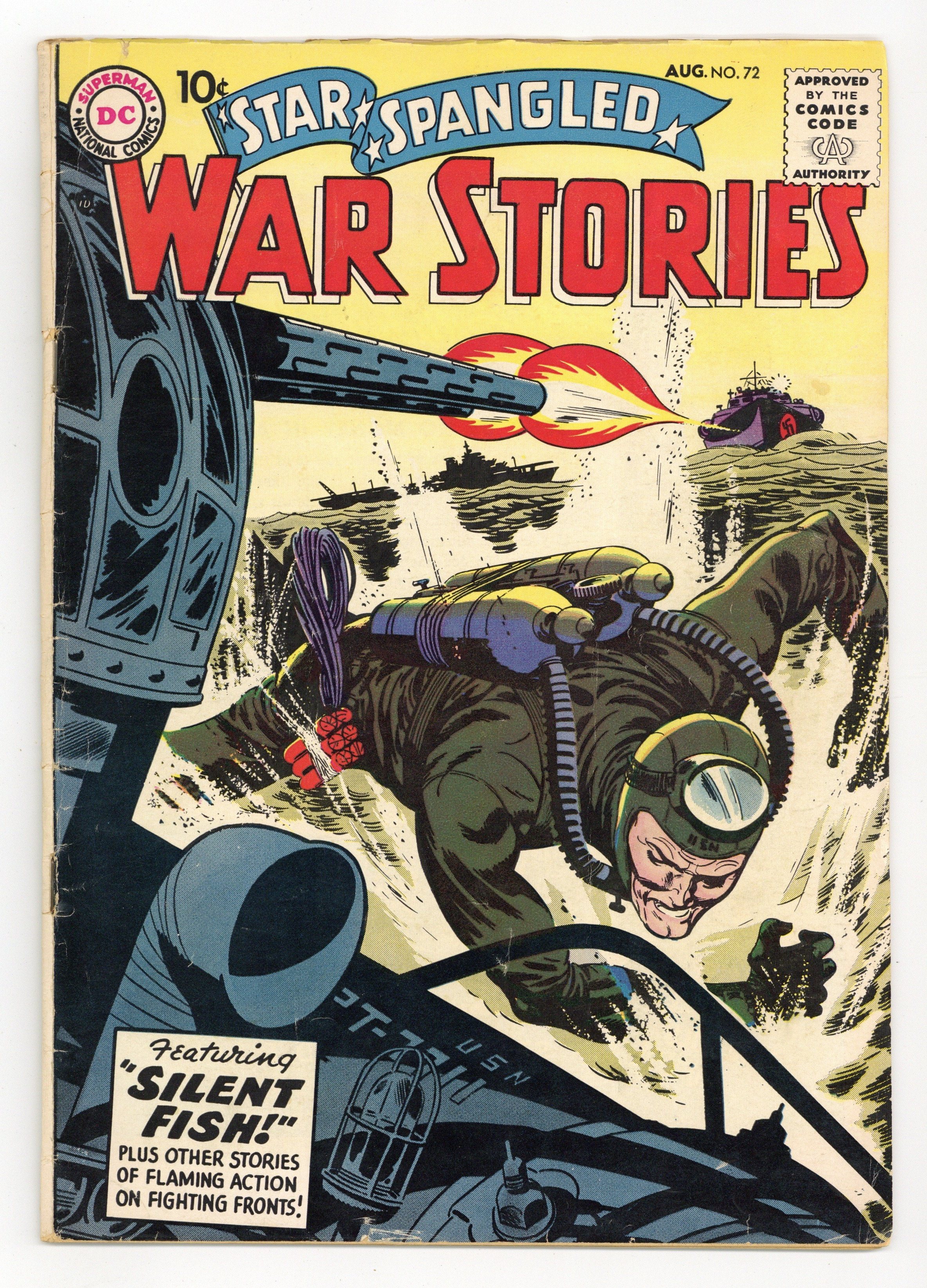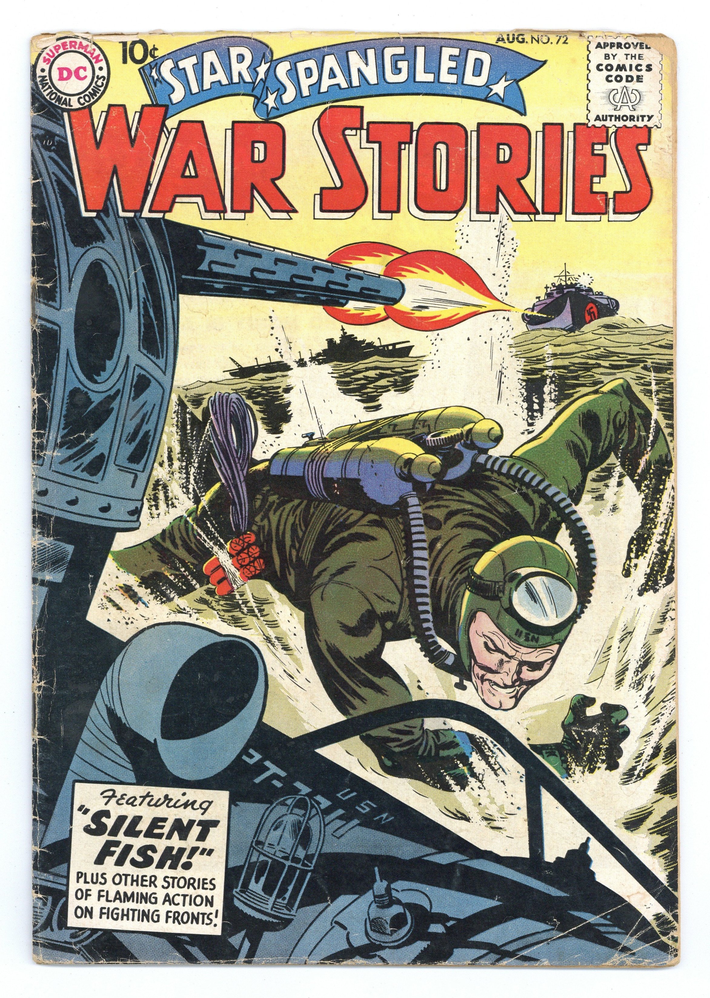 Cover art by Jerry Grandenetti. Silent Fish, script by Robert Kanigher, art by Russ Heath; A Frogman is helped by a shark when he is attacked by a Japanese Sub and Japanese Frogmen. Follow Me!... Battle Story of the 2nd Marine Division, script and pencils by Morris Waldinger, inks by Tom Nicolisi. The Big Hurdle!, script by Bob Haney, art by Jerry Grandenetti. War Wears White Gloves!, script by Bob Haney, art by Jack Abel. 36 Pages, Full Color. Cover price $0.10.
