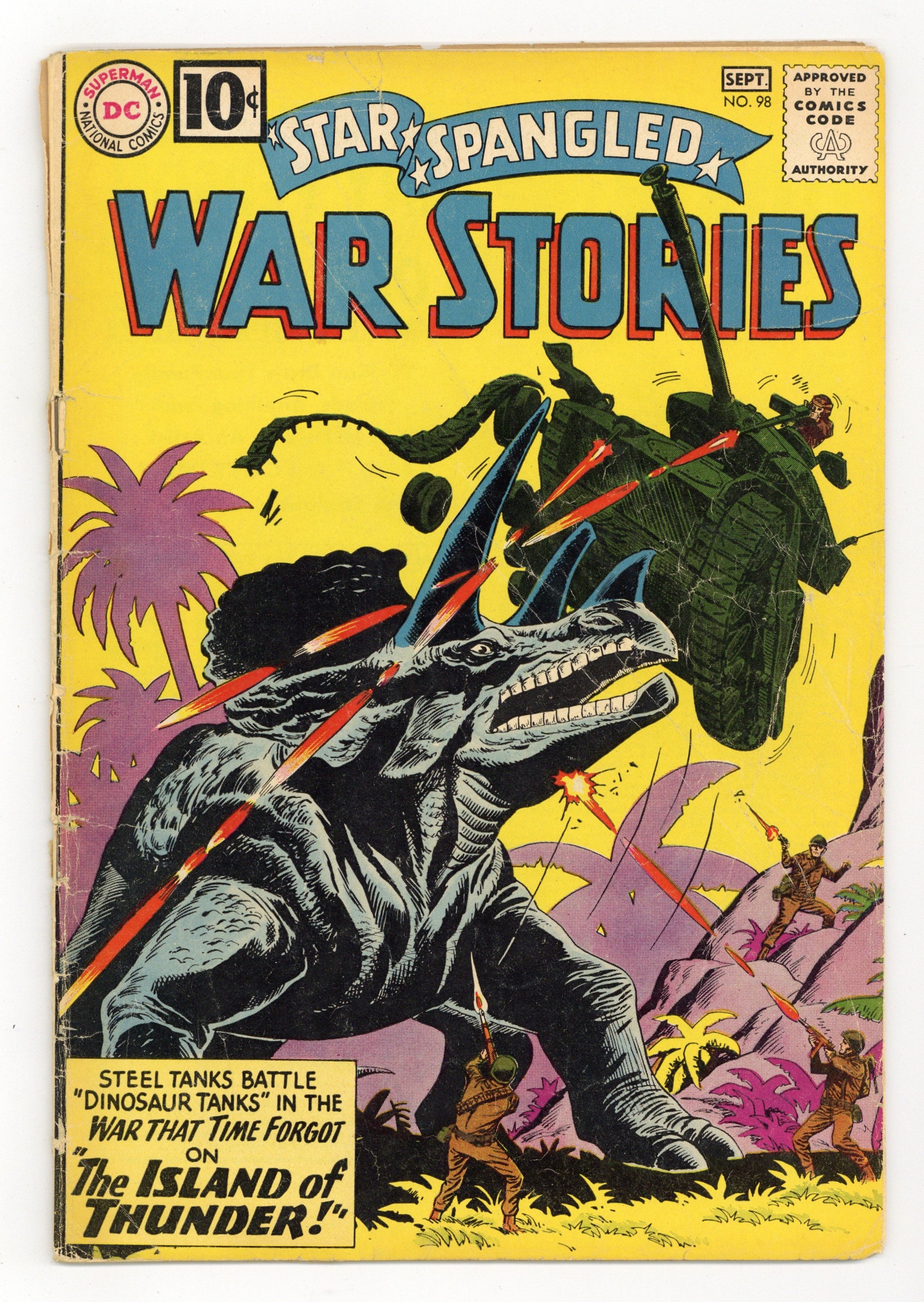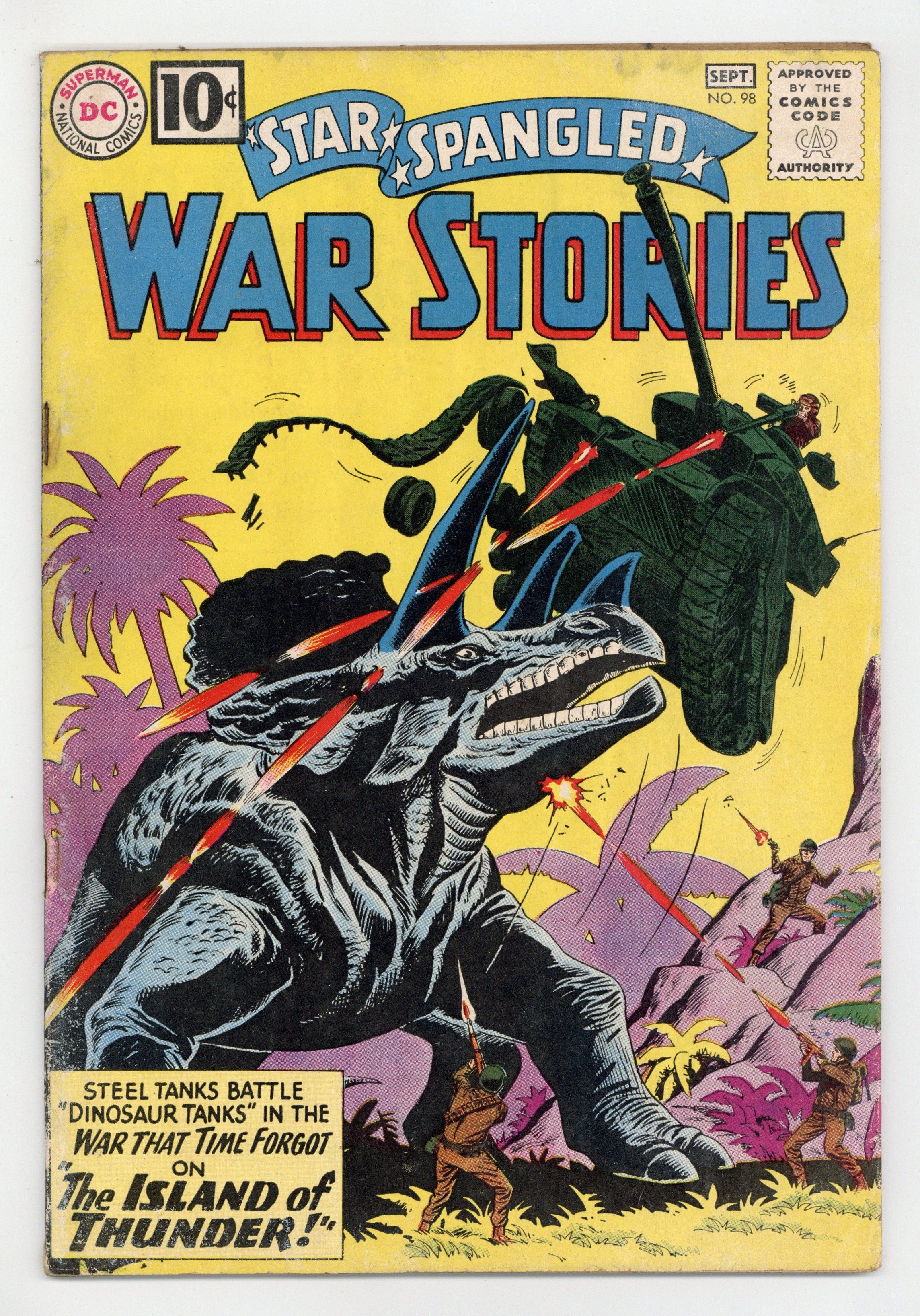 Cover pencils by Ross Andru, inks by Mike Esposito. The Island of Thunder featuring War That Time Forgot, script by Robert Kanigher, pencils by Ross Andru, inks by Mike Esposito. No Room to Fight, script by Bob Haney, art by Irv Novick. Last Shot of the Triggerfish, script by Bob Haney, art by Joe Kubert. Crests of the Army fact page, script and pencils by Morris Waldinger, inks by Tom Nicolisi. 36 Pages, Full Color. Cover price $0.10.