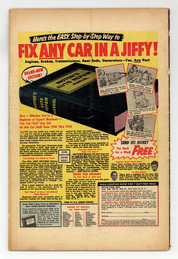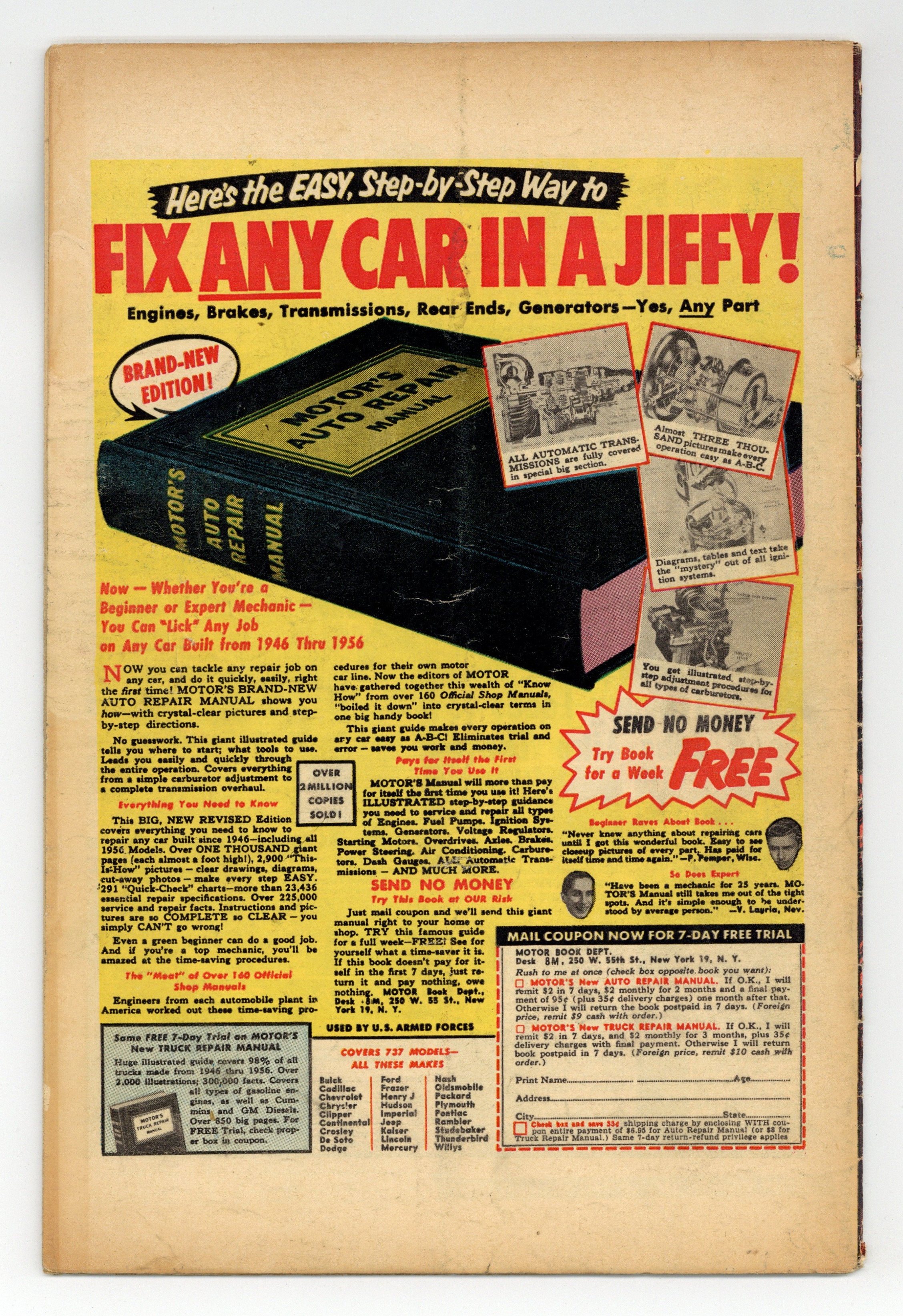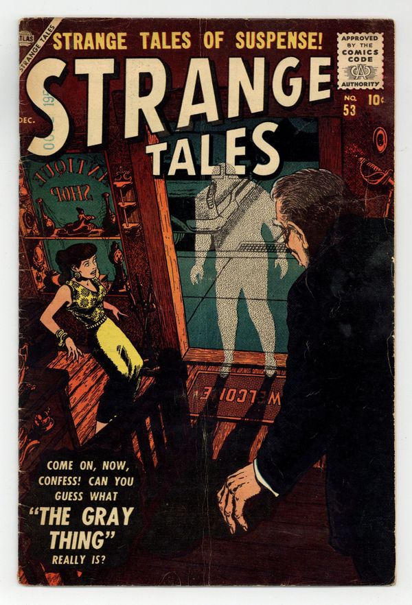 Cover art by Bill Everett. "I Died Tomorrow!", art by Pete Morisi; A man invents a time machine and begins to regularly predict the future until a mob is angry that there is nothing left to live for if everything is known in advance and burn down his lab. "The Brute!", script by Carl Wessler, art by John Forte; Julius Caesar has a dream that he and his close associates are 30's gangsters warning him of his impending assassination. "They Crawl By Night!", art by Vic Carrabotta; A bum finds self-respect when he rejects an offer of underground beings to be their leader in an invasion of the surface world. "What Stanley Saw!", script by Carl Wessler, art by Angelo Torres; A pilot sees a flying saucer land and loses his job over the publicity; He investigates and finds alien refugees attempting to keep a low profile. "The Thirtieth Century" text story. "The Gray Thing!", art by Gene Colan; In the year 2856 a man tells a friend a story about an antique robot he acquired that was built three hundred years ago. "The Man Who Crushed Rocks!", art by Reed Crandall; A man gets driven off into a swamp and finds a spring that gives him great strength; He returns to the town that drove him out and robs the bank. 36 pgs., full color. Cover price $0.10.