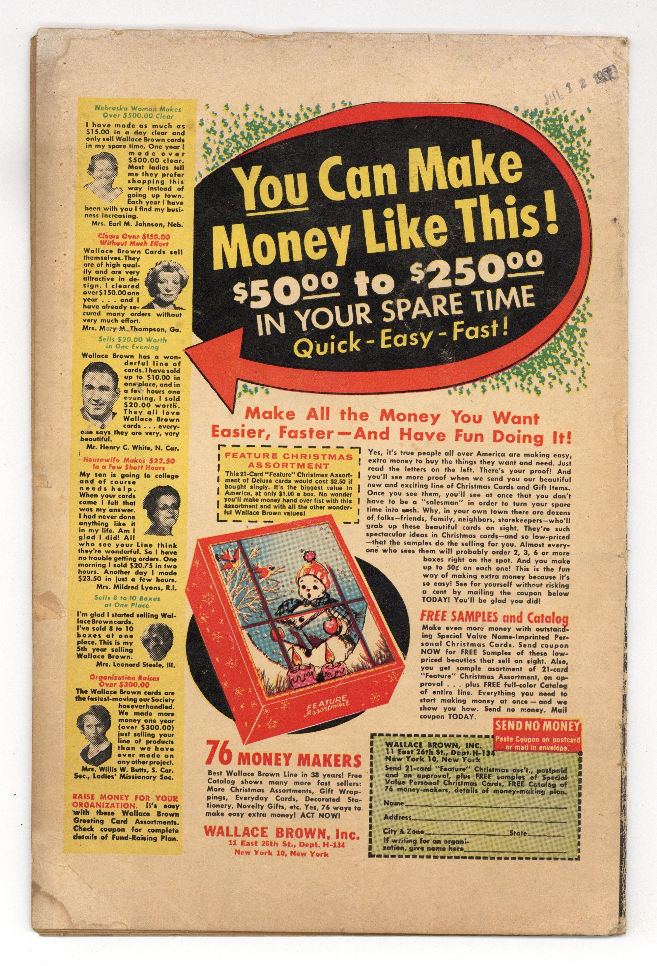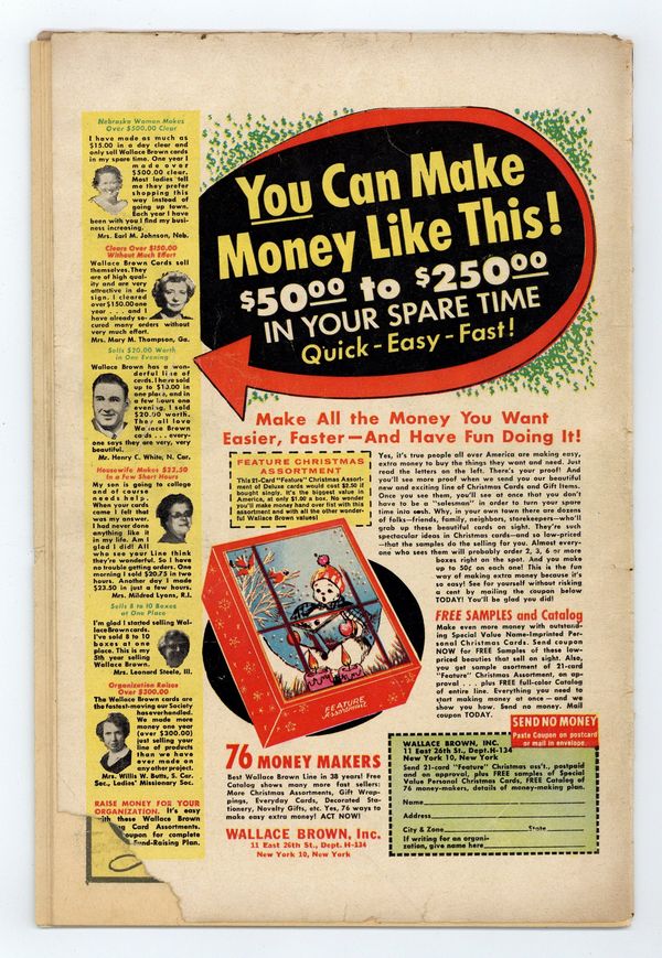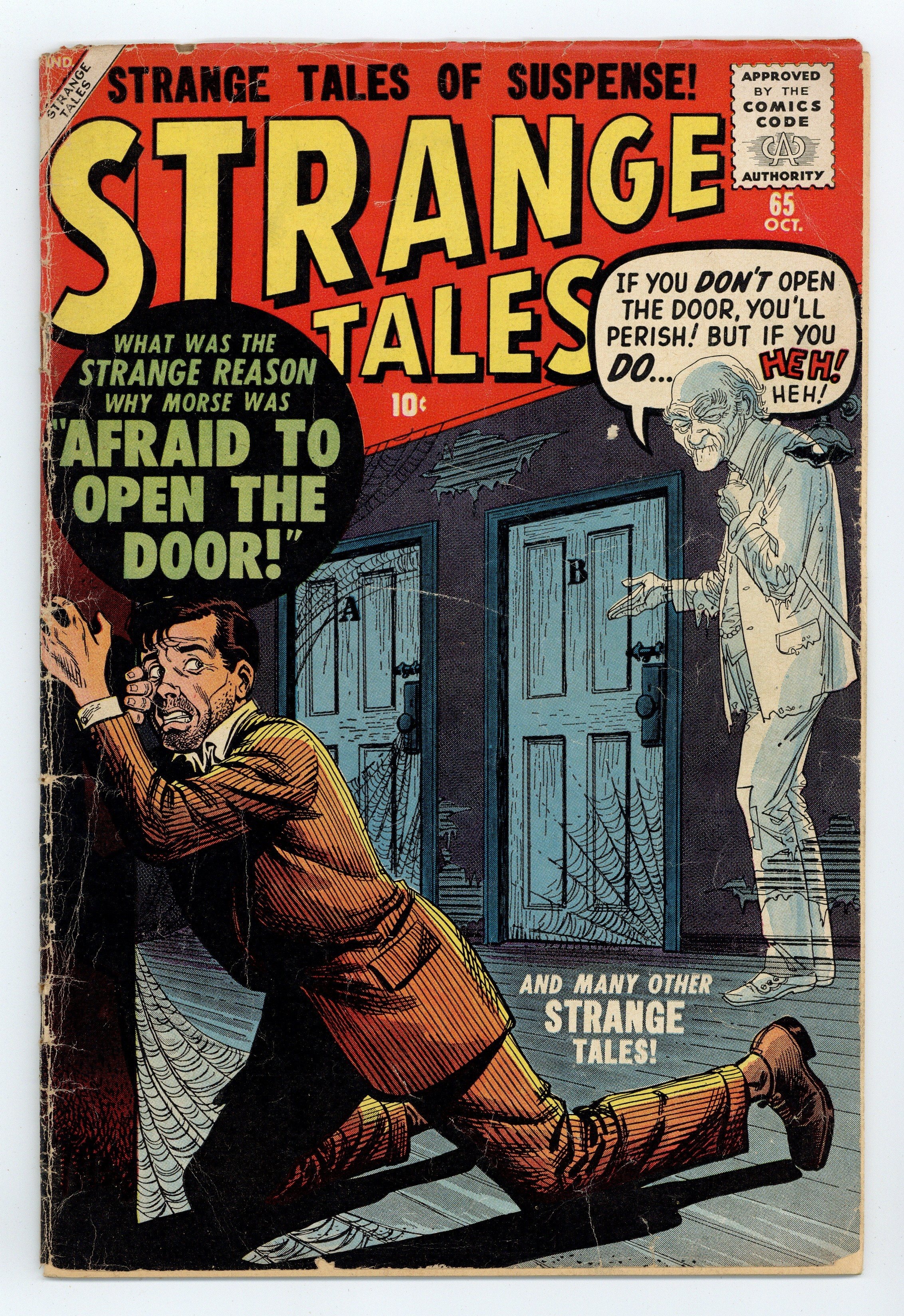 Cover art by Joe Maneely. "Afraid To Open the Door!", art by Dan Loprino; A thief trying to rob a reclusive scientist finds him in a room with two doors; The scientist tells him if he leaves through the wrong door he will be trapped in a shadow world of strange creatures. "The House That Cried!", art by Christopher Rule; A hobo tries to rob an old woman in a dilapidated house who turns out to be a ghost. "The Ragged Man," art by Richard Doxsee; A heartless businessman gets what's coming to him when the Geiger counter he keeps on his yacht goes off and he spends all his money buying worthless land because he thinks that there is a fortune in uranium underwater. "The Terrible Tree!", art by John Forte; A man weakens a large redwood tree so that it will fall on his farm and he can collect on the insurance policy; Objects made from the tree pursue vengeance upon him. "The Perfectly Frightened Man," art by Robert Q. Sale; A man is convinced by his wife that he is the victim of a hoax designed to make him think he has inherited sorcerous powers, but when he says "I'll be a monkey's uncle", he turns into one. "The Missing Film" text story, art by John Severin. "When the Curtain Falls!", art by Bernard Baily; A jealous stagehand swaps a real dagger for a rubber prop hoping that his actor rival will stab himself and he will be free to pursue his love interest without competition. 36 pgs., full color. Cover price $0.10.
