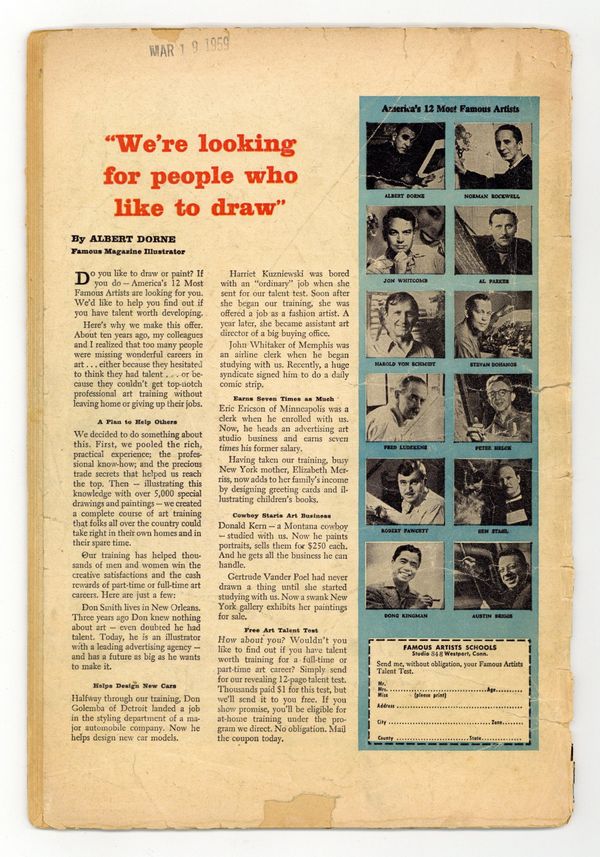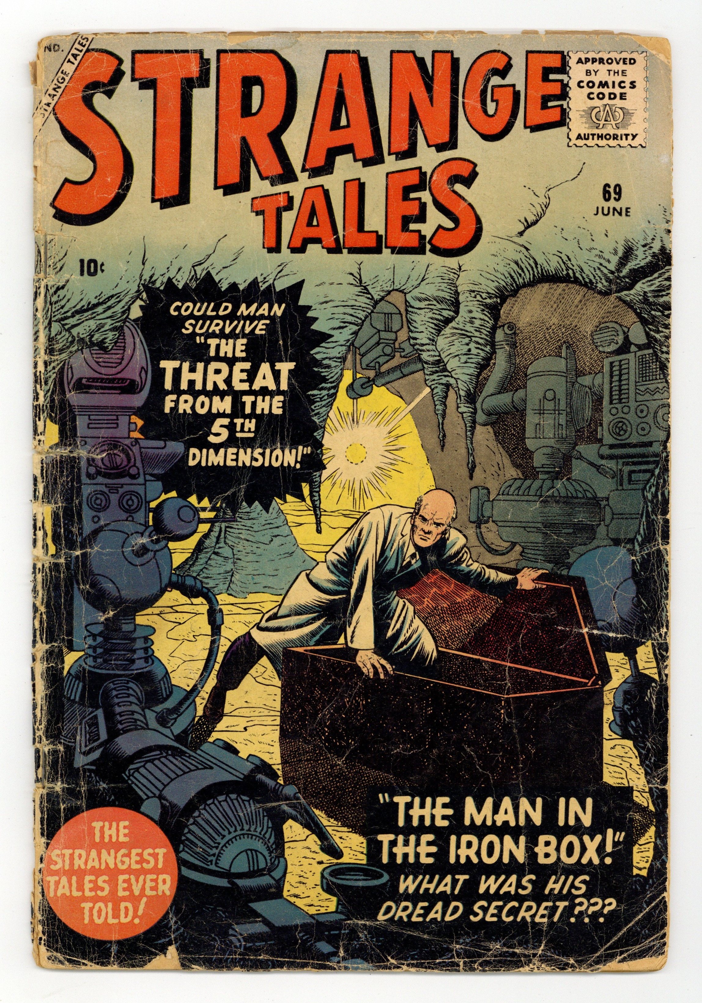 Prototype issue (Professor X). Cover pencils by Jack Kirby, inks by Christopher Rule. "The Man In The Iron Box!", art by Carl Burgos; Certain that the world will soon descend into nuclear war, a brilliant scientist goes into cryogenic suspension for a million years, hoping to awaken in a more enlightened time. "The Talent" text story. "Rocket Ship X-200," art by Don Heck; An aging space pilot is mocked for his slow ship, but when an invading armada approaches Earth his ship is the first to see it. "Journey into Nowhere!", art by Joe Sinnott; Two scientists try to travel to the future, but arrive in the stone age; They believe they have proved travel into the future impossible, not suspecting that they actually saw the world after the destruction of civilization by war. "The World That Was Lost!", pencils by Jack Kirby, inks by Christopher Rule; An old eccentric in a wheelchair hires a sea captain to take him to a spot where he believes that the lost continent of Atlantis lies; When they reach their destination he reveals himself to be a merman and thanks the sailors for bringing him home before diving overboard. "The Threat from the 5th Dimension!", art by Steve Ditko; The 5th dimension is the dream dimension; The creatures there are trying to pass into this dimension, but belief in their existence as opposed to surmising a mere dream experience disrupts the structure of the dream dimension. 36 pgs., full color. Cover price $0.10.
