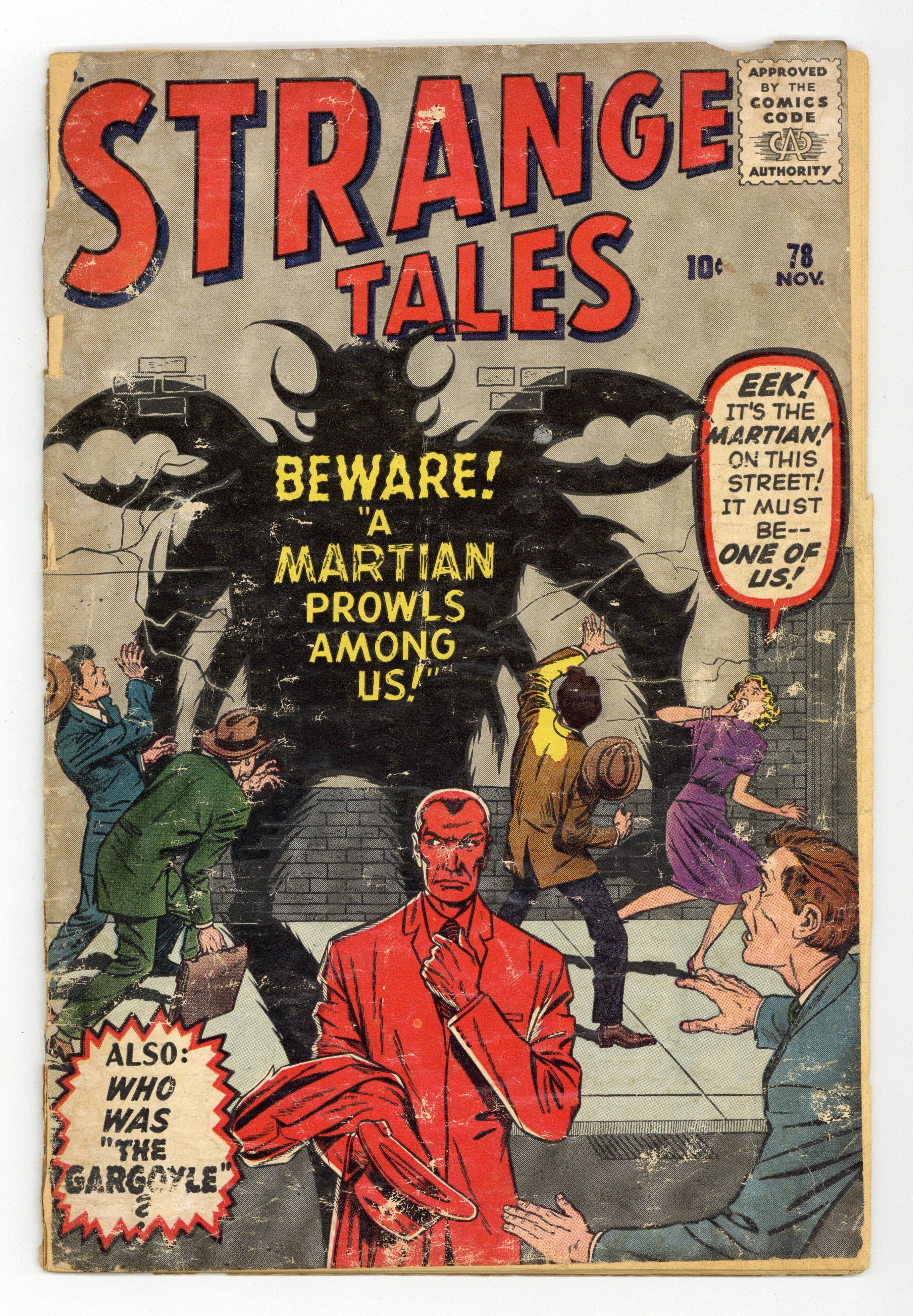 Cover pencils by Jack Kirby, inks by George Klein. "A Martian Walks Among Us!", pencils by Jack Kirby, inks by Dick Ayers; A man spots upon a Martian in human form scouting for an invasion; The police wont believe him, so he finds and kills the spy himself, revealing that he is a Venusian in disguise working to protect Earth. "Trouble Bubble," art by Joe Maneely; A boy discovers a formula to blow unbreakable bubbles and accidentally entraps his father's boss. "The Fantastic Menace of Mento the Mighty," art by Don Heck; A scientist discovers his own innate psychic power and builds a machine to slowly enhance it; He is nearly omnipotent after more than a decade. "The Gargoyle!", art by Paul Reinman; An ugly man rejected by society applies for a job at a circus; It turns out to be a ruse by aliens who are uniformly gorgeous, and so want a man with an ugly face they find fascinating to marry their queen. "Dear Reader: What Would You Have Done if You Were the… Worm Man," art by Steve Ditko (Ant-Man prototype); A spy calling himself 'Worm Man' uses shrinking pills to easily discover military secrets; On a crucial mission, he is attacked by a rat and loses his growth pills, trapping him forever in his tiny form. 36 pgs., full color. Cover price $0.10.