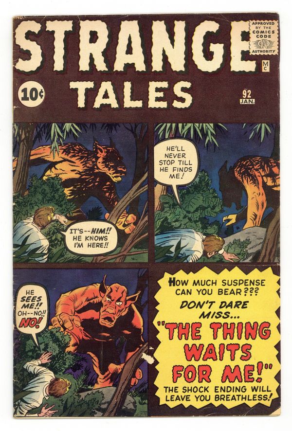 Last 10-cent cover price. Cover pencils by Jack Kirby, inks by Dick Ayers. "The Thing Hunts for Me!", pencils by Jack Kirby, inks by Dick Ayers; An old man in a boarding house tells a woman that is being hunted by a shape-shifting alien; He dies of a heart attack and the woman is relieved, since she is the alien and will not have to kill him. "The Flying Saucer That Was" text story. "The Man Who Shrunk the World!", pencils by Jack Kirby, inks by Dick Ayers; A man from the future travels back to the 1960s to conquer the world with a shrinking gas; When he tests the gas on himself he becomes too small to release the antidote and shrinks to nothingness. "Somewhere Sits a Lama," art by Don Heck; A villager sneaks into a nearby monastery to find the secret of eternal life; He finds the secret, but in order to live forever he must stay motionless in one room until someone comes to take his place. "Inside the Flying Saucer!", script by Stan Lee, art by Steve Ditko; An audience watches a film of an alien invasion. 36 pgs., full color. Cover price $0.10.