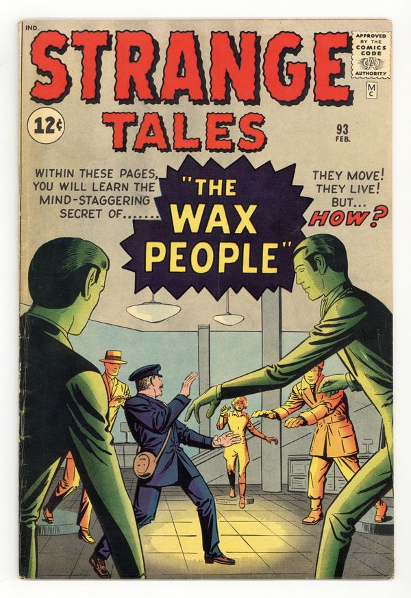 First 12-cent cover price. Cover pencils by Jack Kirby, inks by Steve Ditko. "When the Thing Runs Amok!", pencils by Jack Kirby, inks by Dick Ayers; An inventor builds a robot, but others are afraid of it; The robot goes on a rampage and is dropped into the sea. It leaves a letter saying that it will emerge when humanity learns tolerance. :The Magician" text story. "Earth Will Be Lost Tonight!", pencils by Jack Kirby, inks by Dick Ayers; An agent signs a singer who is an instant hit; He discovers that the singer is an alien whose next record will help his people conquer Earth, and manufactures a scandal to ruin the aliens career. "Mister Black," art by Bob Forgione; A Japanese youth doesnt want to fight in World War II; A stranger named Mr. Black saves him, but only so he will be where he was fated to be in 1945, in Hiroshima as the bomb falls. "The Wax People!", script by Stan Lee, art by Steve Ditko; The mannequins in a store come to life in a creepy atmosphere as it closes; However, this is not thought odd by anyone, because on this alien world all people are made of wax, and some work as mannequins, but leave with everyone else at closing. 36 pgs., full color. Cover price $0.12.