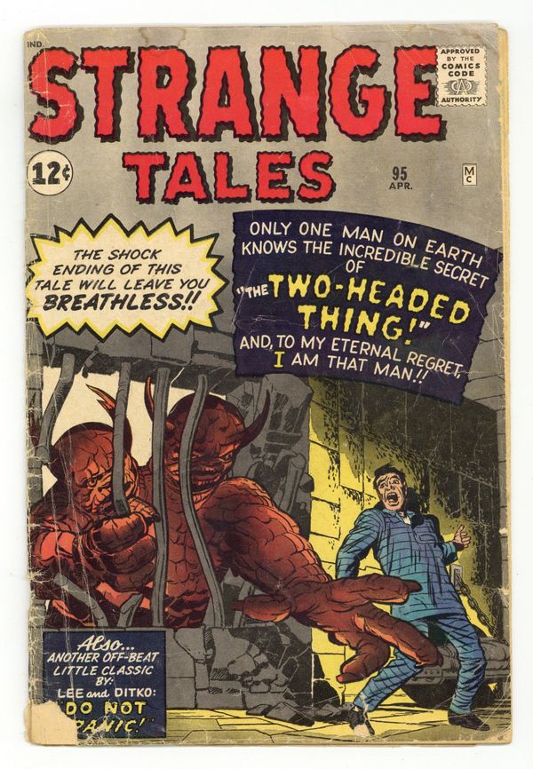 Starts Jan 26 Cover pencils by Jack Kirby, inks by Dick Ayers. "The Two-Headed Thing!", pencils by Jack Kirby, inks by Dick Ayers; In a storm, a convict escapes through a hole smashed in the wall; When he is found, he tells a tale of a shape-shifting monster; When the guards scoff, the escapee reveals that HE is the monster. "Muscle Man" text story. "The Monster Escapes!", pencils by Jack Kirby, inks by Dick Ayers; An alien planning to invade Earth crash lands and tries to find a rocket to escape; Instead, he accidentally conceals himself in an airtight time capsule and suffocates. "The Cave of Shaggdorr!", art by Don Heck; No one had ever returned from a treasure search in the cave of the Shaggdorr on Ursa Centaurius; Bruno Krugg escapes the authorities and heads for the planet to steal the treasure. "Do Not Panic!", script by Stan Lee, art by Steve Ditko; An alien craft arrives over a city and descends; The pilot wears a frightening spacesuit, but since the military do not panic, they do not attack, and when the human pilot removes his helmet he is warmly greeted by the people of Mars. 36 pgs., full color. Cover price $0.12.