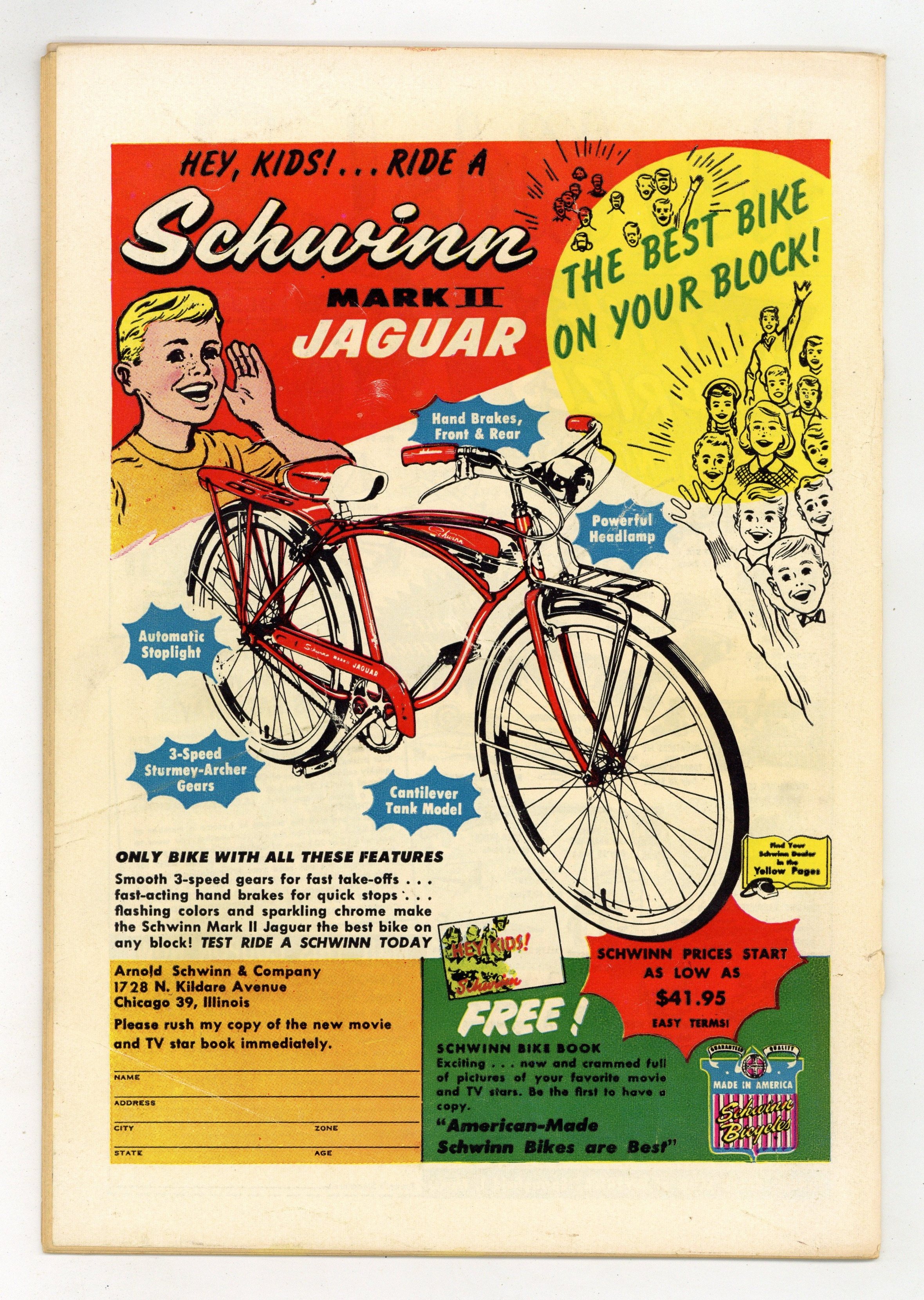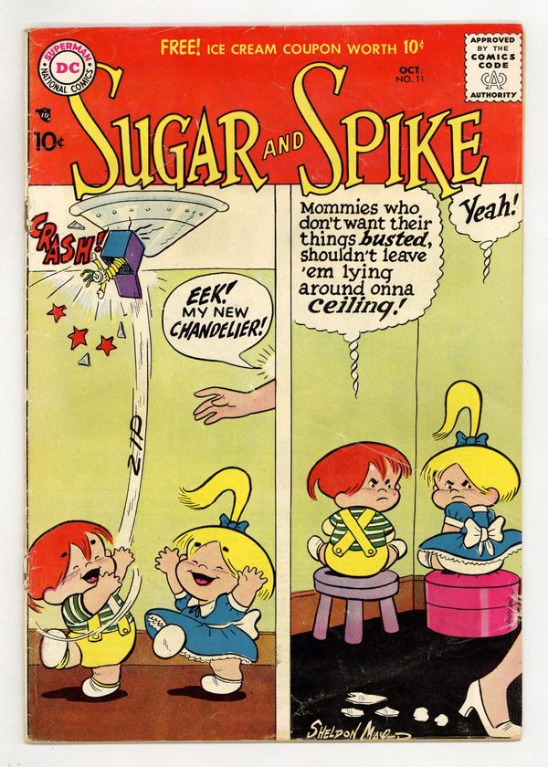 Cover art by Sheldon Mayer. Stories starring Sugar & Spike: The Cuddly-Toy, New Method, The Indoor Ocean, Trick or Treat, and Grown-Up Party. Scripts and art by Sheldon Mayer. Write Your Own Comic Page! by Mayer. Pint-Size Pin-Ups paper dolls by Mayer. How NOT to Enjoy a Vacation! public service announcement, script by Jack Schiff, art by Ruben Moreira. 36 Pages, Full Color. Cover price $0.10.