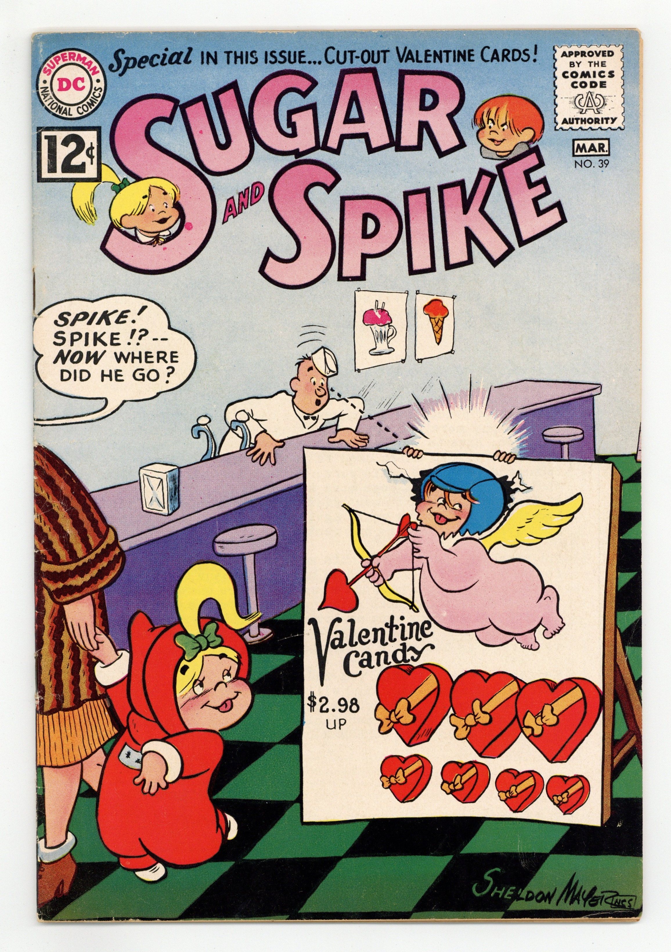 $45.50Cover art by Sheldon Mayer. Stories starring Sugar & Spike: Ski-Wheeee!, The Big Mail-Box Mystery, The New Kid, and Adventure with Uncle Charley's Put-Put. Scripts and art by Sheldon Mayer. Let Science Serve You! public service announcement, script by Jack Schiff. Sugar and Spike Cut-Out Valentine Cards by Mayer. Write Your Own Comic Page! by Mayer. 36 Pages, Full Color. Cover price $0.12.