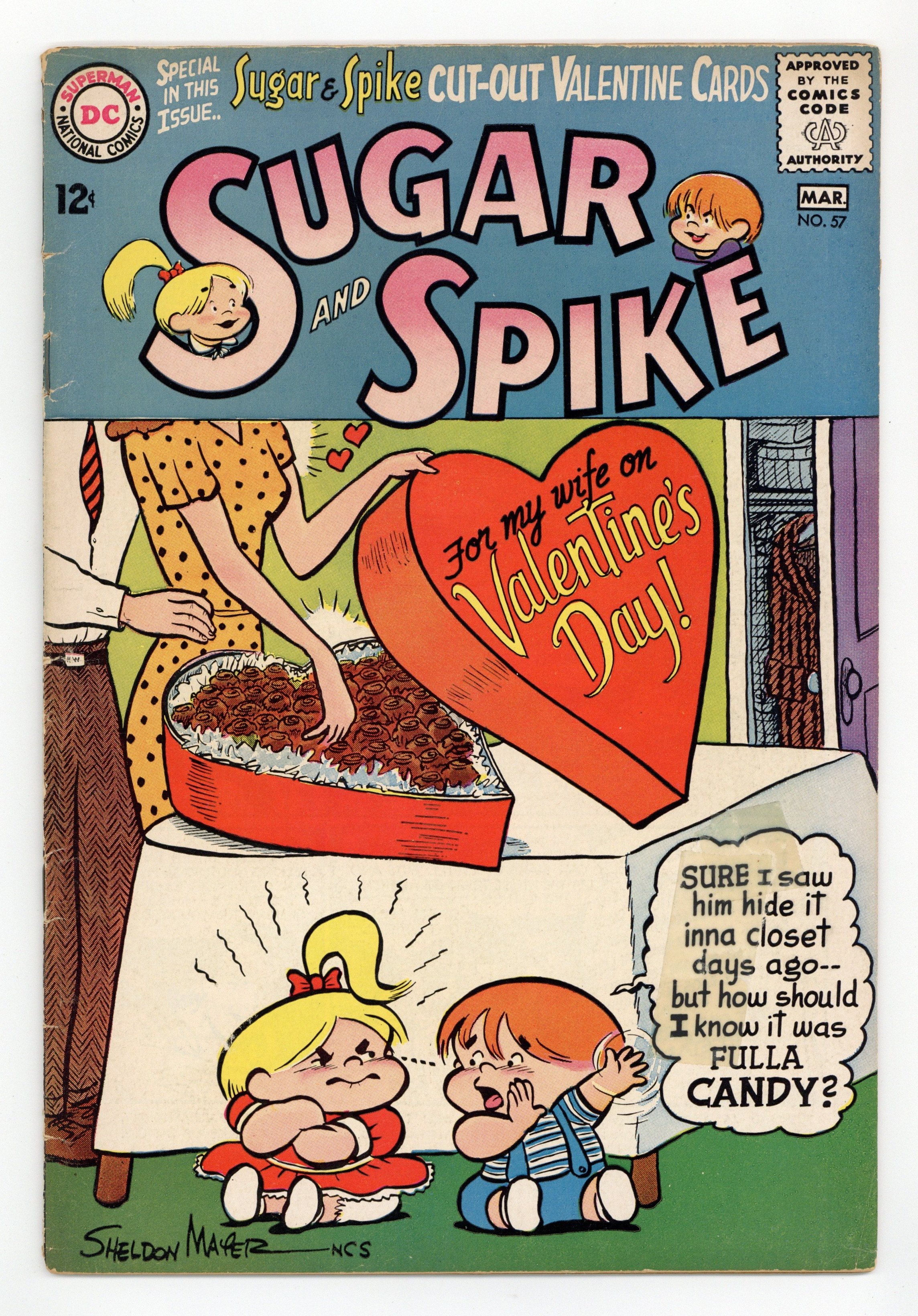 Cover art by Sheldon Mayer. Stories starring Sugar & Spike: Valentine's Day Comes to Doll-Boy!!, Little Arthur's Puppet Plot!, Sugar's Conscience, Spike's Education!, and Spike's Big Secret. Scripts and art by Sheldon Mayer. Don't Give Fire a Place to Start! public service announcement starring Superboy, script by Jack Schiff, art by Win Mortimer. Special! Pint-Size Valentine Cards! by Mayer. Pint-Size Pin-Ups paper dolls by Mayer. Write Your Own Comic Page! by Mayer. 36 Pages, Full Color. Cover price $0.12.