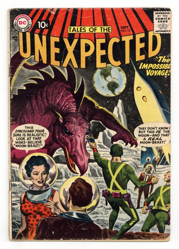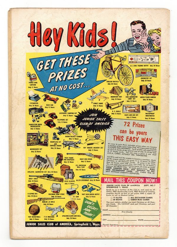 Cover pencils by Ruben Moreira, inks by Ruben Moreira and Jack Adler (washes). Yogi Berra Homers in the 9th - Wins Big Game! ad for Wilson Chemical Co. "Who Is Mr. Ashtar?, art by Jack Kirby; A hotel detective helps a man from the future get a picture of blueprints of a weapon necessary to repel a Martian invasion in 2957. Danger Prejudice at Work! public service announcement, script by Jack Schiff, art by Ruben Moreira. "Beware the Thinking Cap, art by Bill Ely; Johnny Manton steals a cap from a museum reputed to give its wearer great intelligence, but Manton doesn't know that the cap only allows itself to be used for good. Hamid the Hypnotist humor page by Henry Boltinoff. Professor Eureka humor half-page by Henry Boltinoff. "The Bullet Man, art by Bernard Baily; Due to a mixture of elements from a meteorite and scrap metal from an atomic research lab in his ID tag, inmate Chick Durant is able to leave his cell for 25 minutes at a time. "Strange Visit from Venus article. "The Impossible Voyage, art by Jim Mooney; As a prank, aliens take people lining up for a new amusement ride on a real ride through the solar system. 36 Pages, Full Color. Cover price $0.10.