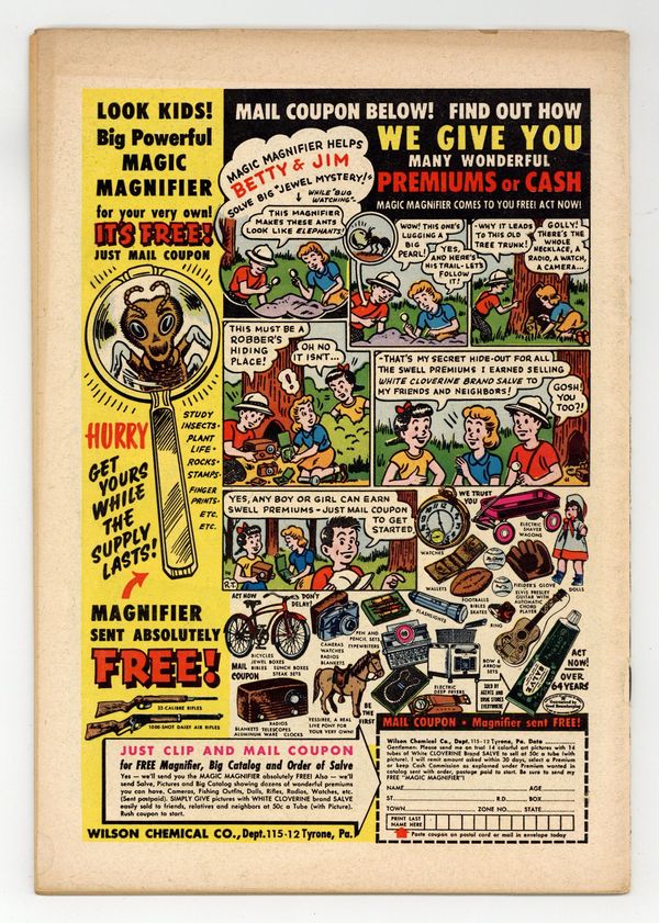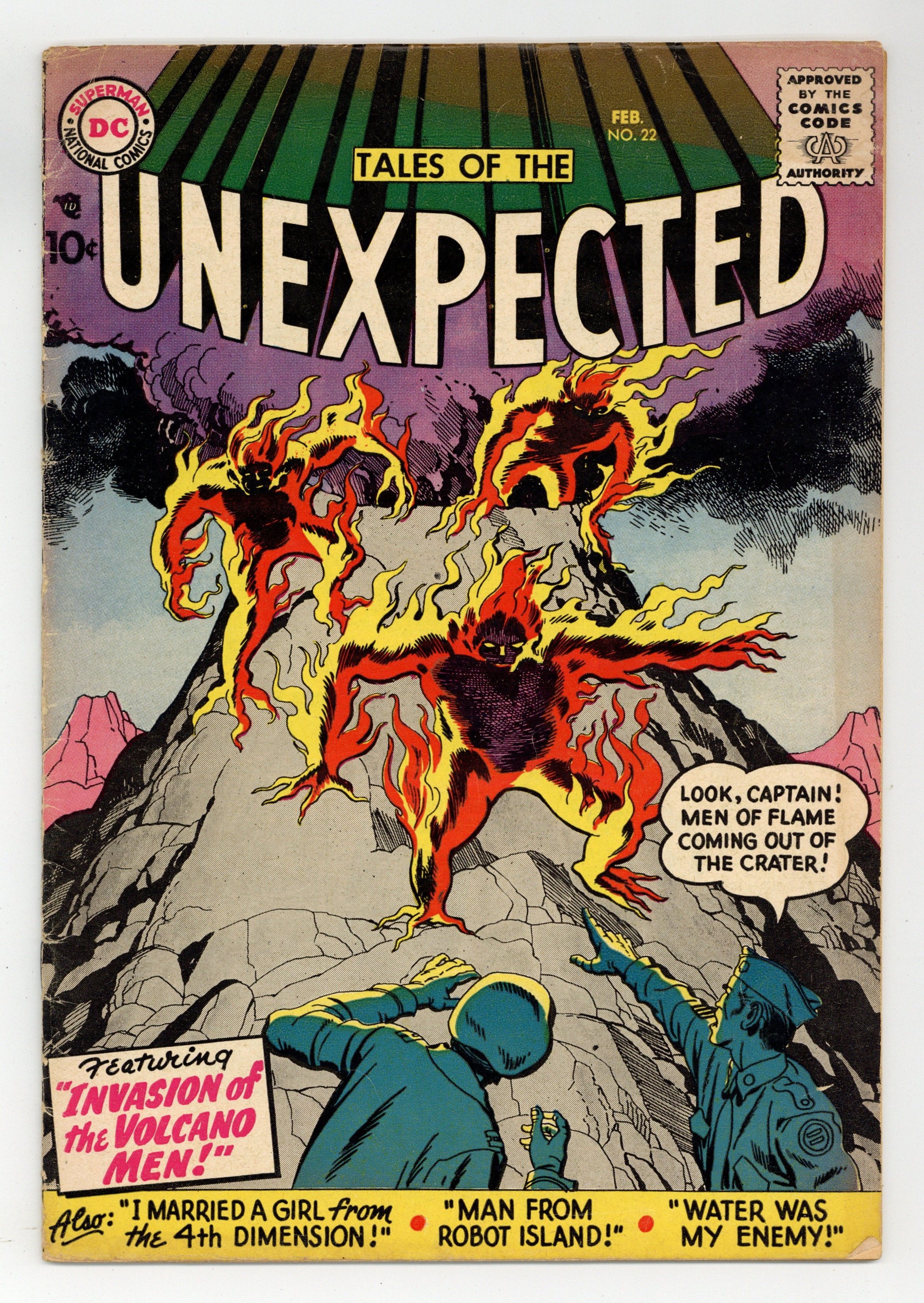 Cover art by Jack Kirby. The Man From Robot Island, art by Bernard Baily. I Married A Girl From the 4th Dimension, art by Howard Purcell. Water Was My Enemy, art by Joe Maneely. Invasion of the Volcano Men, art by Jack Kirby; fiery creatures come out of a volcano and attack. 36 Pages, Full Color. Cover price $0.10.