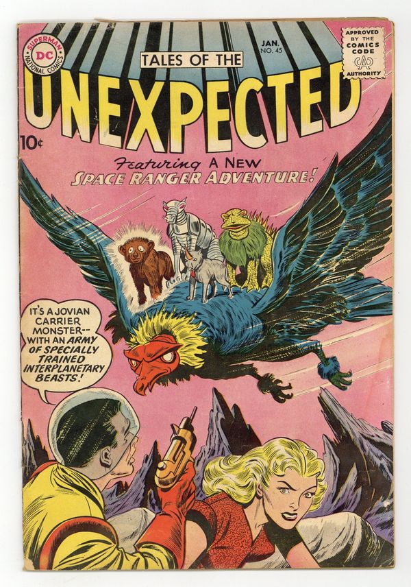 Cover pencils by Dick Dillin, inks by Sheldon Moldoff. The Sheriff From Jupiter, art by Howard Purcell. The Planet With Three Faces, art by Nick Cardy. The Army of Interplanetary Beasts starring Space Ranger, art by Jim Mooney; Space Ranger faces a Jovian carrier monster carrying an army of interplanetary beasts. 36 Pages, Full Color. Cover price $0.10.