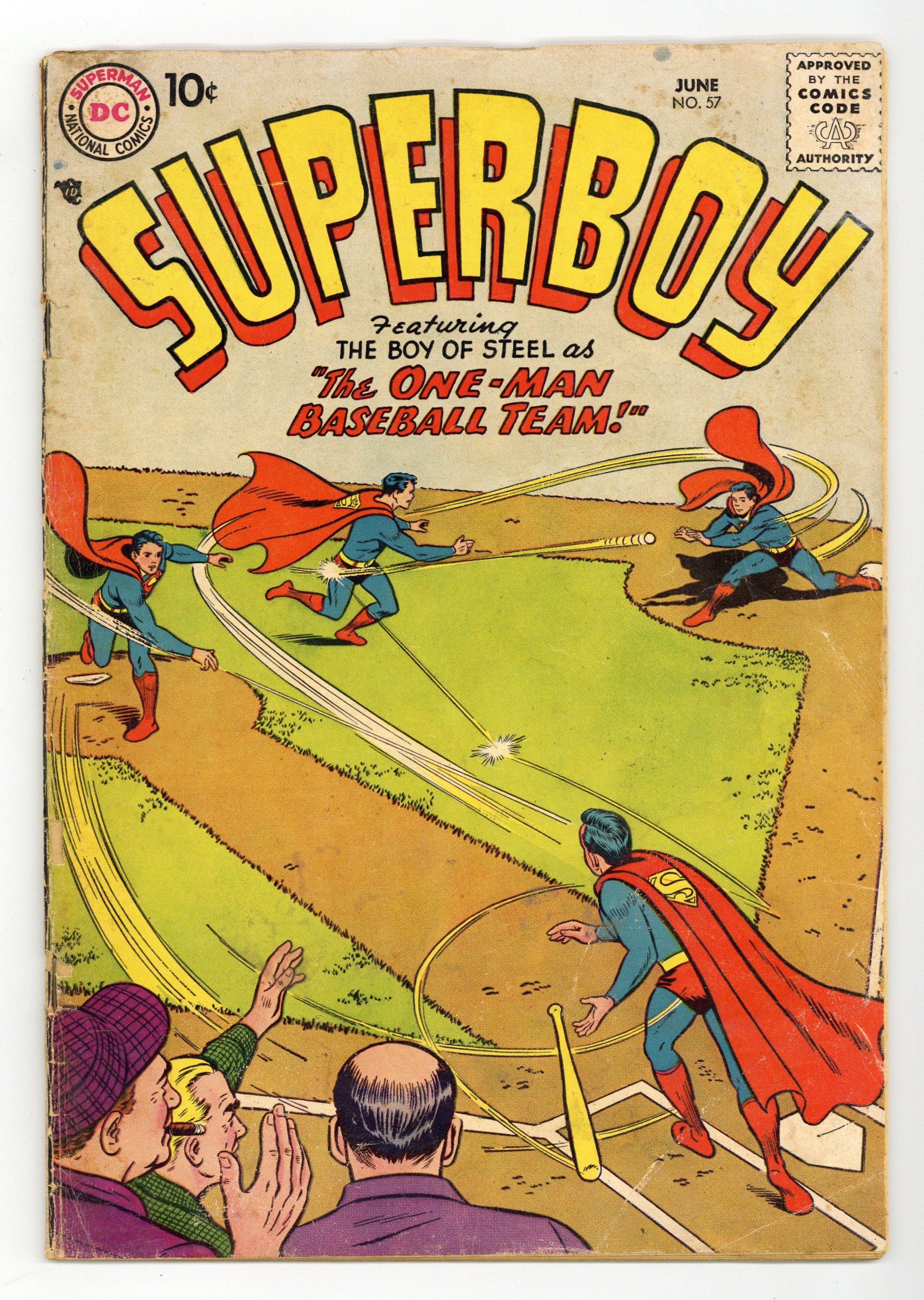 Cover pencils by Curt Swan, inks by Stan Kaye. "The Strong Boys of Smallville," script by Otto Binder, pencils by Curt Swan; The head of a phony strength-increasing racket appears to have put one over on Superboy, but the Boy of Steel turns the tables on him as Clark Kent. Worldwide Adventures in Science! public service announcement, script by Jack Schiff, art by Ruben Moreira. Charlie Cannonball humor page by Henry Boltinoff. "The Boy of the Year Contest!" starring Superboy, script by Otto Binder, art by John Sikela; When Superboy is forbidden to compete in the Boy of the Year contest, it appears as though he is sabotaging the other contestants; But he manages to expose the real cheat, and Clark Kent receives the honor. Shorty humor half-page by Henry Boltinoff. Detour to Doom text article. "One-Man Baseball Team" starring Superboy and Lana Lang, script by Otto Binder, pencils by Curt Swan; Superboy fields a team by himself. Hy Wire humor page by Henry Boltinoff. 36 Pages, Full Color. Cover price $0.10.