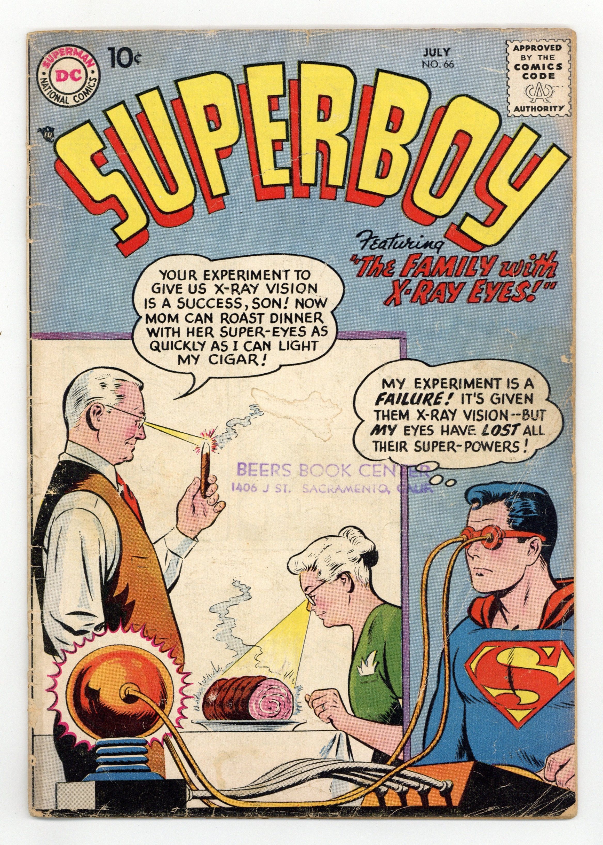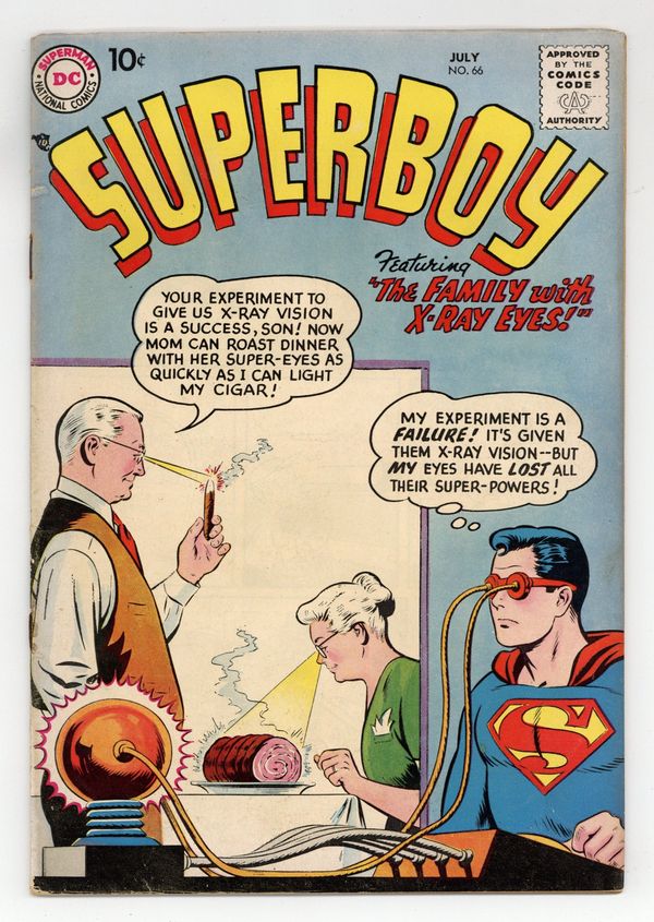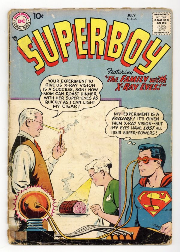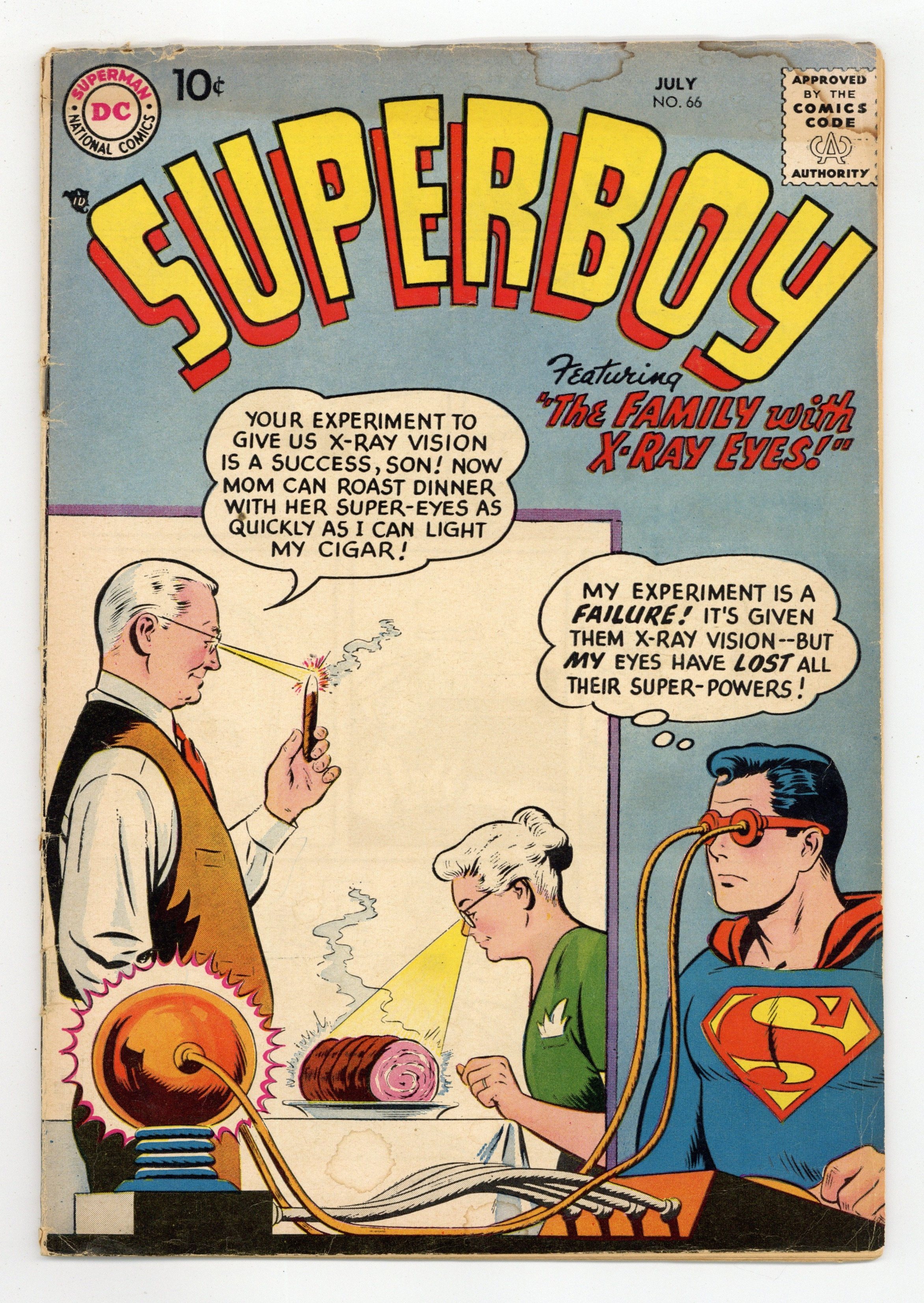 Cover pencils by Curt Swan, inks by Stan Kaye. Are You a Litter-Bug? public service announcement by Henry Boltinoff. The Family with the X-Ray Eyes, script by Jerry Coleman, art by John Sikela; An experiment of Superboy's accidentally gives Ma and Pa X-Ray vision, and causes Superboy to lose his! Little Pete humor page by Henry Boltinoff. Clark Kent, Class Cheat, script by Otto Binder, art by George Papp; Clark deliberately starts flunking tests so he can break a ring of cheaters in his school. The World Through Superboy's Eyes, script by Otto Binder, art by George Papp; Lana comes upon a strange camera that takes pictures of whatever Superboy sees. Make Yourself a Mask--Superboy's Workshop activity page 36 Pages, Full Color. Full page color ad for Showcase #15 featuring Space Ranger. Cover price $0.10.