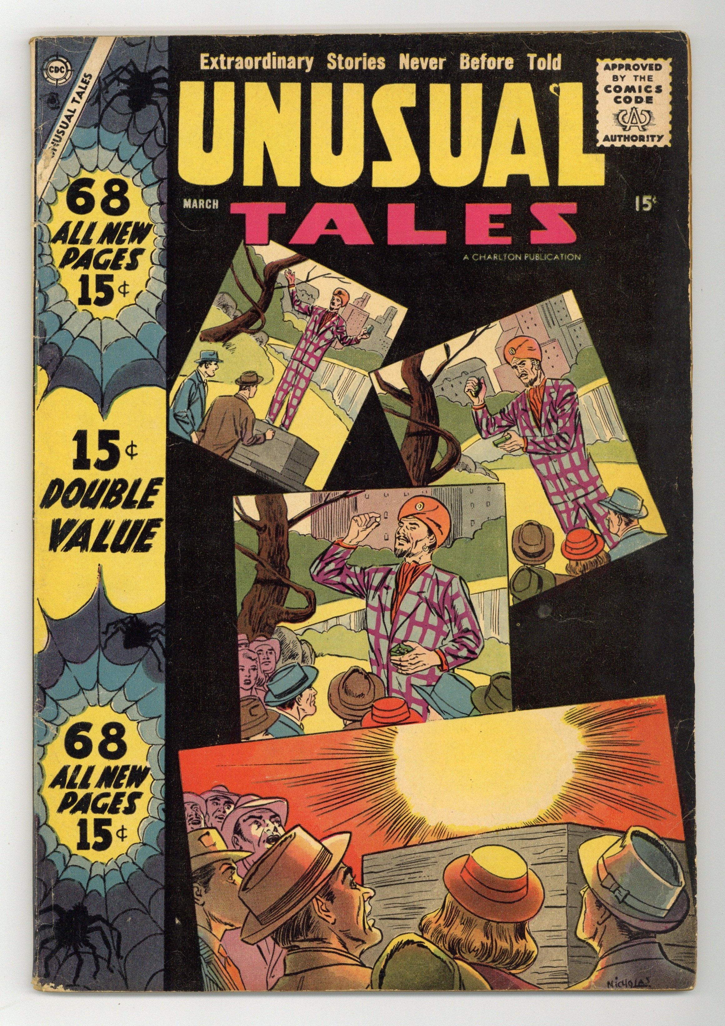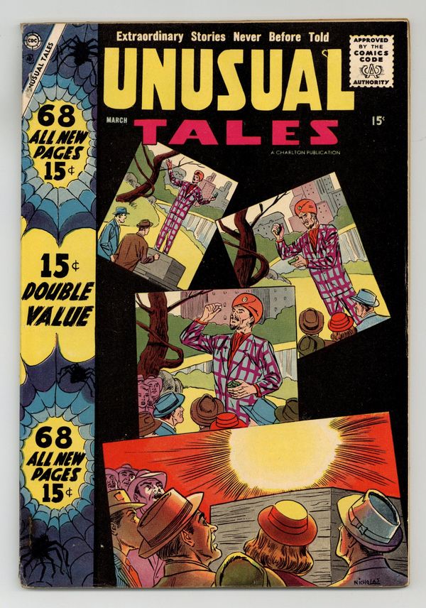 Cover by Charles Nicholas and Vince Alascia. Stories and art by Steve Ditko, Gene Colan, Charles Nicholas, Joe Gill, Maxwell Elkan, Sal Trapani, Rocco "Rocke" Mastroserio and Bill Molno. Strange stories of science fiction, fantasy and horror that fit within the guidelines of the new Comics Code. In one of four (!) stories this issue with art by Spider-Man co-creator Steve Ditko, a scientist's super-microscope reveals secrets humankind was not meant to know. In another Ditko story, a WWII military commander killed in battle returns to save his men. An eye transplant allows a blind man to see, but then he learns the donor was a psychotic killer, in a story featuring art by future Marvel legend Gene Colan. Dreamer; Second Chance; The Beast Legend; Charmed, Im Sure; The Right Spot; Deep in the Mountains; Unwelcome Caller; The Bad Eye; The Living Fog; Noise in the Cellar; The Ghost Gabs; The Man Who Couldnt Die; Dream On...! 64 pages, Full Color. Cover price $0.10.