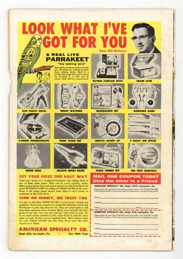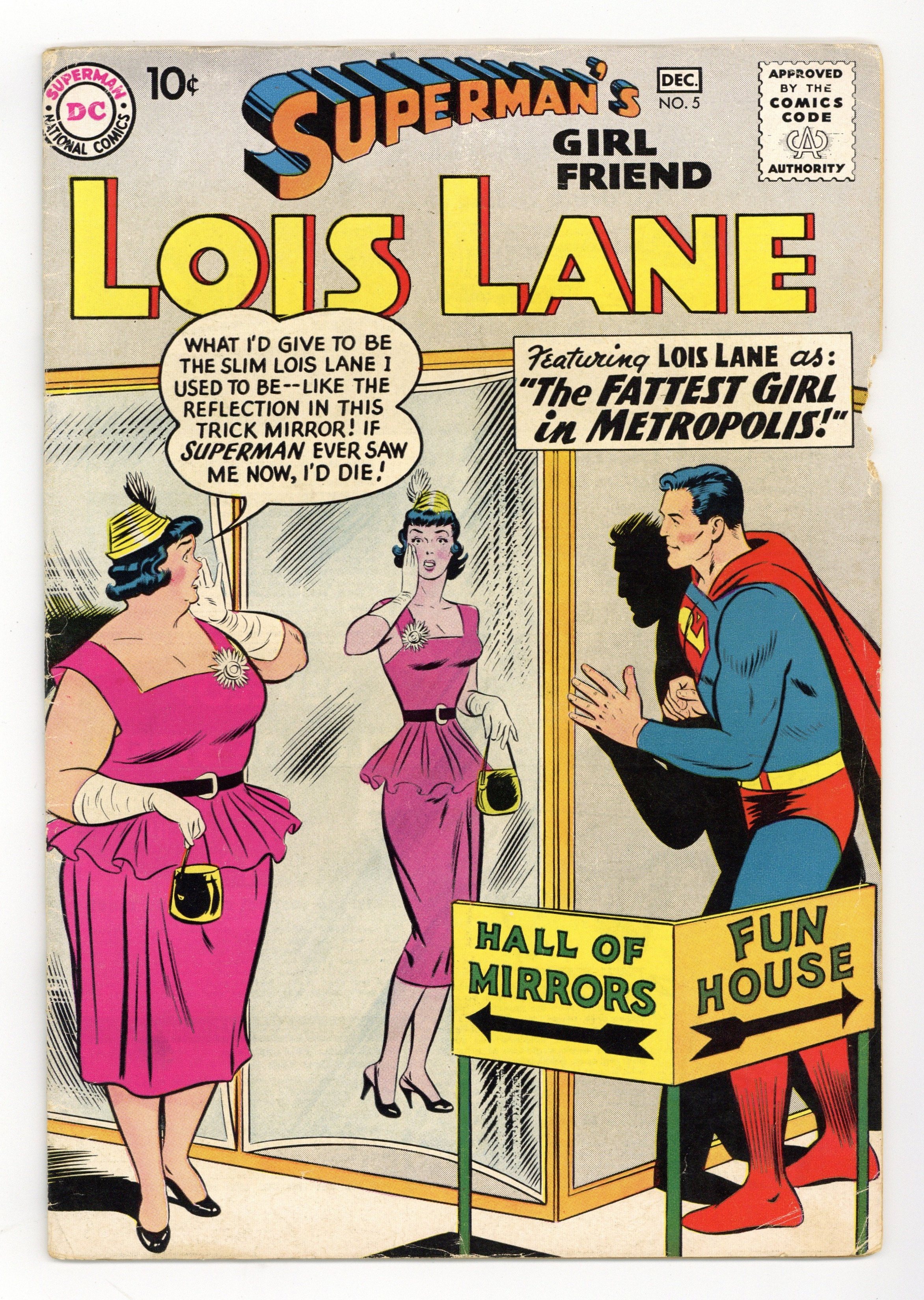 Tags: Superman$75.00Cover pencils by Curt Swan, inks by Stan Kaye. Superman's Greatest Sacrifice!, script by Robert Bernstein, art by Kurt Schaffenberger; Lois meets heiress Dolores Drake who seems to be an exact double of her. The Girl of 1000 Costumes!, art by Al Plastino; Due to a minunderstanding, Lois thinks Superman will like her better if she changes her look frequently. The Fattest Girl in Metropolis, script by Otto Binder, art by Kurt Schaffenberger; Professor Colby's ray turns Lois fat and she tries to keep Superman from seeing her. 36 Pages, Full Color. Cover price $0.10.