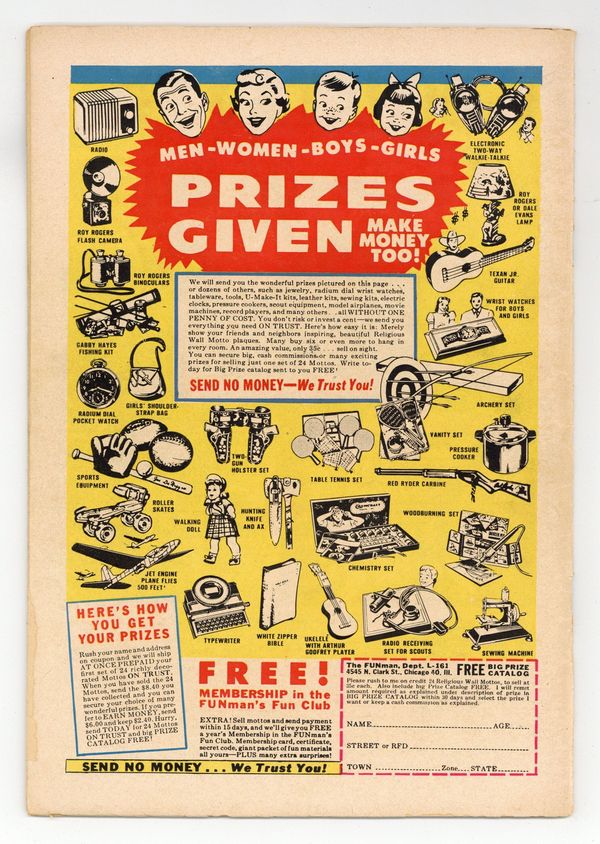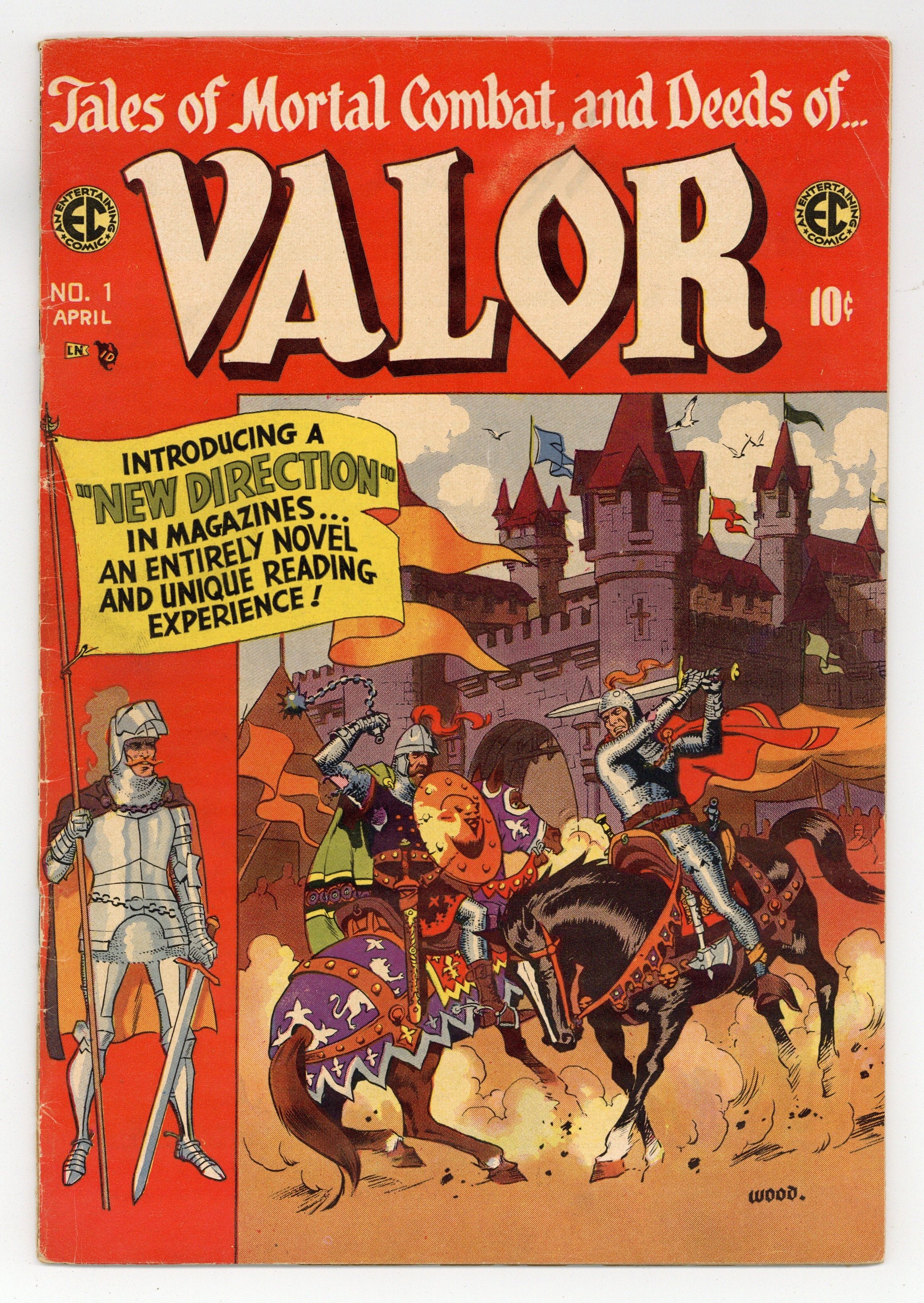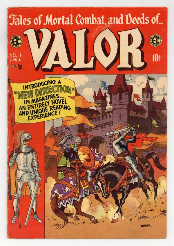 Cover by Wally Wood. Stories by Carl Wessler. Art by Al Williamson, Angelo Torres, Marie Severin, Bernie Krigstein, Graham Ingels, and Wally Wood. One of EC Comics' late New Direction titles, a response to the new Comics Code, featuring historical adventure. A Roman gladiator rises and falls on the word of the Emperor's smitten wife, with art by Al Williamson and Angelo Torres. An overconfident general finds the Haitian natives have outmaneuvered him, illustrated by Bernie Krigstein. A British warrior claims to be the returned King Arthur, but his rule is anything but kingly, in a Wally Wood story. The Arena; The Guardians of Empire; Strategy; Revolution; The Return of King Arthur. 36 pages, Full Color. Cover price $0.10.