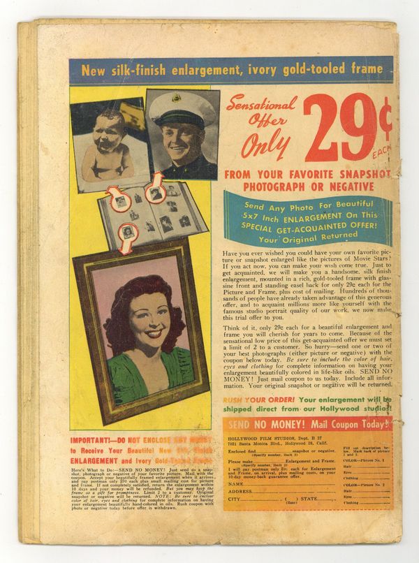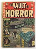 Cover by Johnny Craig. "One Last Fling!", script and art by Johnny Craig; The knife-throwing act in the little theatre in Hungary was extremely popular, but the couple was glad to be moving on to Paris the next day; Harry discovers Olga was a vampire. "That's a 'Croc'!", art by Howard Larsen; At the local zoo, people crowd around the newest attraction: a pit with four crocodiles. "Now or Never!" text story by William M. Gaines. "Child's Play", art by Jack Kamen; As a group of boys were playing football in front of Mr. Collin's house, they were rudely told by him to get away from the front of his home or he'd call the police. "Trapped!", art by Jack Davis; Inside a moving railroad boxcar, Marty rolled over and grabbed his black bag as he spied a new person inside the car; Just as they passed the Smoky Mountains, and the stranger told Marty that those parts were deserted because the area was haunted, they heard a noise and saw a rail policeman nearing them, so they jumped from the train, killing the stranger. 36 pgs., full color. $0.10. Cover price $0.10.