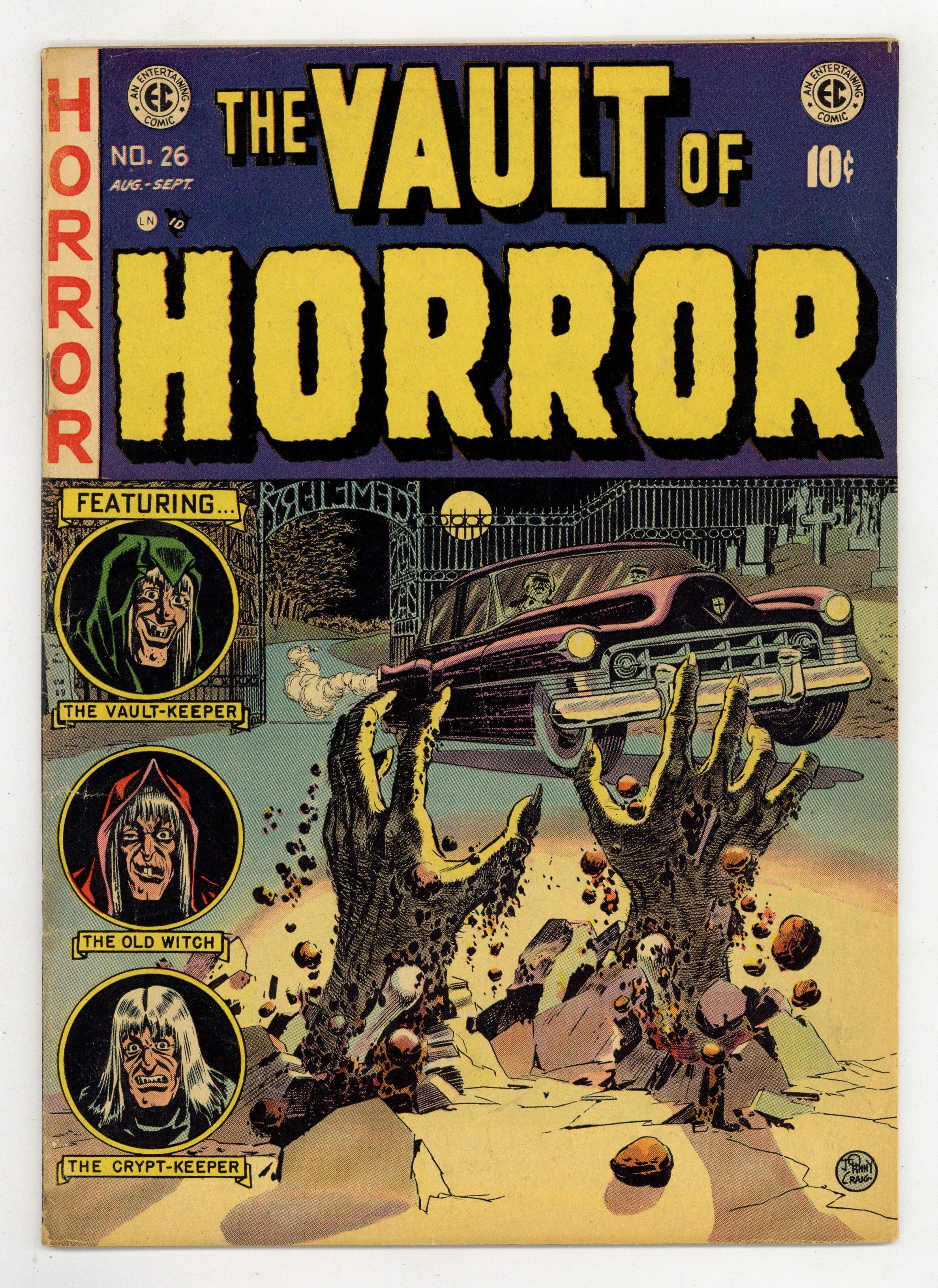 Cover by Johnny Craig. Ad for Weird Science and Weird Fantasy. "Two of a Kind!", script and art by Johnny Craig; The huge ocean liner pulled into the pier with many photographers waiting to snap a picture of camera-shy Willow Dree In the past, attempts were made to photograph her; the photos showed backdrops behind her, but she was never in any picture. "Graft in Concrete!", art by Jack Davis; Hornsby gruffly enters the Mayor's office planning to threaten the Mayor to get the road contract he was after, but the Mayor tells him the City Council will vote on that at the regular meeting; a member demands the new road also go through his town cemetery. "Joker!" text story by William M. Gaines. "Half-Way Horrible!", art by Sid Check; a voodoo witch doctor story. "Hook, Line, and Stinker!", script by Bill Gaines (co-plot) and Albert B. Feldstein (co-plot, script), art by Graham Ingels; Bernice was tired of his Saturday fishing trips and all the fish-mounted trophies she had to care for; One Saturday morning, she followed him on one of his trips where she discovered that he was cheating on her. NOTE: This issue was reprinted by East Coast Comics with a $1 cover and 1970's copyright date (see E.C. Classic Reprints # 10). These and other changes make the reprint easy to distinguish from the original, which has a 10-cent cover price and a 1950's publication date. 36 pages, full color. Cover price $0.10.