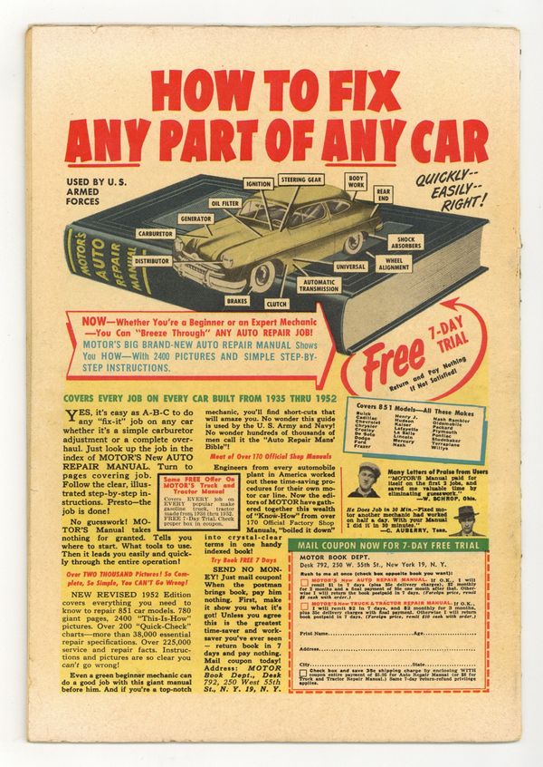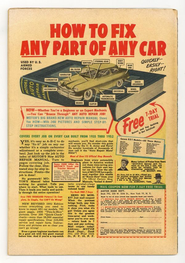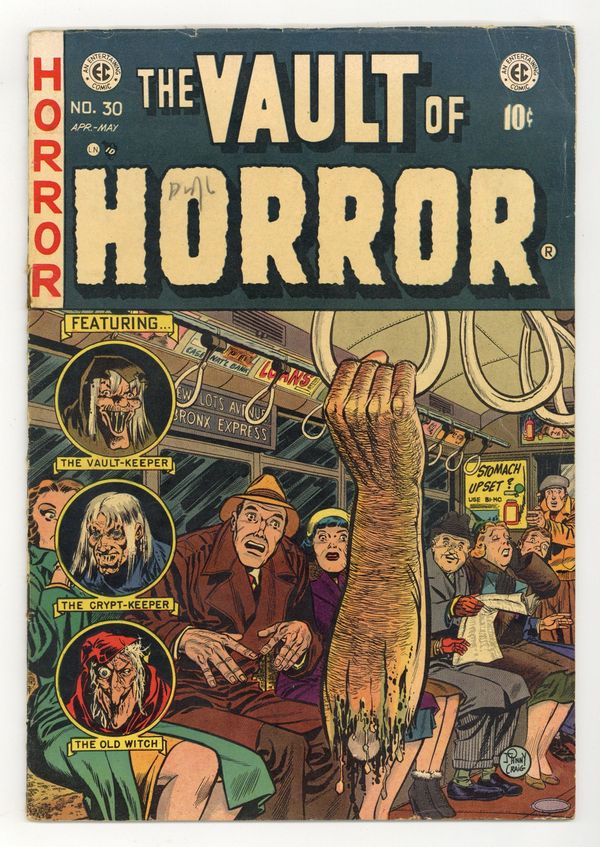 $880.00Cover by Johnny Craig. Ad for MAD magazine. "Split Personality!", script and art by Johnny Craig; Ed King was a racketeer trying to find a way to bilk the Blair sisters out of their millions. "Who Doughnut?", script by Al Feldstein, art by Jack Davis; Seven women had been murdered and the Police were baffled by the doughnut-shaped wounds all over their bodies, blood drained and traces of sea brine on their skin and clothing. "Refuge" text story. "Practical Choke!", script by Al Feldstein, art by George Evans; Three medical students play a series of practical jokes using actual human body parts and watching the reactions of various people. "Notes to You!", script by Bill Gaines (co-plot) and Albert B. Feldstein (co-plot, script), art by Graham Ingels (as Ghastly); Four different people receive to what amounts to anonomous poison-pen letters, each resulting in horrendous events surrounding their families or businesses. 36 pgs., full color. $0.10. Cover price $0.10.