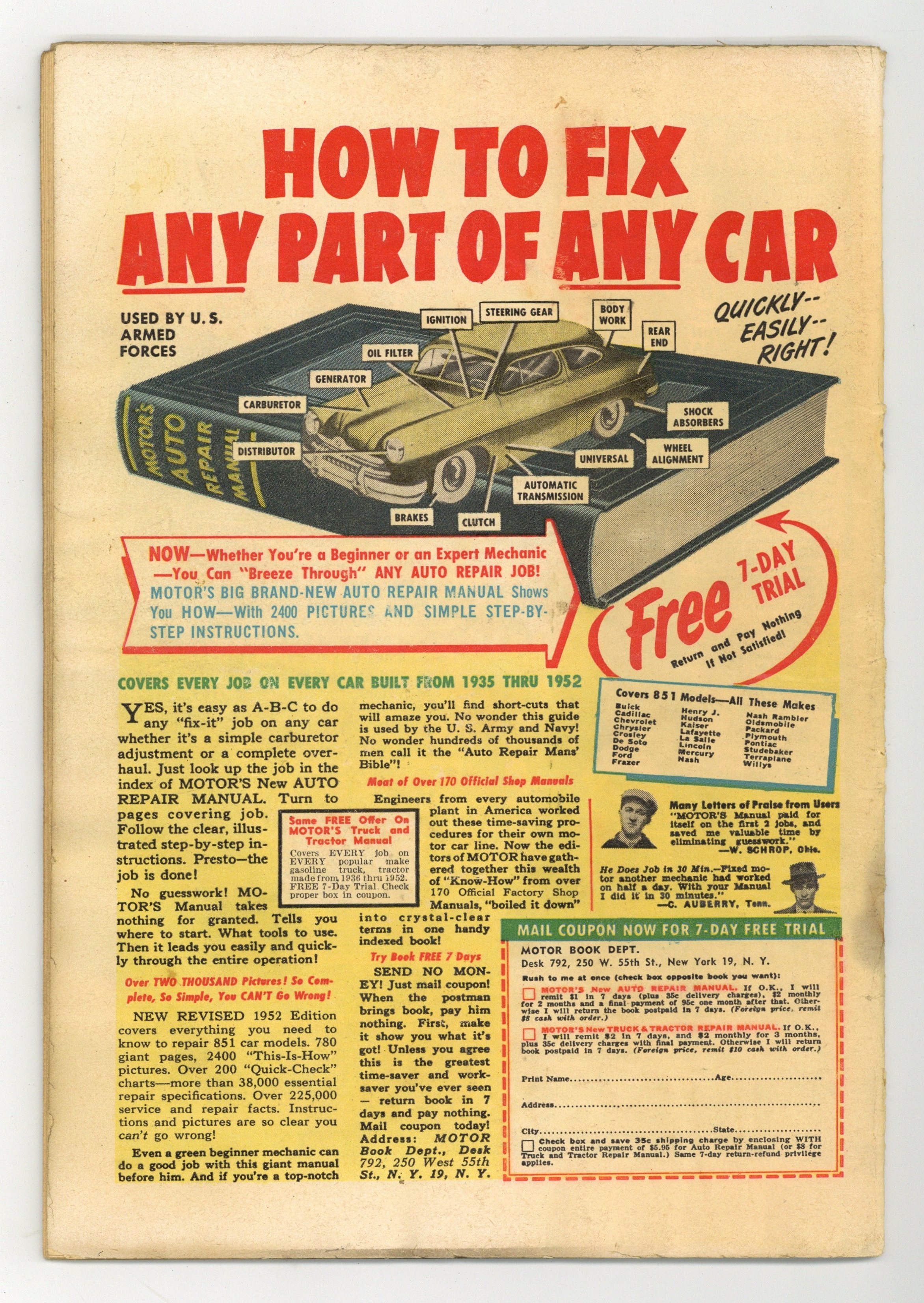 Cover by Johnny Craig. Ad for MAD magazine. "Split Personality!", script and art by Johnny Craig; Ed King was a racketeer trying to find a way to bilk the Blair sisters out of their millions. "Who Doughnut?", script by Al Feldstein, art by Jack Davis; Seven women had been murdered and the Police were baffled by the doughnut-shaped wounds all over their bodies, blood drained and traces of sea brine on their skin and clothing. "Refuge" text story. "Practical Choke!", script by Al Feldstein, art by George Evans; Three medical students play a series of practical jokes using actual human body parts and watching the reactions of various people. "Notes to You!", script by Bill Gaines (co-plot) and Albert B. Feldstein (co-plot, script), art by Graham Ingels (as Ghastly); Four different people receive to what amounts to anonomous poison-pen letters, each resulting in horrendous events surrounding their families or businesses. 36 pgs., full color. $0.10. Cover price $0.10.