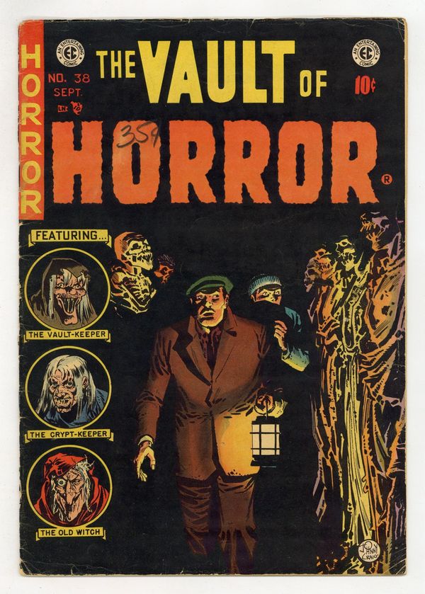 Cover by Johnny Craig. "Any Sport in a Storm," script by Carl Wessler, art by Johnny Craig; Lon made his way along the beach and past Smuggler's Caves as the stormy night raged on; He discovers that a story about a Sea Hag is true. "Coffin Spell!', script by Carl Wessler, art by Jack Davis; The two men finished digging up a corpse for Dr. Karolyi, but the man refused their efforts, so they went out to search for more bodies that the good doctor's students could use. "Pinch!" text story. E.C. Fan-Addict Club promo. "The Catacombs," script by Carl Wessler, art by Bernard Krigstein; Criminal Pietro plunges a knife into his greed partners back. "Out of Sight...", script by Carl Wessler, art by Graham Ingels; The circus barker encourages the crowd to pay to see the mental marvel of the age, the Great Brain, a man, once blindfolded, can identify any object being held up by his slow-witted partner, Benny. 36 pgs., full color. $0.10. Cover price $0.10.