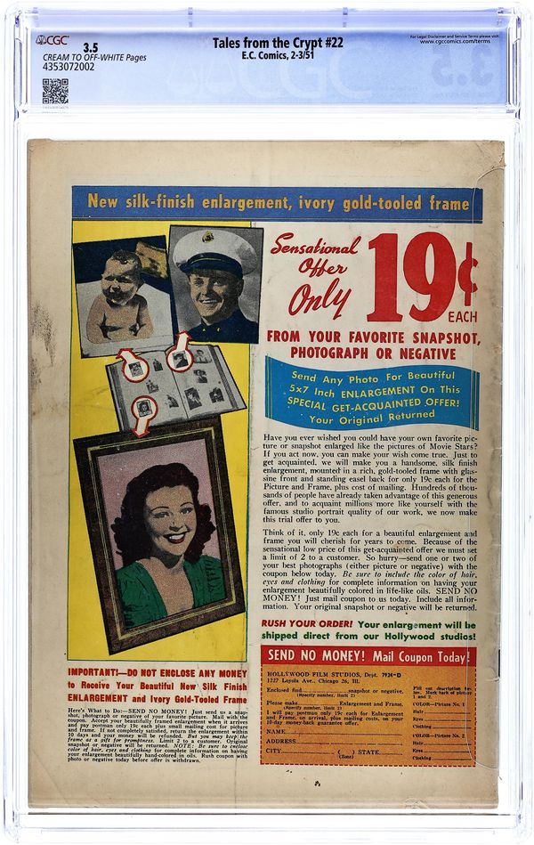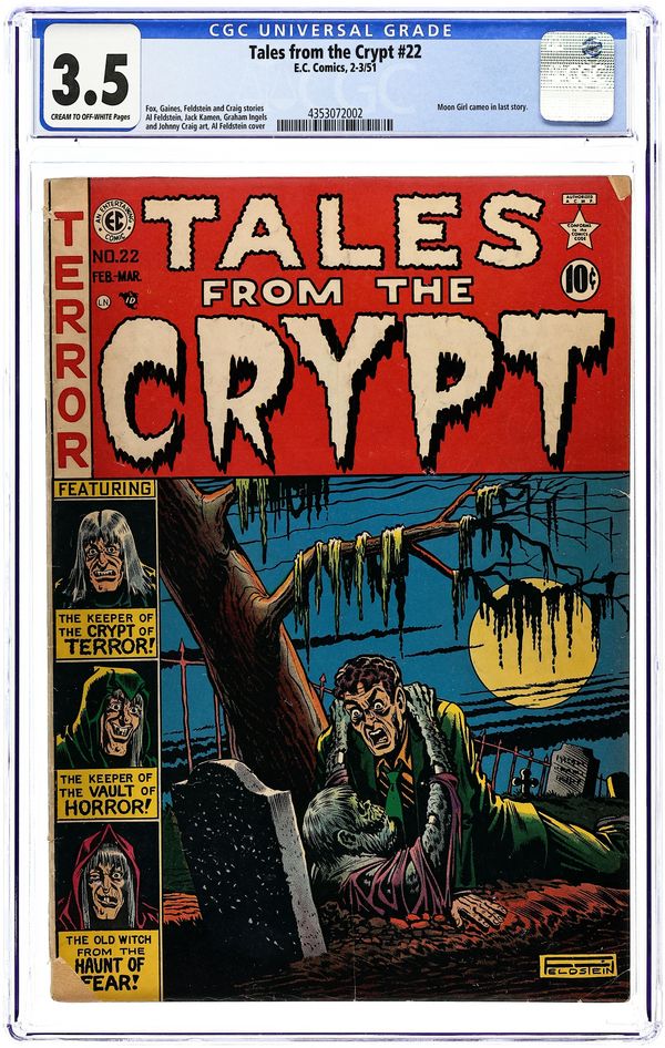 Cover by Al Feldstein. "The Thing From the Grave!", script and art by Al Feldstein; Bill and Jim are rivals for Laura's affection; After Jim proposes and Laura accepts, she worries about Bill's temper; Bill kills Jim and buries his body in the forest and disposes of his car in a sinkhole. "Blood Type 'V'!", script by Al Feldstein, art by Graham Ingels; An auto accident forces a man to seek help for his wife who has been knocked unconscious; When he returns with a doctor, the doctor is surprised to see she has suffered few cuts but nonetheless is nearly dead from massive blood loss. "The Way Out" text story. "Death's Turn!", script by Al Feldstein, art by Jack Kamen; Two unscrupulous amusement park owners offer a third partnership to a man who claims he has plans for the world's fastest roller coaster. "The Curse of the Arnold Clan!", script by Al Feldstein, art by Johnny Craig; A man finds a an old book in the attic which details a curse that stipulates every 50 years the eldest Arnold will be buried alive. 36 pgs., full color. $0.10. Cover price $0.10.