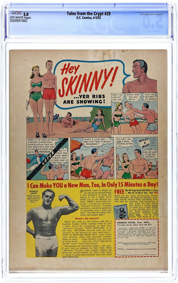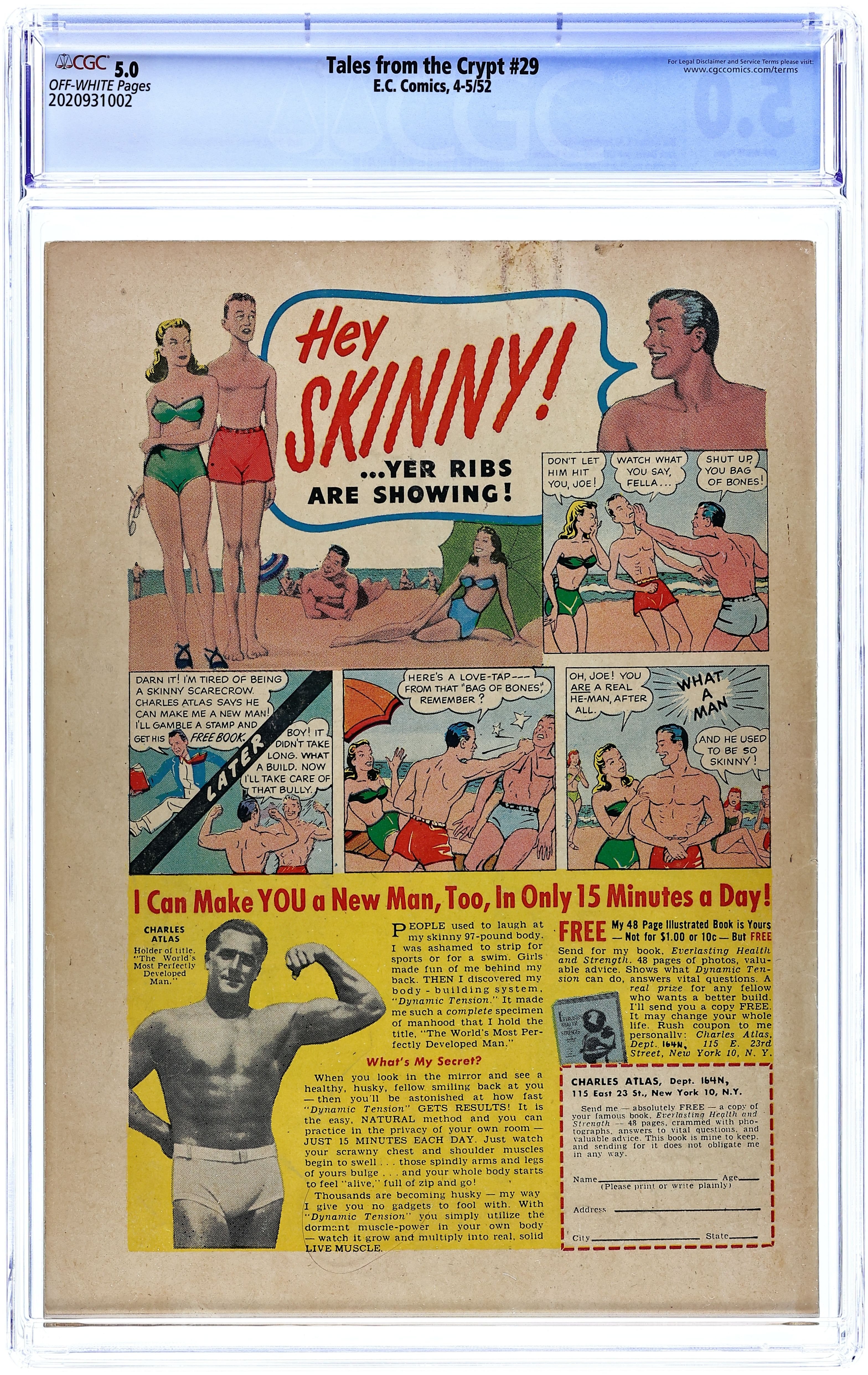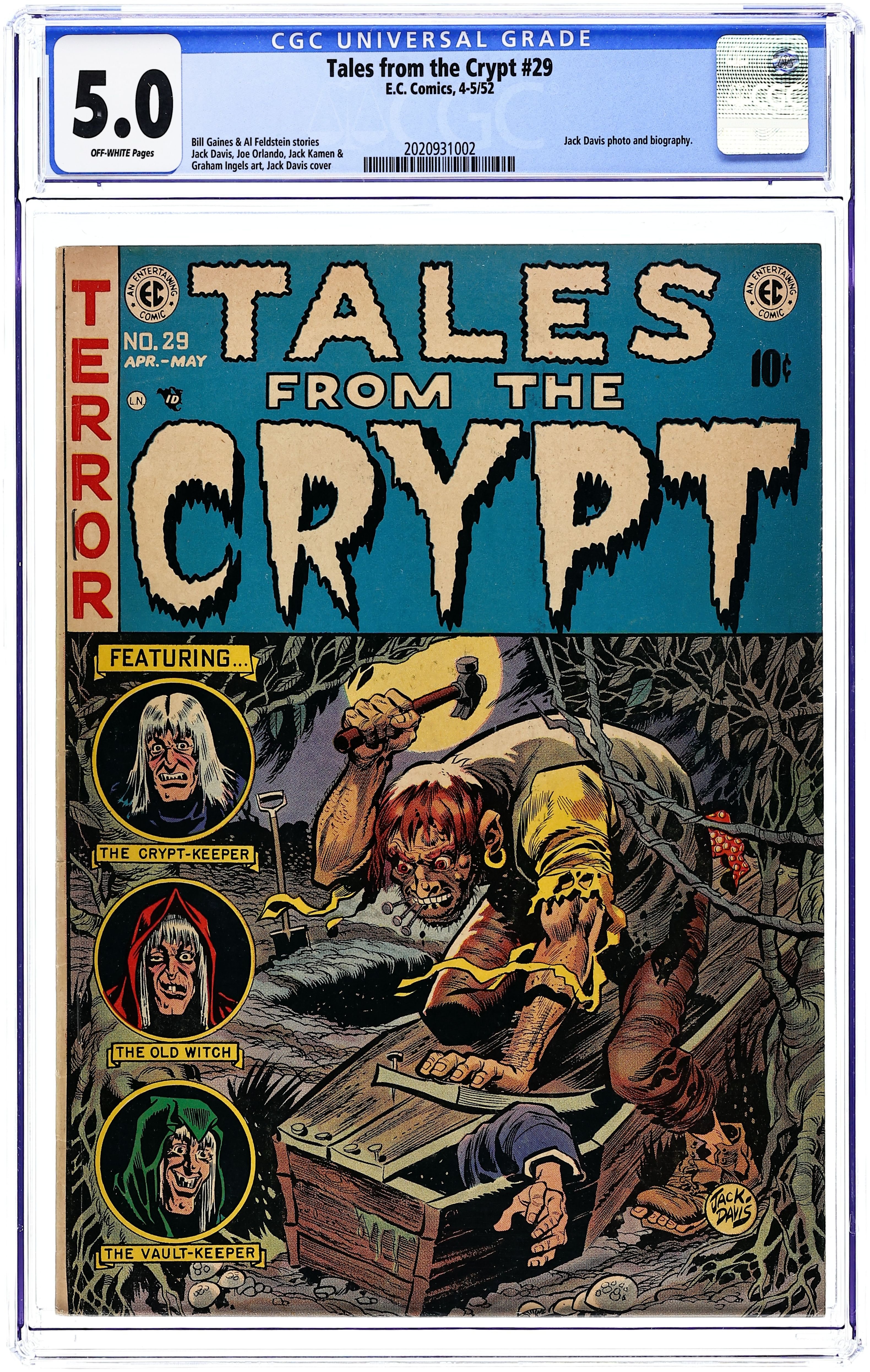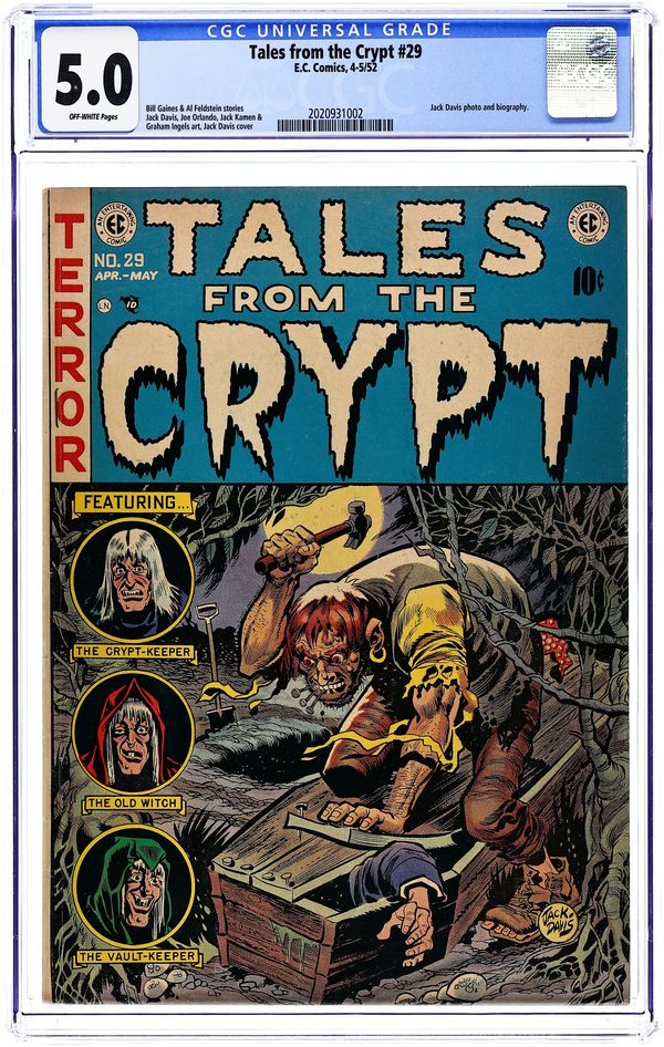 Cover by Jack Davis. EC Artist of the Month article about Jack Davis (with photo) by Al Feldstein. "Grounds...For Horror!", script by Al Feldstein, art by Jack Davis; A young boy's bullying butcher step-father locks him in the closet as punishment for various actions; At first, Artie is frightened, but meets a friend named Hozir who lives in the closet and wants to give the step-father what he deserves. "A Rottin' Trick!", script by Al Feldstein, art by Joe Orlando; A man uses a girl then dumps her and makes the mistake of seeking the help of a boat pilot to leave the country who used to love her before she killed herself. "Werewolf!" text story. "Board To Death!", script by Al Feldstein, art by Jack Kamen; A woman with a fear of enclosed spaces due to being trapped in a cave-in as a child is driven insane when her cruel husband repeatedly threatens to bury her alive. "A Sucker For a Spider!", script by Al Feldstein, art by Graham Ingels; An embezzling banker who keeps spiders for a hobby is blackmailed by his chief teller who is aware of the embezzlement. 36 pgs., full color. $0.10. Cover price $0.10.