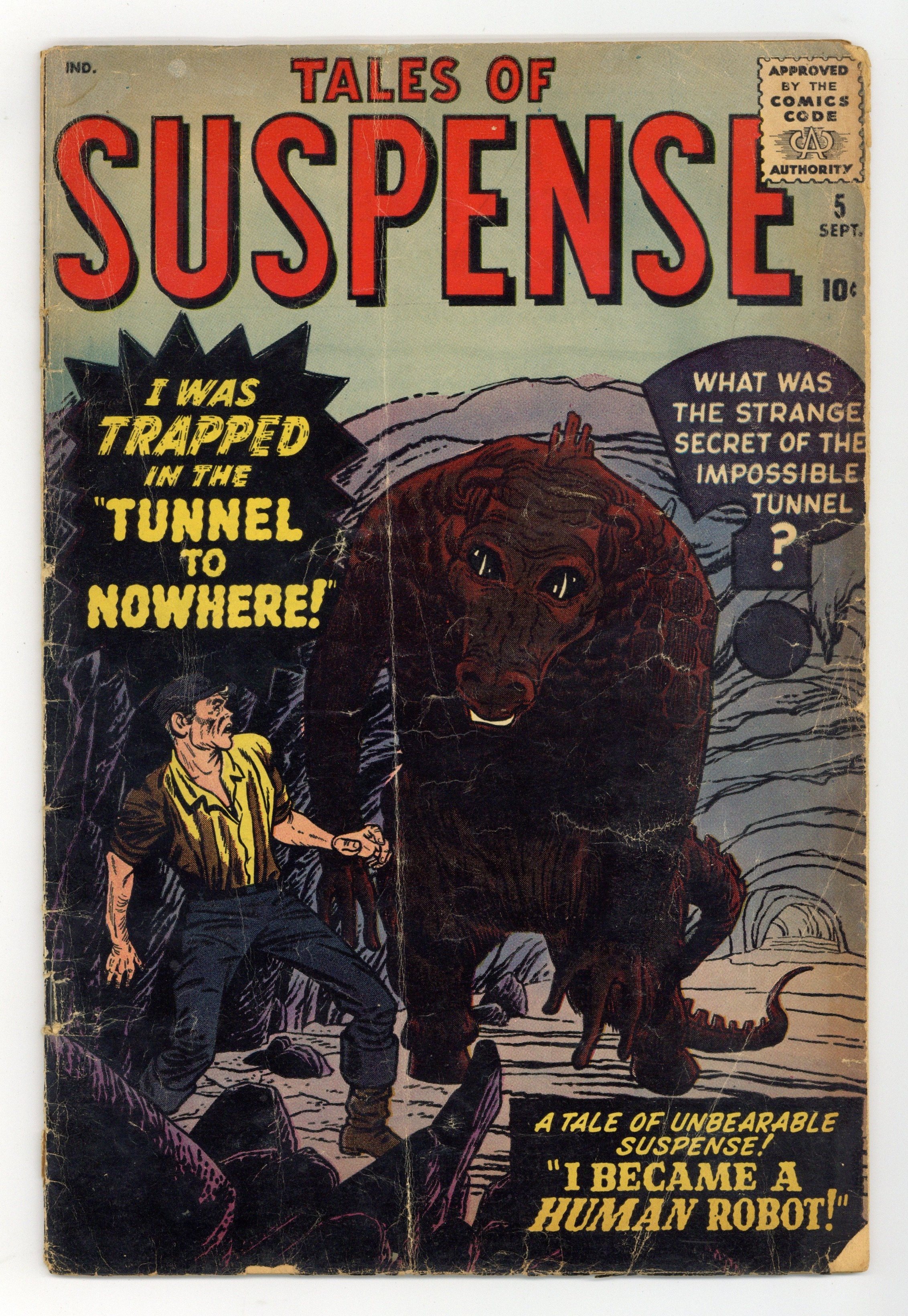 Cover pencils by Jack Kirby, inks by Chris Rule. "I Became a Human Robot!", art by Joe Sinnott; An alien spy places his mind in a robot sent to Earth, hoping to be taken in for study; He gains access to data on Earth technology, but the scientists turn his robot body off, trapping him. "The Masterpiece" text story. "I Fought the Tyrannosaurus," art by Steve Ditko; A couple vacationing in Africa find a dinosaur egg that hatches a live tyrannosaur; The dinosaur terrifies the villagers, but eventually dies in a landslide. "I Walk Thru Walls!", art by Paul Reinman; A criminal accidentally makes a teleporter and uses it to commit incredible burglaries, until a clever cop sets a trap for him. "I Traveled Thru Time!!", art by Carl Burgos; A foreign spy escapes capture by using a time machine to flee to the 18th century, but finds that he has assumed the identity of Benedict Arnold and will be executed in his place. "I Was Trapped in the Tunnel to Nowhere!", art by John Forte; An engineer attempts to build a tunnel from America to Europe but it is destroyed by inhuman creatures living in an undersea city. 36 pages, full color. Cover price $0.10.