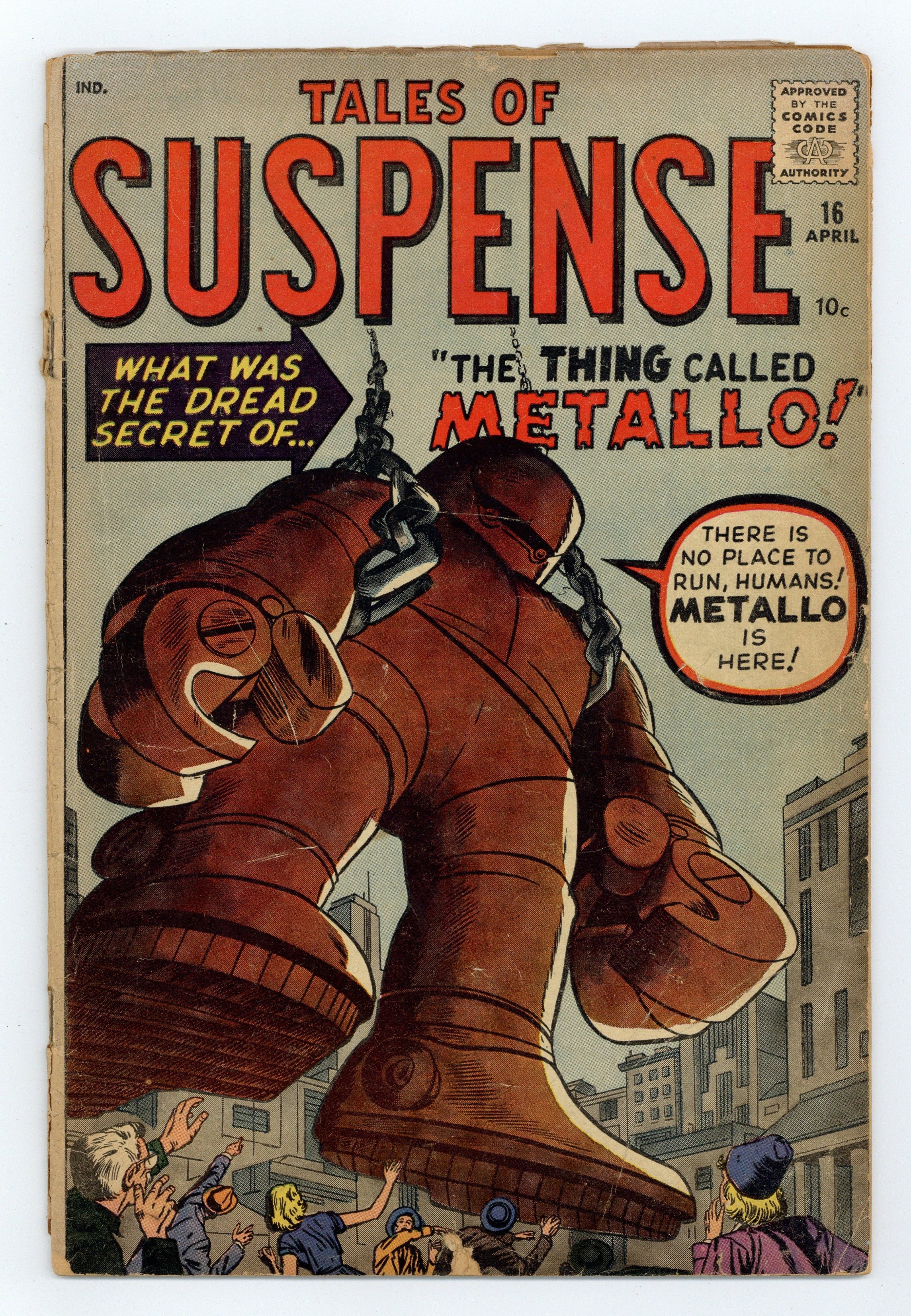 Cover pencils by Jack Kirby, inks by Dick Ayers. Iron Man prototype issue - first appearance of Metallo in "The Thing Called Metallo!", pencils by Jack Kirby, inks by Dick Ayers; An escaped convict tests a radiation-proof suit under a fake name; When he realizes the suits power, he uses it to go on a crime spree; When he finds that he has a disease only treatable by radiation he stays in the suit to die rather than be captured. "The Holiday" text story. "Nightmare!", art by Don Heck; A man scoffs at his friends idea that a nightmare could last forever, causing him to storm out, drive off the road and die; He wakes up having the same conversation, in a nightmare loop. "The Hands of Hogarr!", art by Paul Reinman; A fugitive forces a gypsy to give him a new face, but he is captured because it is the same face as his pursuer. 36 pages, full color. Cover price $0.10.
