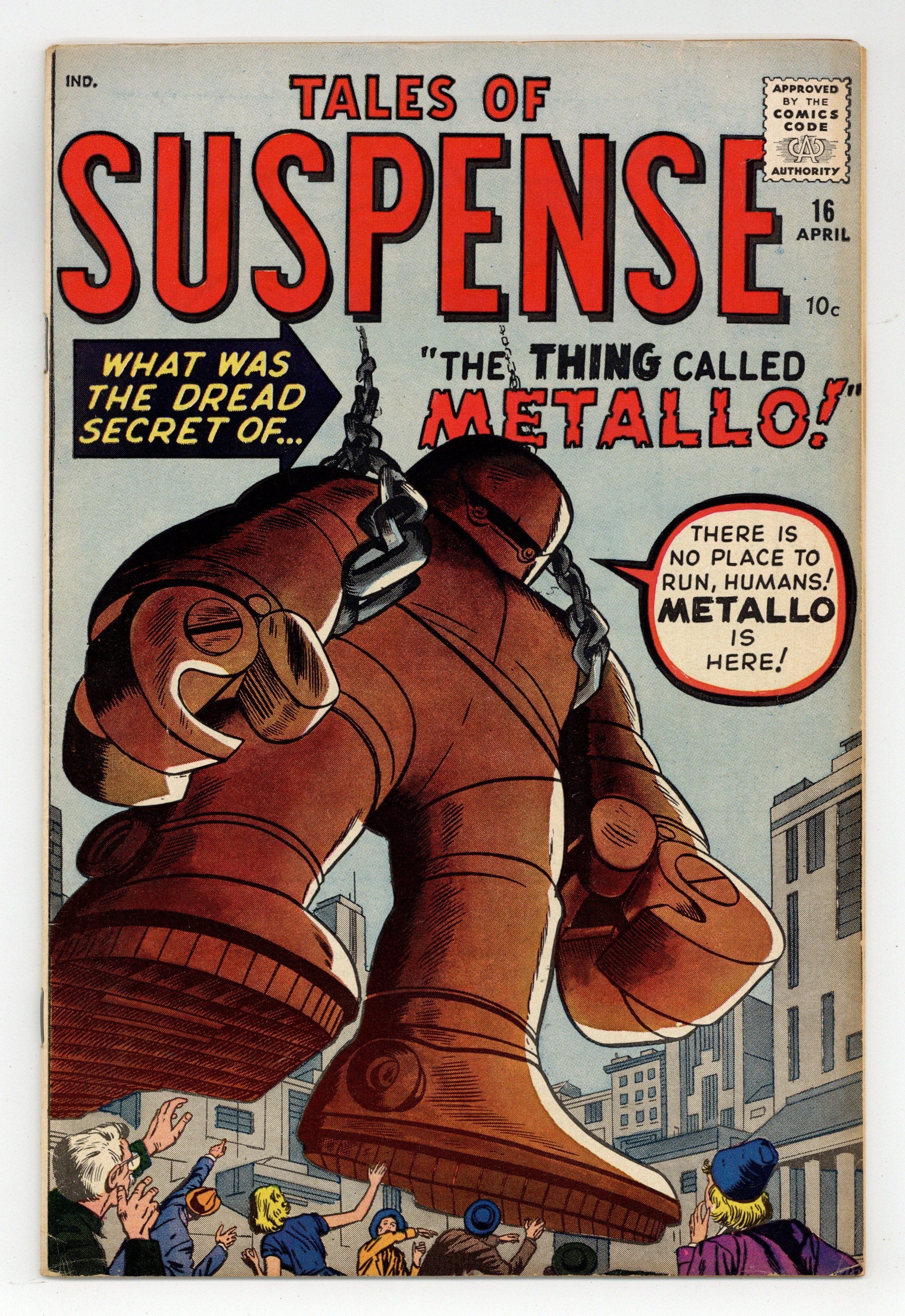 Ends Apr 15 8:17 PM CST Bid History 6 bids Current Bid $58 Your Secret Max Bid If you'd like to bid, please log in or register. Cover pencils by Jack Kirby, inks by Dick Ayers. Iron Man prototype issue - first appearance of Metallo in "The Thing Called Metallo!", pencils by Jack Kirby, inks by Dick Ayers; An escaped convict tests a radiation-proof suit under a fake name; When he realizes the suits power, he uses it to go on a crime spree; When he finds that he has a disease only treatable by radiation he stays in the suit to die rather than be captured. "The Holiday" text story. "Nightmare!", art by Don Heck; A man scoffs at his friends idea that a nightmare could last forever, causing him to storm out, drive off the road and die; He wakes up having the same conversation, in a nightmare loop. "The Hands of Hogarr!", art by Paul Reinman; A fugitive forces a gypsy to give him a new face, but he is captured because it is the same face as his pursuer. 36 pages, full color. Cover price $0.10.