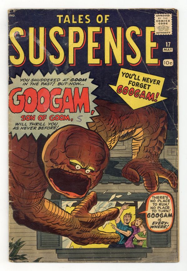 Cover pencils by Jack Kirby, inks by Dick Ayers. "Beware of Googam, Son of Goom!!", pencils by Jack Kirby, inks by Dick Ayers; Goom leaves an offspring in a cave to complete his conquest, and he comes across the family of the scientist who was responsible for his father's defeat; Googam is defeated when the scientist's son challenges him to a game of tag and runs off towards a pool of quicksand and then climbs a tree; When Googam sees the quicksand he mistakenly assumes that it is only mud since the boy must have run across it; Googam only sees the boy hiding in the tree as he sinks into the quicksand. "The Bridge" text story. "There Is Something Strange about Mister Jones!", art by Don Heck; A thug hears a man say that he has a fortune in his locker. He attacks him and tries to make him lead him there. His victim is Davy Jones, and he shows the thief his locker by drowning him. "What Lurks in the Mountain?", art by Steve Ditko; A communist general demands that the lama tell him of the alien space ship that has landed for repairs; At first the lama refuses to allow the aliens to be conquered by the communists, but he relents after the general threatens to execute all the peasants. 36 pgs., full color. $0.10. Cover price $0.10.
