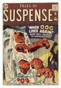 Cover pencils by Jack Kirby, inks by Dick Ayers. "Oog Lives Again!", pencils by Jack Kirby, inks by Dick Ayers; An alien trapped in ice is freed and mocks the fearful humans as it waits to be rescued - "Invade you? You have nothing we want! We should quarantine you!" "From Outer Space" text story. "On the Trail of the Witch!", pencils by Jack Kirby, inks by Dick Ayers; A witch is fearful of being pursued by a witch-hunter, but it turns out her fears are groundless as he is also a witch. "John Doe," pencils by Paul Reinman, inks by Joe Sinnott; An inventor creates a humanoid robot and treats it like a close friend; When the robot sacrifices itself to save him from a bear, his friends realize that the inventor is also a robot. "His Name Was... Merlin!", script by Stan Lee, art by Steve Ditko; An untalented magician who takes the name Merlin is visited by the spirit of the real Merlin in the form of a derelict and offers to teach him some tricks; When the man learns Merlin's last trick of completely disappearing, he stiffs Merlin his fee. 36 pgs., full color. $0.12. Cover price $0.12.