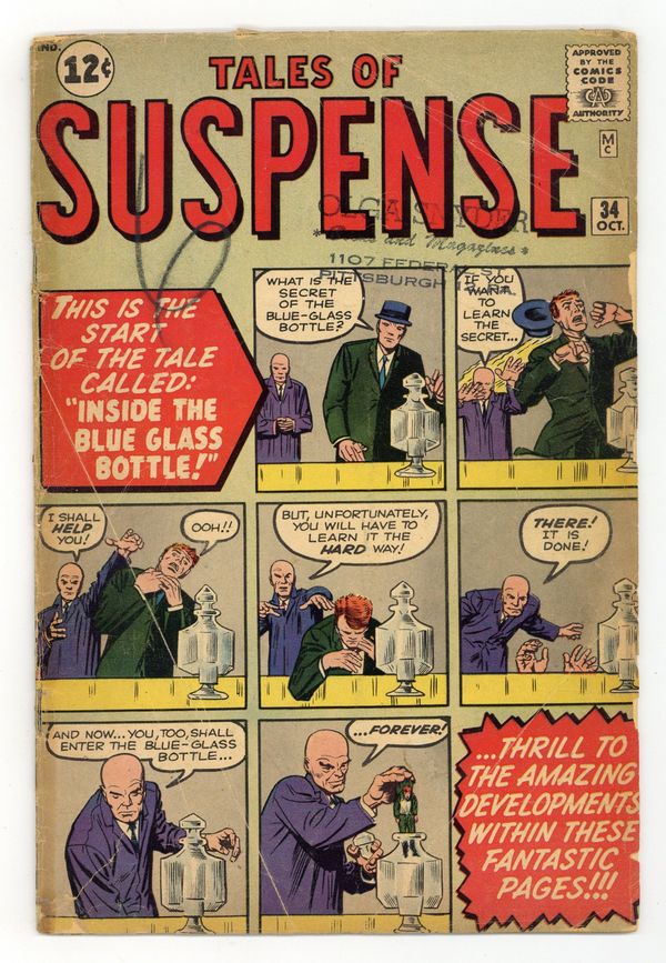 Cover pencils by Jack Kirby, inks by Steve Ditko. "I Found the Girl in the Blue Glass Bottle!", pencils by Jack Kirby, inks by Dick Ayers; A curio shop owner uses an ancient magic bottle to shrink people, but one of his victims turns the magic of the bottle on him and escapes, as the shop owner shrinks to nothing. "Tricky Travel" text story. "The Forbidden World!", pencils by Jack Kirby, inks by Dick Ayers; A space patrol find an alien world surrounded by a strange mist. "The Coming of the Giants!", art by Don Heck; The humanity of the near future grow proud as they approach space travel, but when alien giants arrive they are only saved from conquest because they are too tiny to notice. "Who Am I?", script by Stan Lee, art by Steve Ditko; A man finds himself lost in a fog with no idea who he is; He is approached by a stranger who offers to help him through hypnosis; The hypnosis recovers his lost memory and he realizes that he was a circus performer who has died from a fall from the high wire. 36 pgs., full color. $0.12. Cover price $0.12.