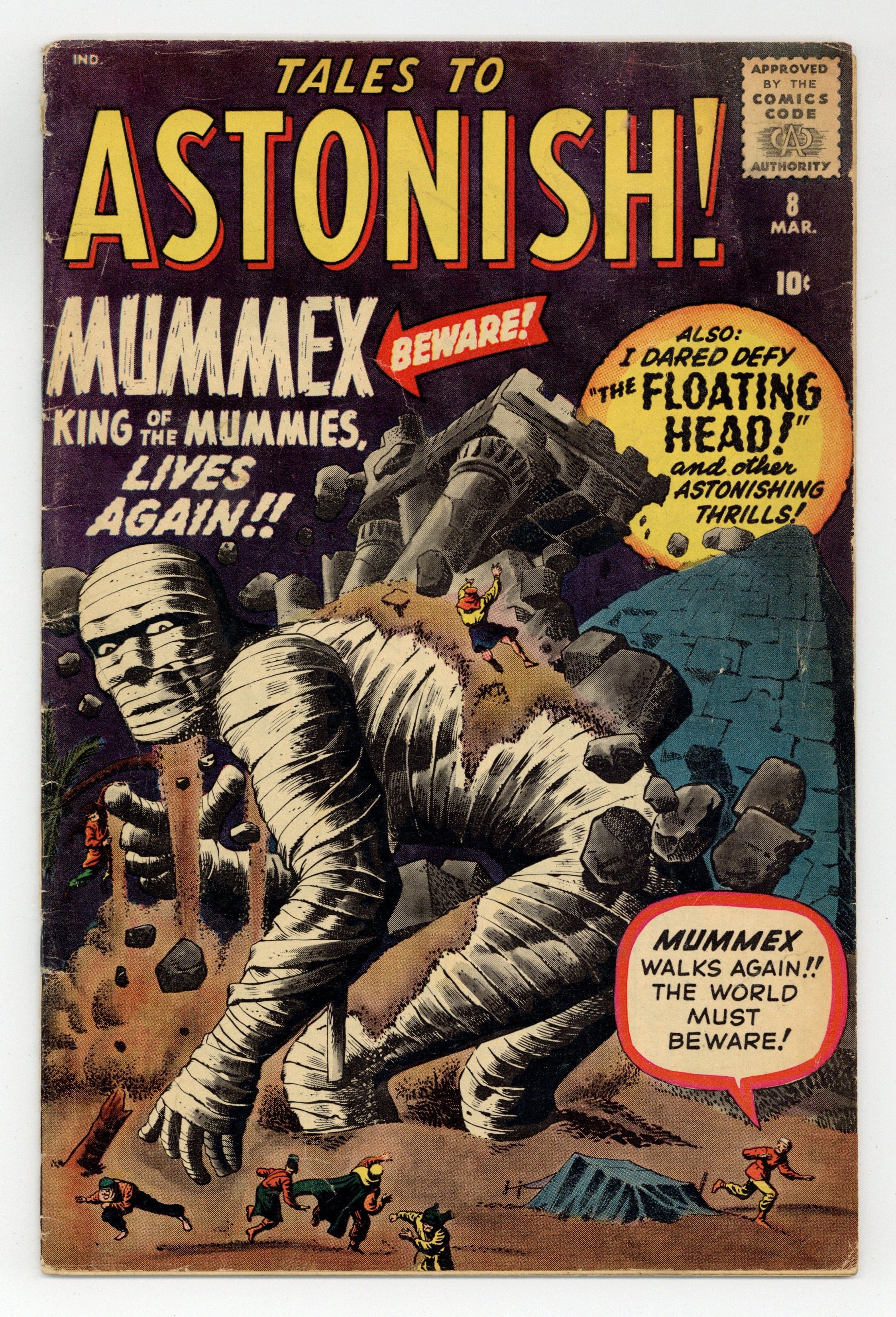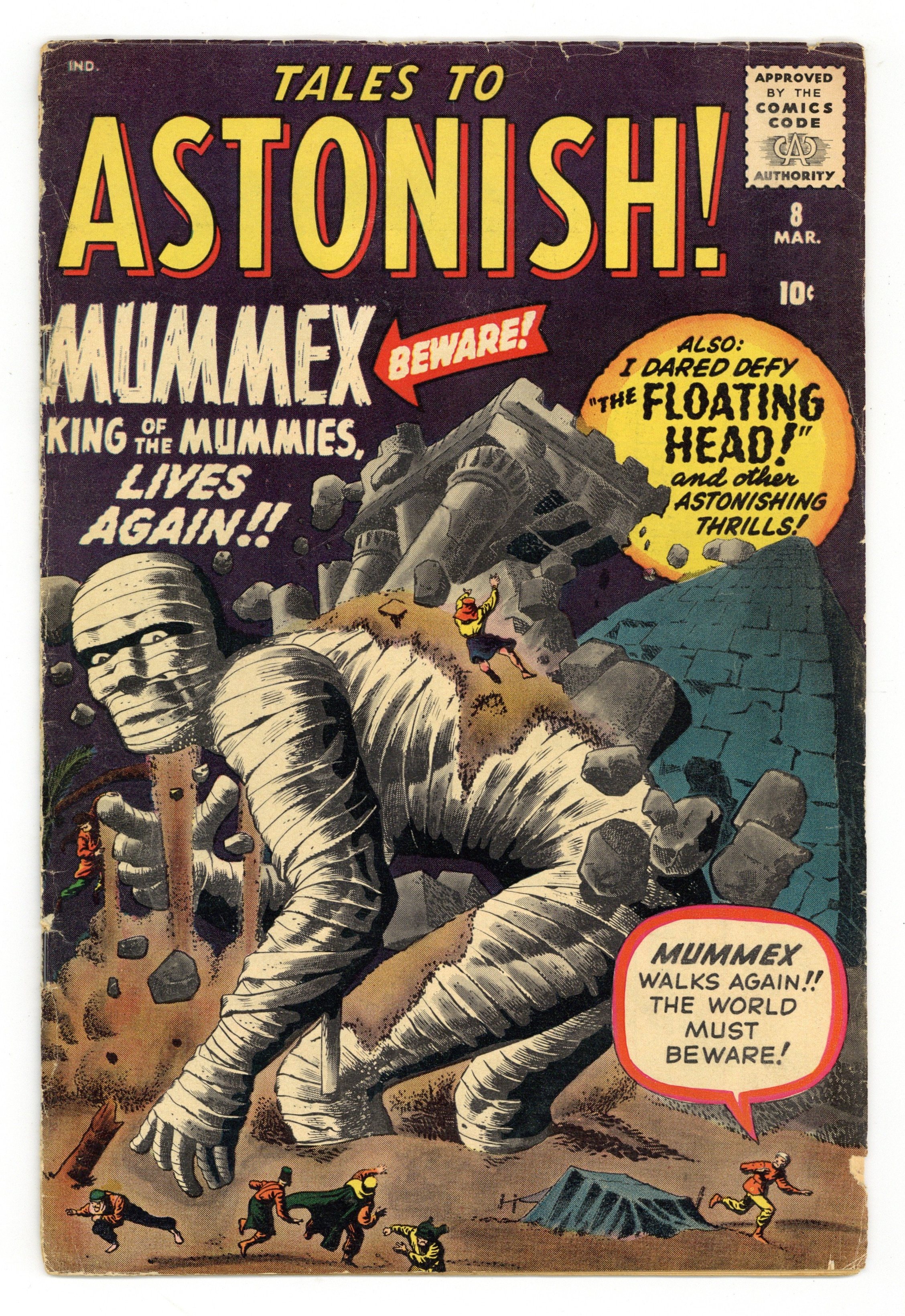 Cover by Jack Kirby and Steve Ditko. I Dared Defy the Floating Head!, art by Paul Reinman; A giant floating head appears over New York, claiming that it is the advance scout of an alien invasion, and ordering everyone to evacuate. I Live Again!, art by Steve Ditko; The animated statue rises up from where it fell in the last story and decides to go to America so that it can conquer the world. New Glasses text story. I–Am–The–Genie!, art by Jack Kirby and Steve Ditko; A criminal finds a genie and uses it to wreak havoc, but when he goes too far he takes the genies place in the bottle. Mummex---King of the Mummies!, art by Don Heck; An archaeologist finds a giant mummy in the Egyptian desert; It rises and searches the tombs and museums of the area, examining several mummies before returning into the desert. 36 pgs., full color. $0.10. Cover price $0.10.