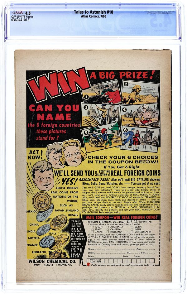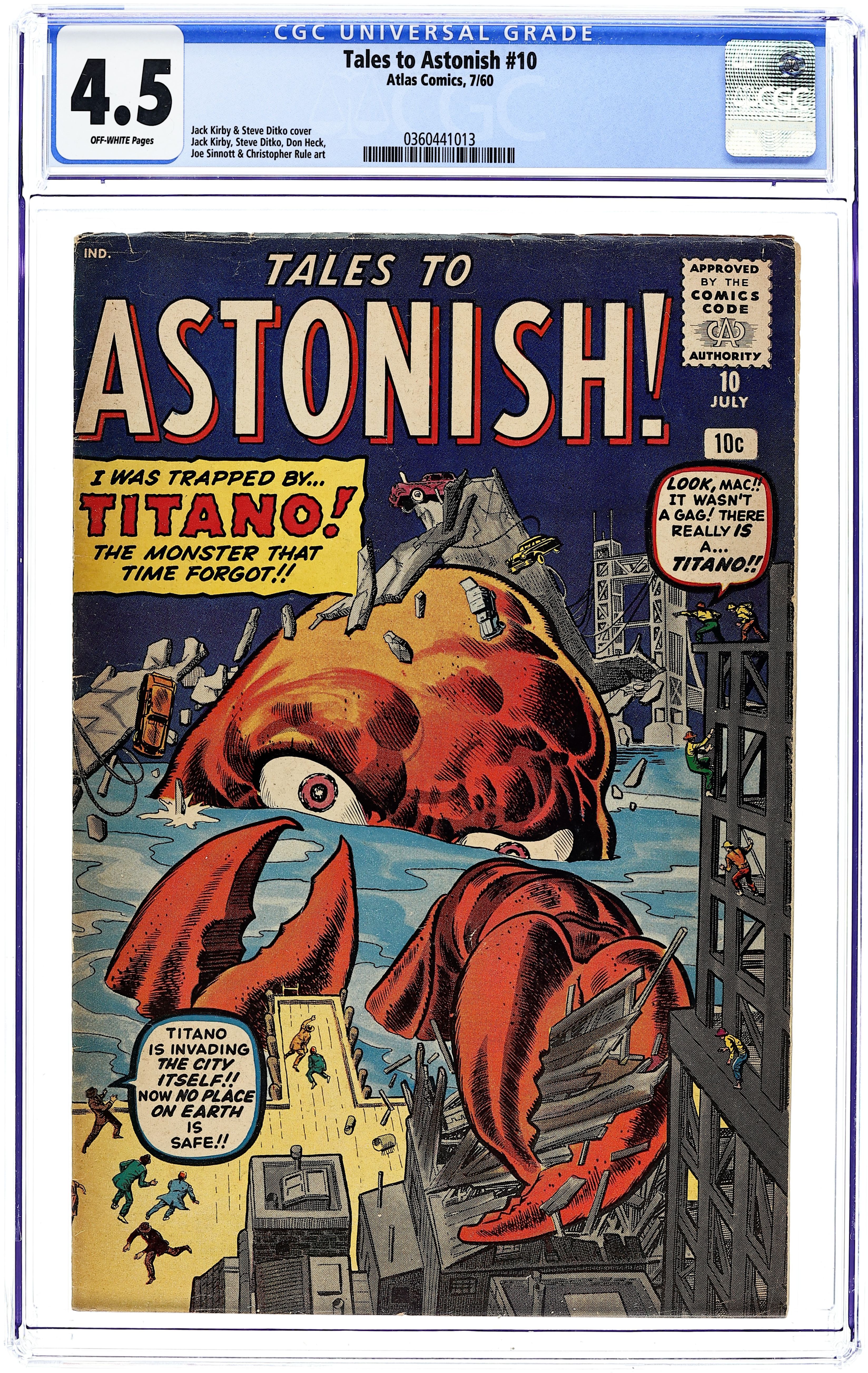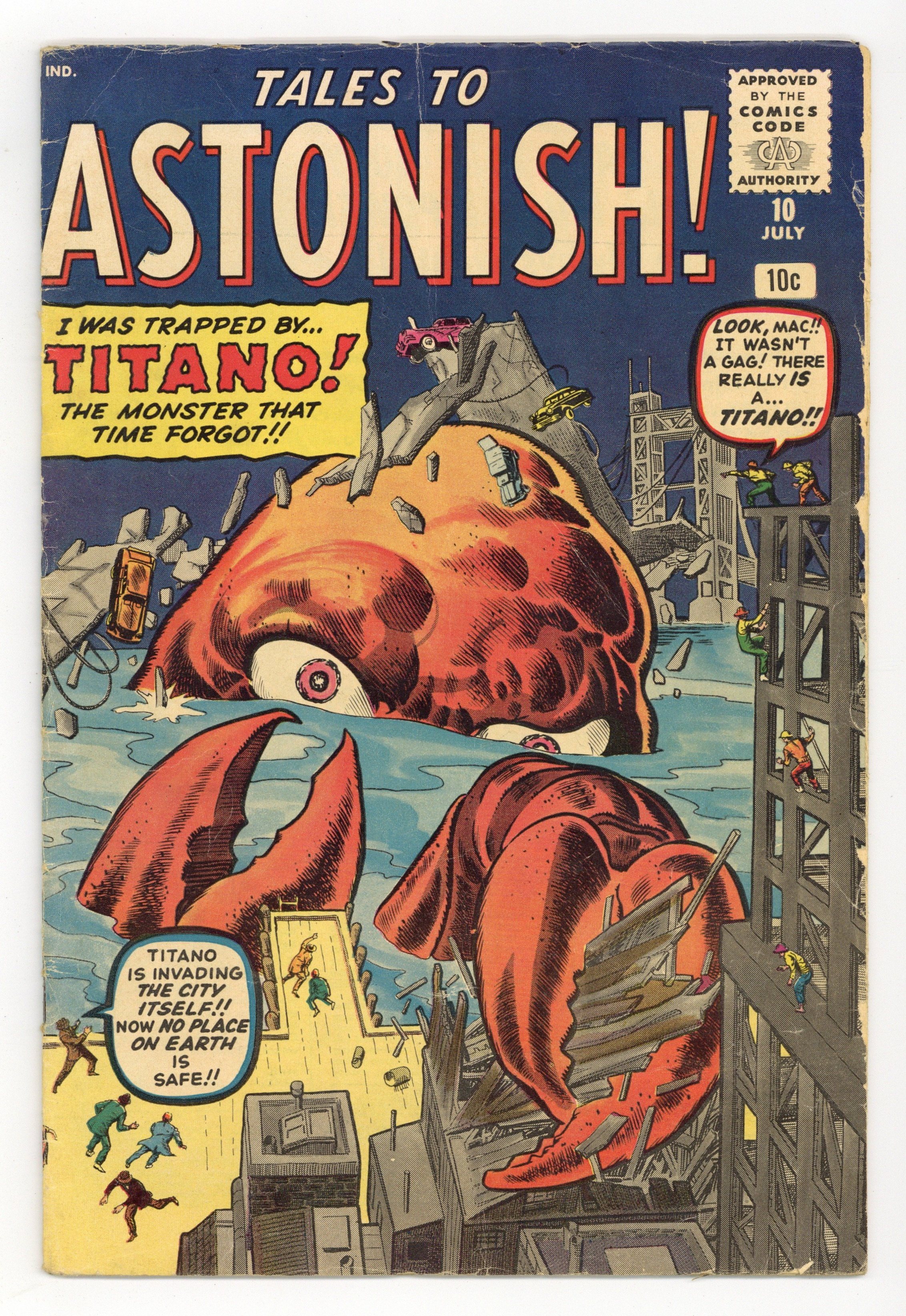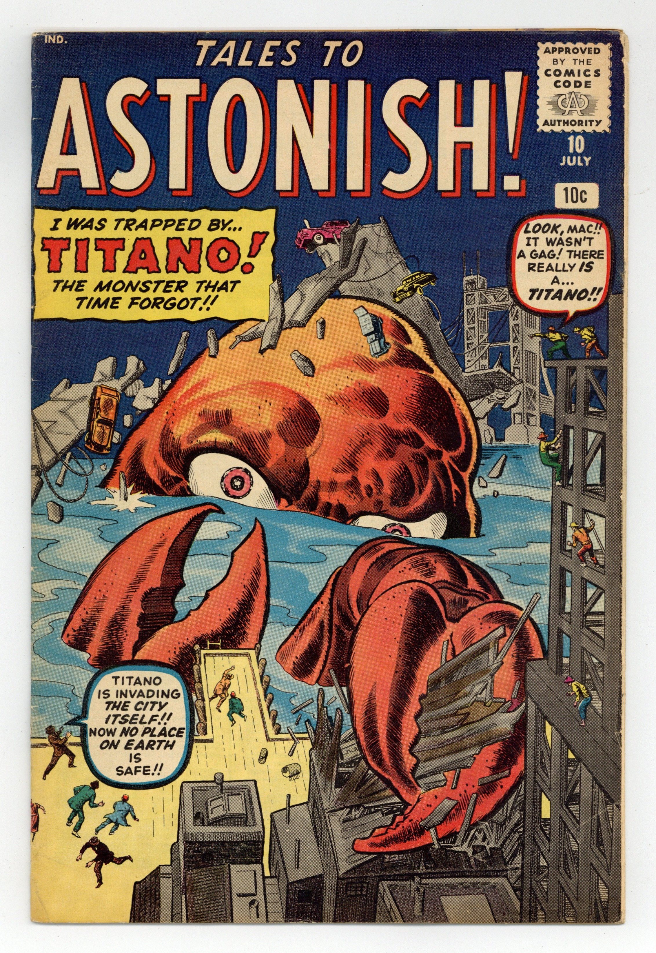 Cover art by Jack Kirby and Steve Ditko. I Was Trapped By Titano the Monster That Time Forgot!, art by Jack Kirby and Joe Sinnott; A gigantic, mutant crab is sighted terrorizing various islands in the South Pacific. The Flying Saucer That Was text story. Only I Know When the World Will End!!!, art by Don Heck; A derelict claims to be from another world and says that another planet will collide with Earth within days, but he is believed mad. Something Lurks Inside!, art by Steve Ditko; A space explorer cannot rid his ship of vicious alien spiders, and is forced to sacrifice himself to save Earth. What Was the Strange Power of Simon Drudd!!, art by Jack Kirby and Christopher Rule; A scientist selfishly uses a youth serum to gain an advantage over other people, but the serum ages him backwards into non-existance. 36 pgs., full color. $0.10. Cover price $0.10.