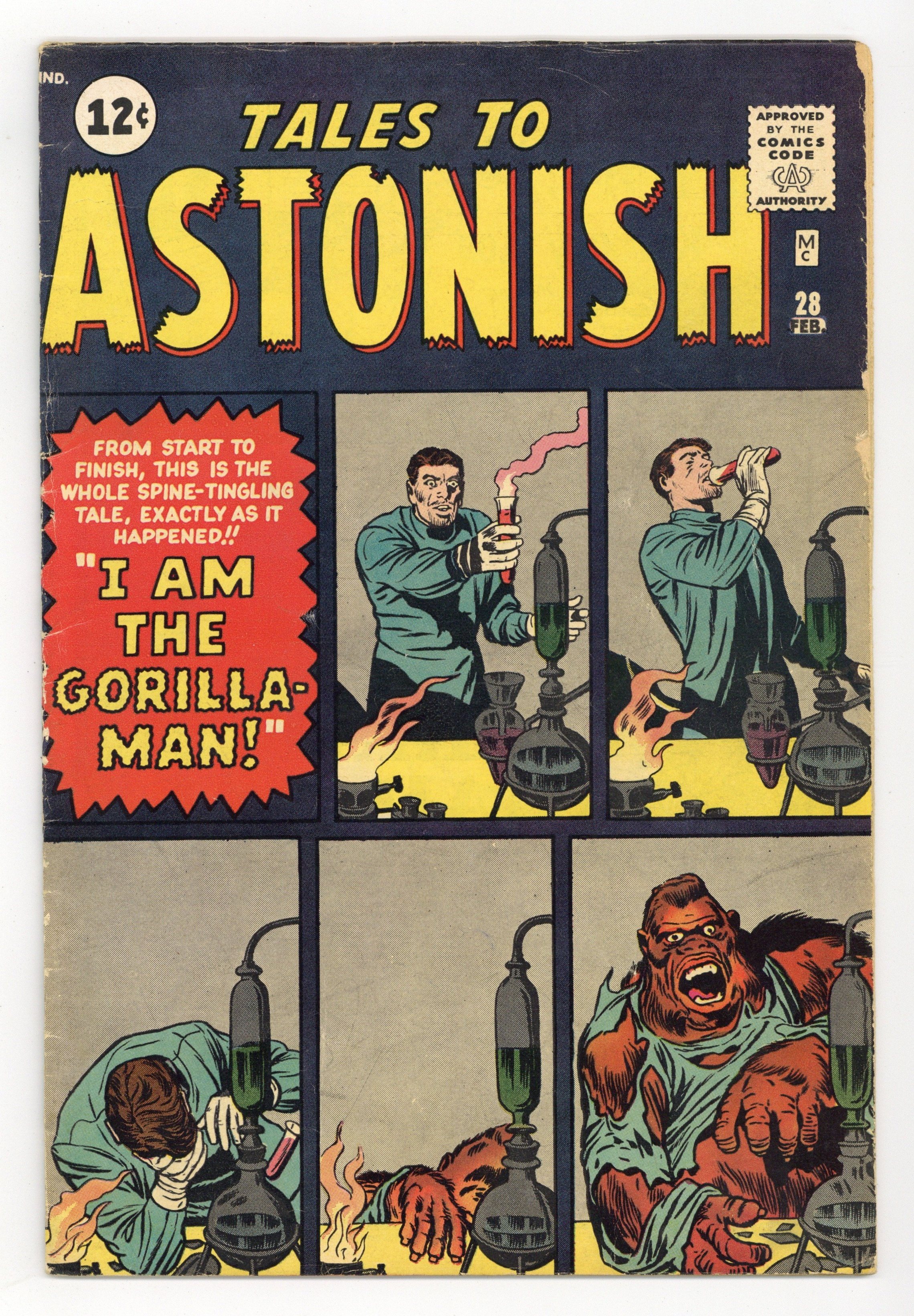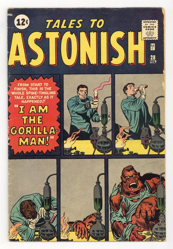 Cover by Jack Kirby and Dick Ayers. I Am the... Gorilla-Man, script by Stan Lee and Larry Liebery, art by Jack Kirby and Dick Ayers; An inventor transfers his mind into a gorilla to commit crimes, but the gorilla controlling his body turns against him. The Green Hat text story. Midnight on Haunted Hill, script and art by Stan Lee and Larry Lieber, art by Jack Kirby and Dick Ayers; A boy sees an alien landing, but no one believes him until the spaceship comes back. The Scheme!, art by Gene Colan; An insolvent cad marries a rich widow dying of a terminal sickness for her money, but finds when she dies that the disease is contagious and he has only months to live. The Frightening Fog, art by Steve Ditko; A mysterious fog envelops the entire world for days, terrifying everyone. 36 pgs., full color. $0.12. Cover price $0.12.