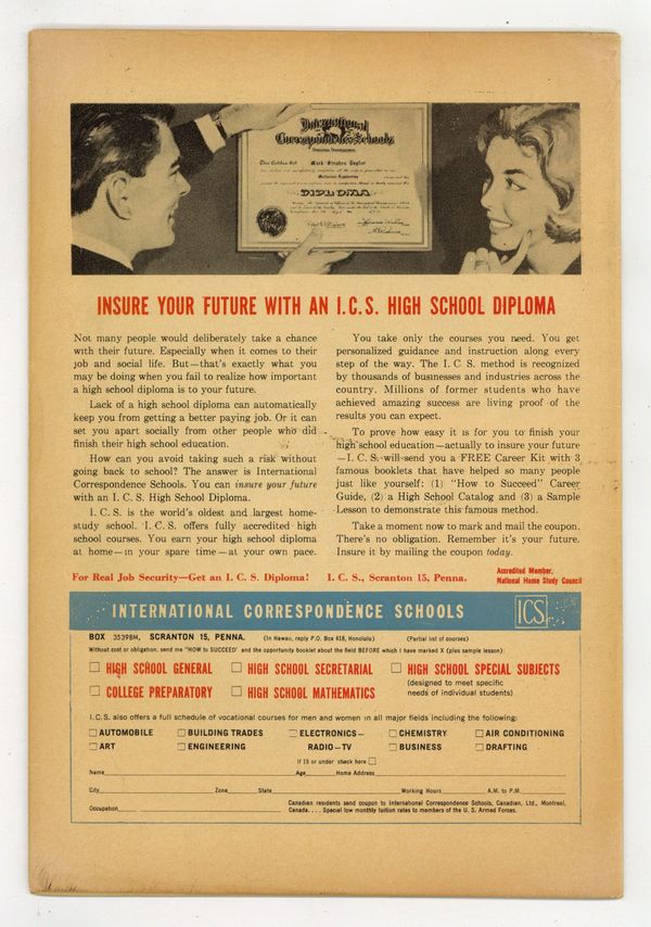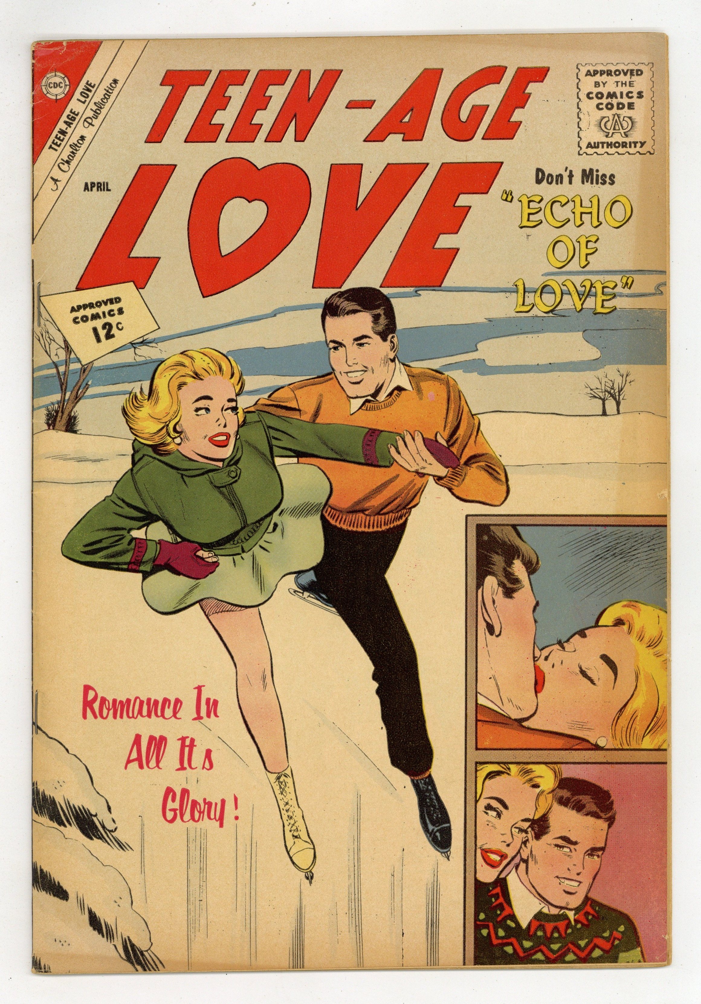 Published 1962 by Charlton Comics Group.$30.00Cover by Dick Giordano. Stories and art by Joe Sinnott, Charles Nicholas, Dick Giordano, and Vince Colletta. Charlton's long-running romance comic coincides with the blossoming of America's teen culture from the 1950s to the 1970s. Dorothy's childhood sweetheart Tony returns as a "tough" who intimidates her potential suitors, in a story with art by future Fantastic Four legend Joe Sinnott. Rhoda falls for older Ben, but her parents disapprove of their relationship. Steffi falls for Doug, her attractive, indifferent ice-skating coach, but her brother thinks she should go out with Al, who really loves her. An Enduring Love; Judy Loves Eddie; My Heart Cried; Tough Tony's Girl; Handle With Care; Jeannie Finds a Husband; Brothers Know a Thing or Two. 32 pages, Full Color. Cover price $0.10.