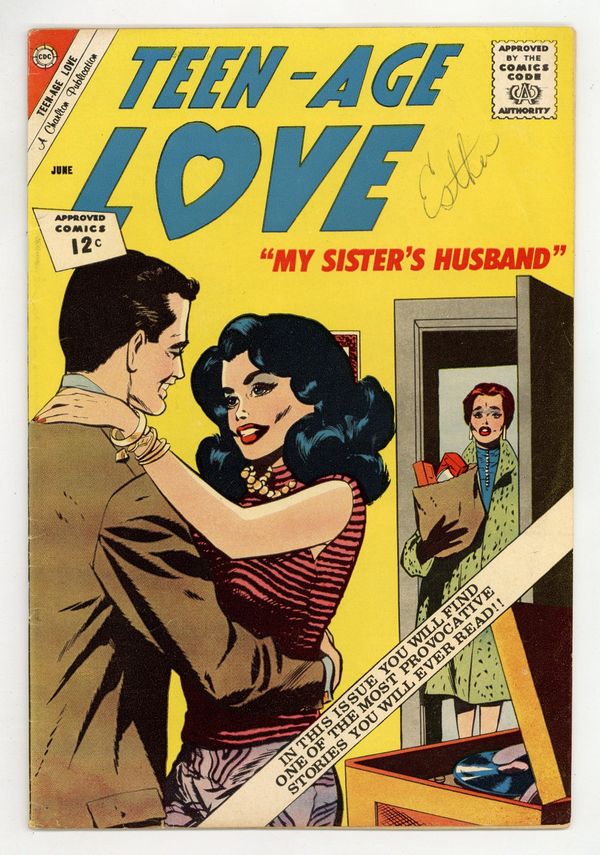 Published 1962 by Charlton Comics Group.$41.00Cover by Joe Sinnott and Vince Colletta. Stories and art by Joe Sinnott and Vince Colletta. Charlton's long-running romance comic coincides with the blossoming of America's teen culture from the 1950s to the 1970s. Gina is shocked when she catches her husband dancing with her beautiful, flirty sister Dora, in a story with art (and cover) by future Fantastic Four legend Joe Sinnott. Backwoods beauty Lucille Anne wins a beauty contest and is courted by wealthy Jim, but it's country boy Lonnie who truly loves her. Redheaded Denise is used to getting attention for her beauty, but she doesn't understand why football star Chet treats her coldly. Queen of Heartbreak; Adulation; The Biggest Favor; My Sister's Husband. 32 pages, Full Color. Cover price $0.12.