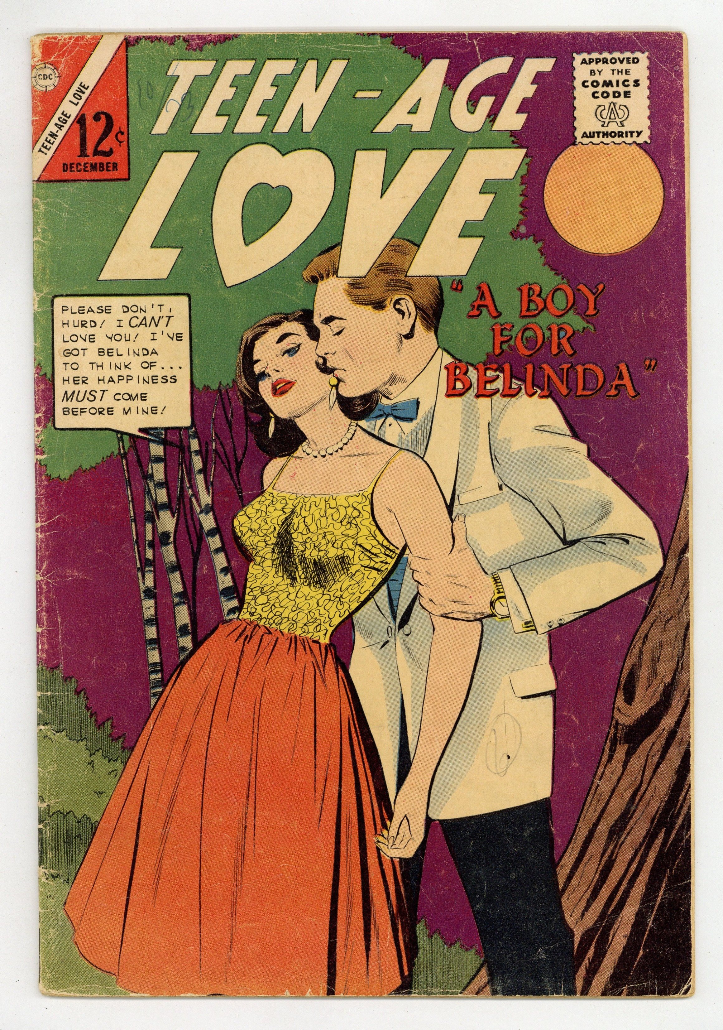 Published 1963 by Charlton Comics Group.$30.00Cover by Dick Giordano. Stories and art by Bill Fraccio, Tony Tallarico, Owen McCarron and Vince Colletta. Charlton's long-running romance comic coincides with the blossoming of America's teen culture from the 1950s to the 1970s. Hurd falls for Ginnie, but her intention was to set him up with her lonely sister, Belinda. Redheaded country girl Ellie agrees to pose for older artist David, but he sees her in a different light when he realizes she's 20 years old. Ruthie, who has an Elvira haircut, starts hanging out with Mikey and his band of juvenile delinquents, causing heartache for her parents. A Boy for Belinda; Love Opened Doors; Martha Marsden Meditates; Growing Up; Waiting for Love. 32 pages, Full Color. Cover price $0.12.