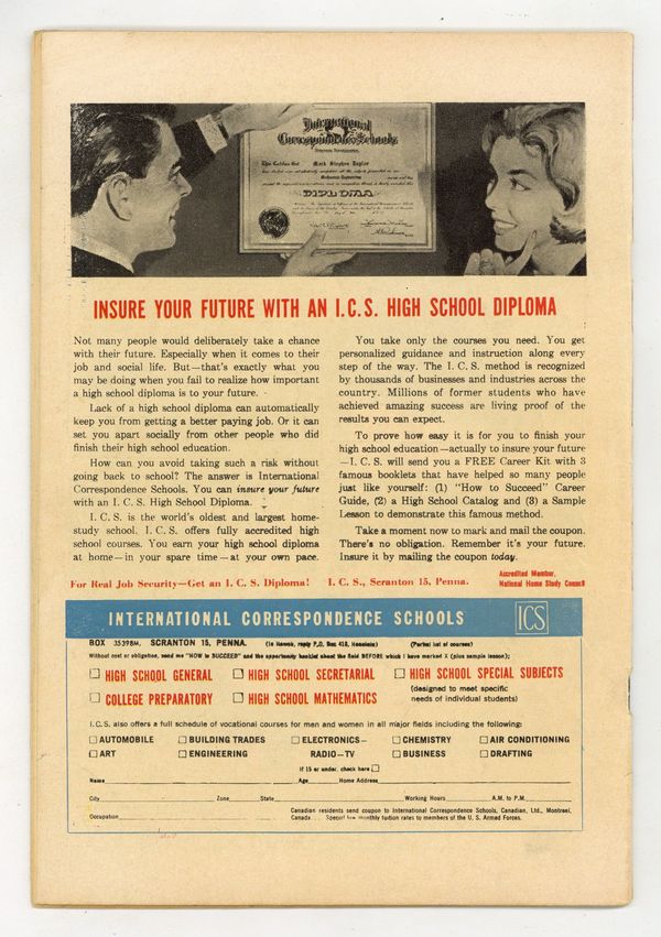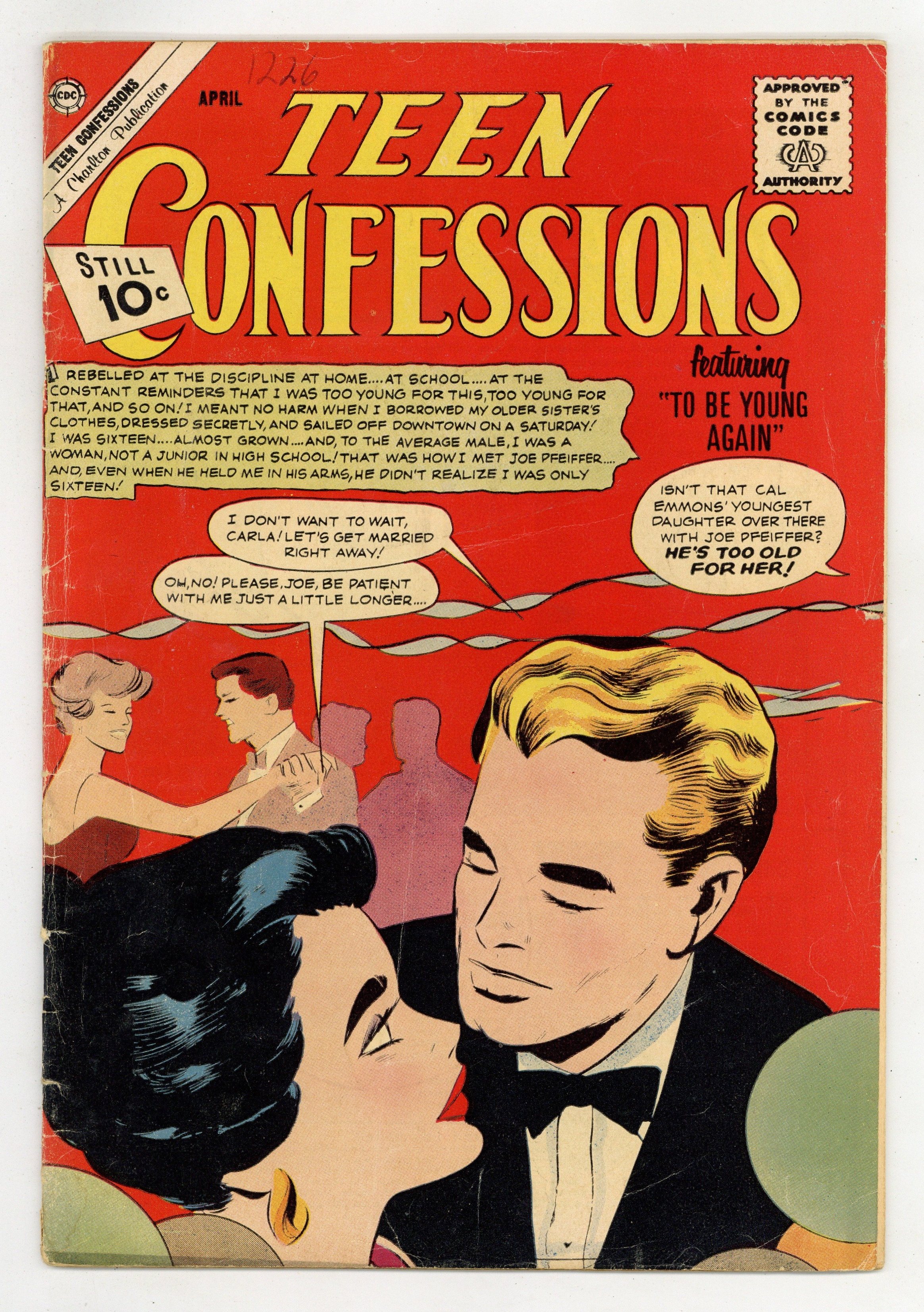 Last 10c cover-priced issue. Cover inks by Vince Colletta. Stories by unknown. Art by Joe Sinnott, Vince Colletta, Charles Nicholas, Vince Alascia and unknown. Carla rebelled at the discipline at home...at school...at the constant reminders that she was too young for this, too young for that, and so on! She meant no harm when she borrowed her older sister's clothes, dressed secretly, and sailed off downtown on a Saturday! She was sixteen...almost grown...and to the average male she was a woman, not a junior in high school! That was how she met Joe, and even when he held her in his arms, he didn't realize she was only sixteen! Read..."To Be Young Again!" with inks by Vince Colletta. Also in this issue: "- Or for Worse" with art by Joe Sinnott and Colletta; "Can Love Survive?" with art by Sinnott and Colletta; "Love Dropped In" with art by Charles Nicholas and Vince Alascia; and 2-page text story "Yes or No?" 32 pages, full color. Cover price $0.10.