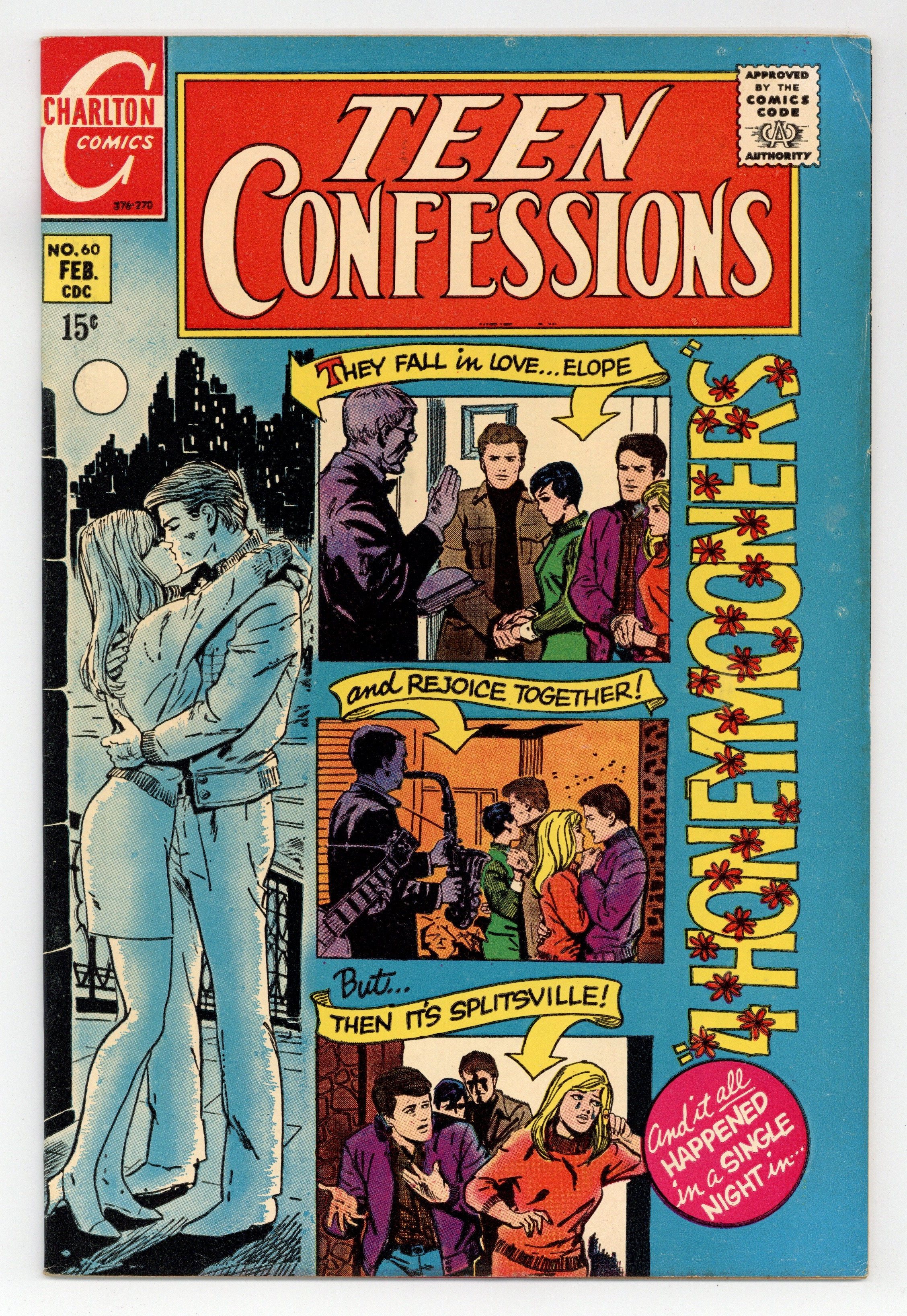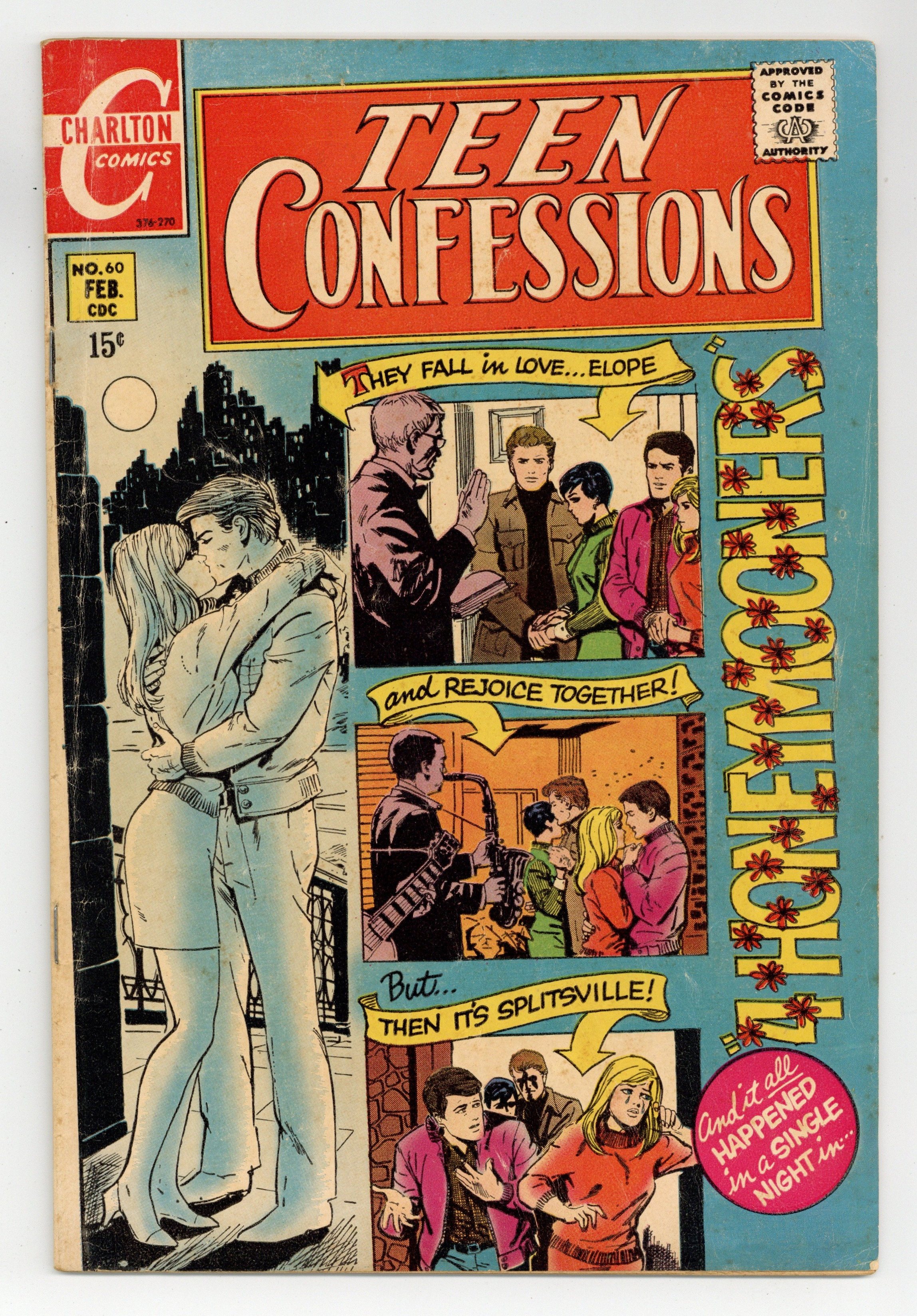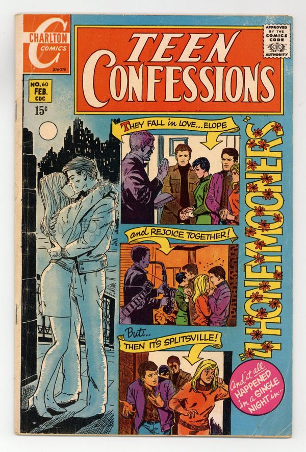 Published Feb 1970 by Charlton Comics Group.$40.00Stories by unknown. Art by Charles Nicholas, Vince Alascia and unknown. They fall in love...elope...and rejoice together! But then it's splitsville! And it all happened in a single night in "Four Honeymooners"! Also in this issue: "Let My Heart Make Its Own Mistakes" with art by Charles Nicholas and Vince Alascia; "Engagement Party"; "No Second Chance" with art by Nicholas and Alascia; and Teen-Age Troubles advice 1-pager by Dr. Harold Gluck. 32 pages, full color. Cover price $0.15.