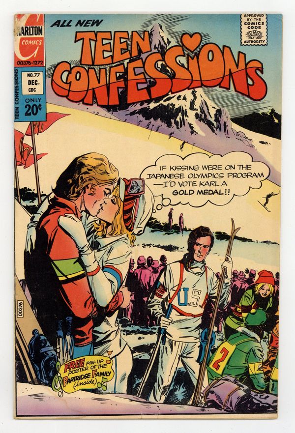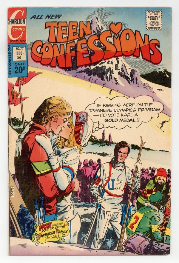 Published Dec 1972 by Charlton Comics Group.$17.75Cover by A. Martinez and Jean Elier. Stories by unknown. Art by A. Martinez, Charles Nicholas, Jean Elier and Vince Alascia. If kissing were on the Japanese Olympics program, she'd vote Karl a gold medal! Read..."Fun and Games Time" with art by A. Martinez and Jean Elier. Also in this issue: "The Beautiful Man-Trap!" with art by Martinez and Elier; "Take One Giant Step" with art by Charles Nicholas and Vince Alascia; Teen-Age Troubles advice 1-pager by Dr. Harold Gluck; and a pin-up of the Partridge Family by Don Sherwood. 32 pages, full color. Cover price $0.20.